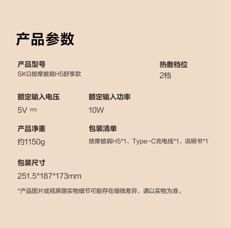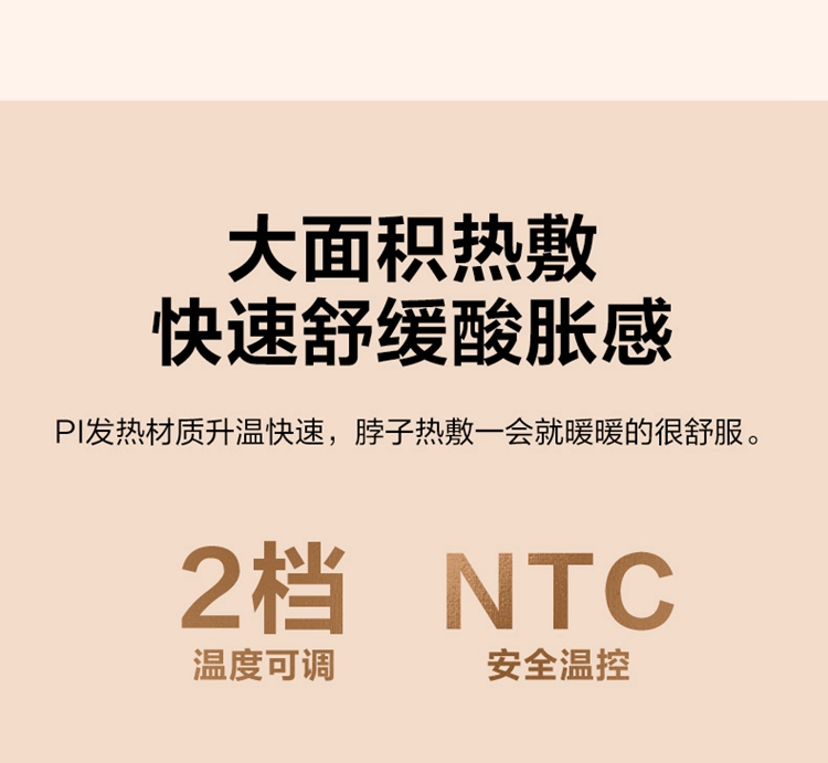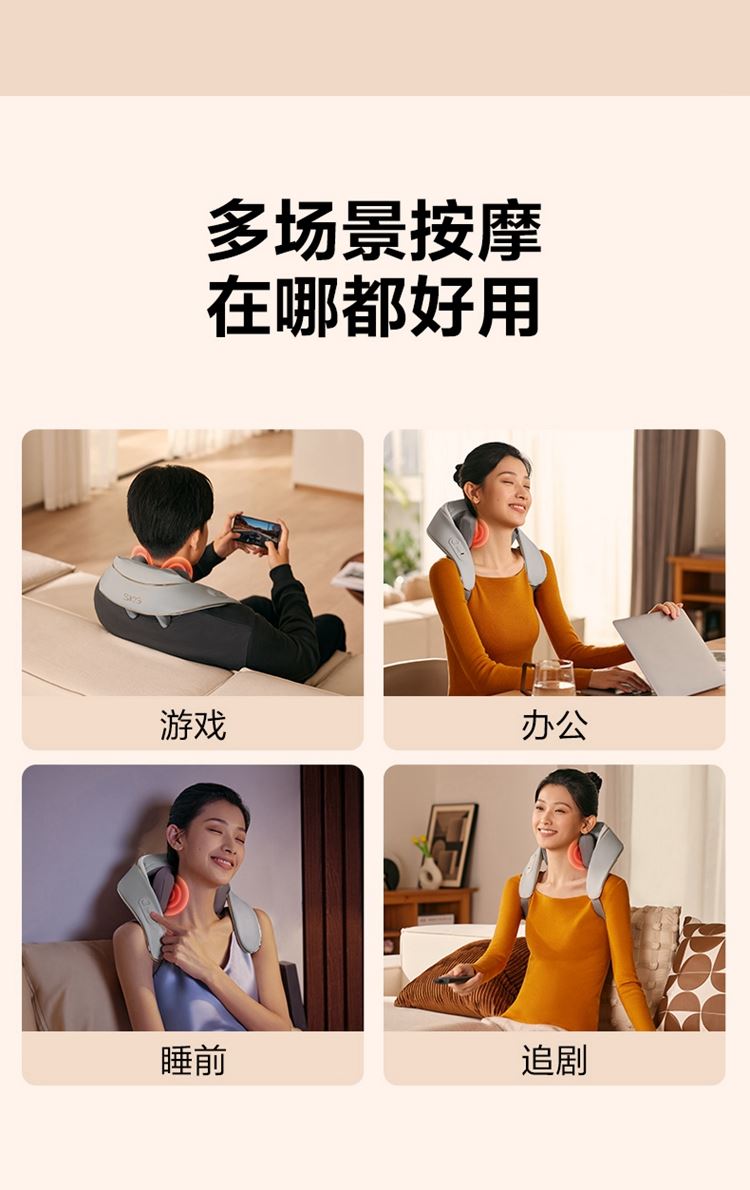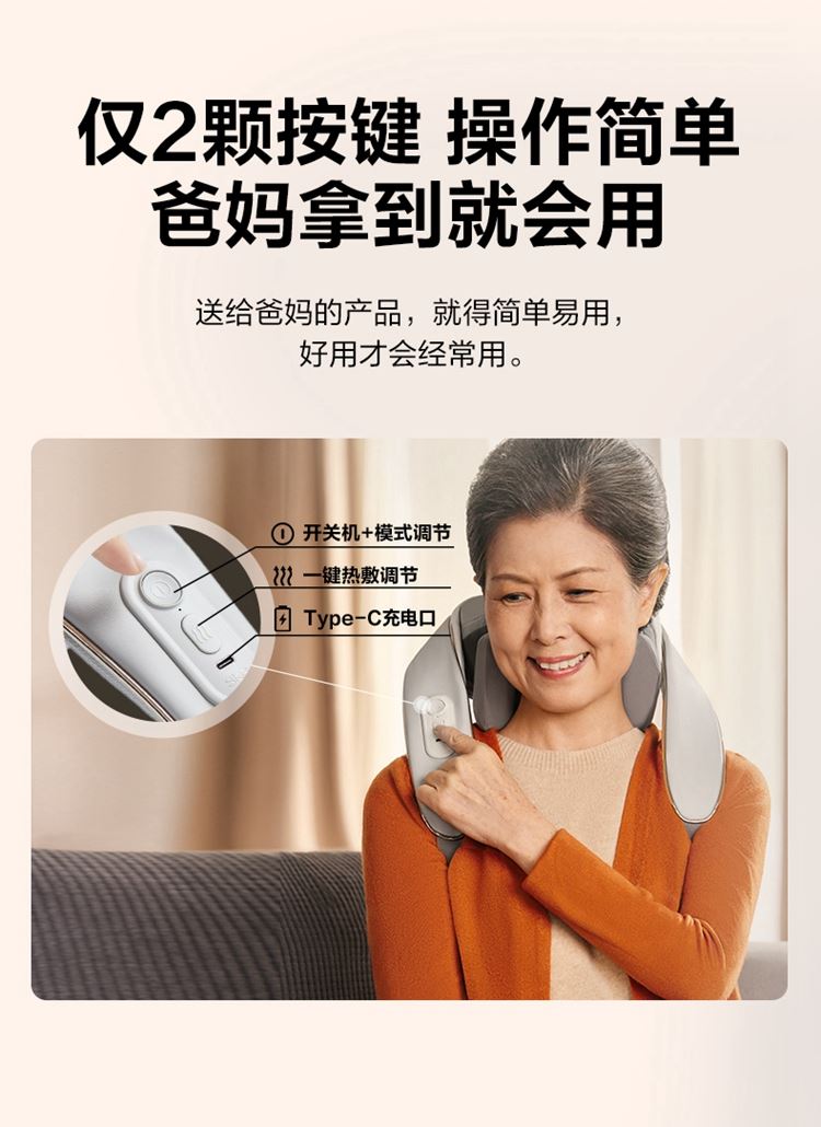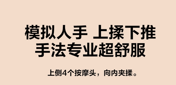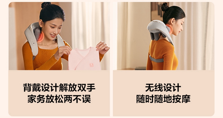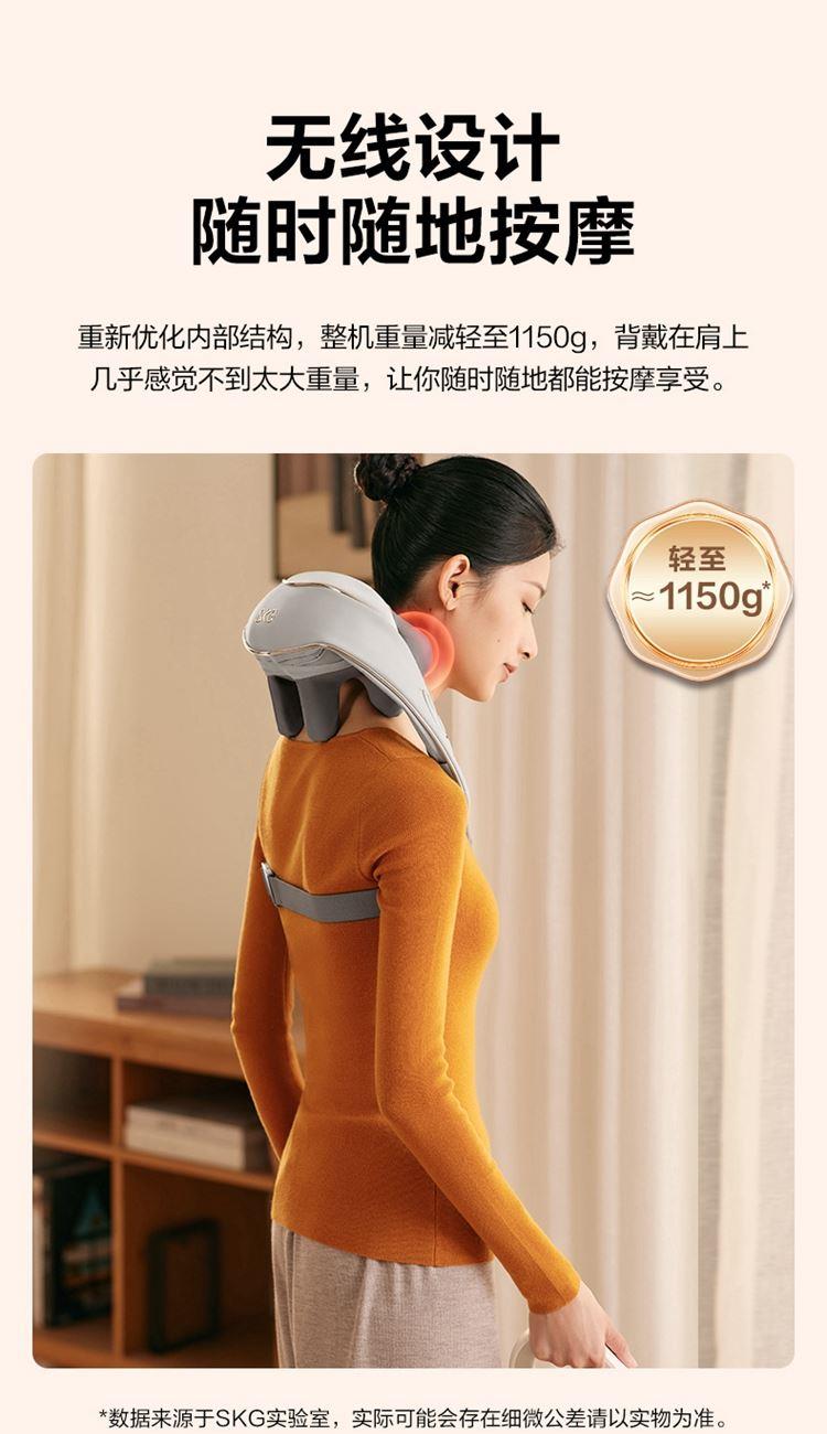 产品描述: 颈椎夹揉,斜方肌推揉 特殊传动机构 肩背式一体化设计 硅胶可回弹按摩头 布套可拆卸水洗 颈、腿、腰全身可用 产品参数: 机身材质:PU皮革 电源电压:5V/10W 充电接口:type-C 控制方式:机身按键 语音播报:无 电池容量:2500mAh锂电池 续航时间:4次(60分钟) 按摩时间:15分钟 按摩模式:3种 热敷档位:2档 温度挡位:41/45 ℃ 单台毛重/净重:1.4/1.15kg 彩箱尺寸:245*178*162mm