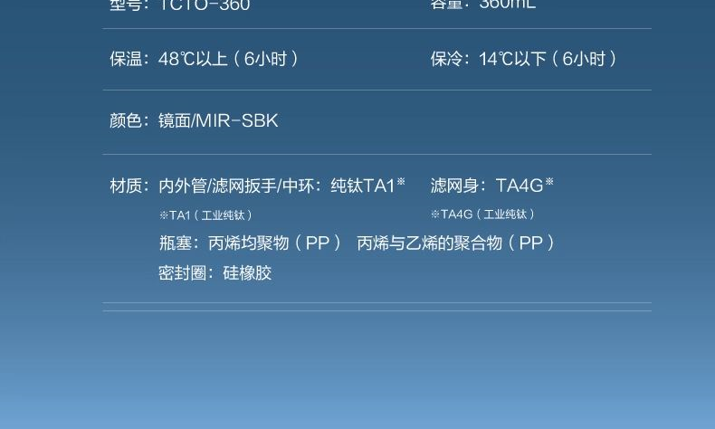 颜 色:MIR-SBK 容 量:360ml 类 型:逐光系列钛杯 定 制:可以定制 材 质:纯钛 镜面工艺 保 温:6小时大约60°C 保 冷:6小时大约12°C