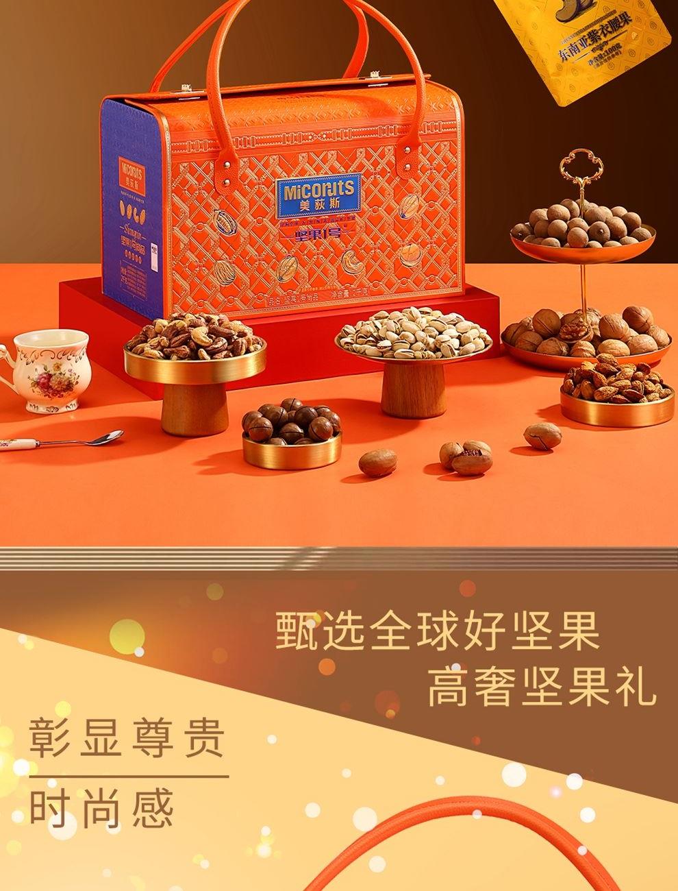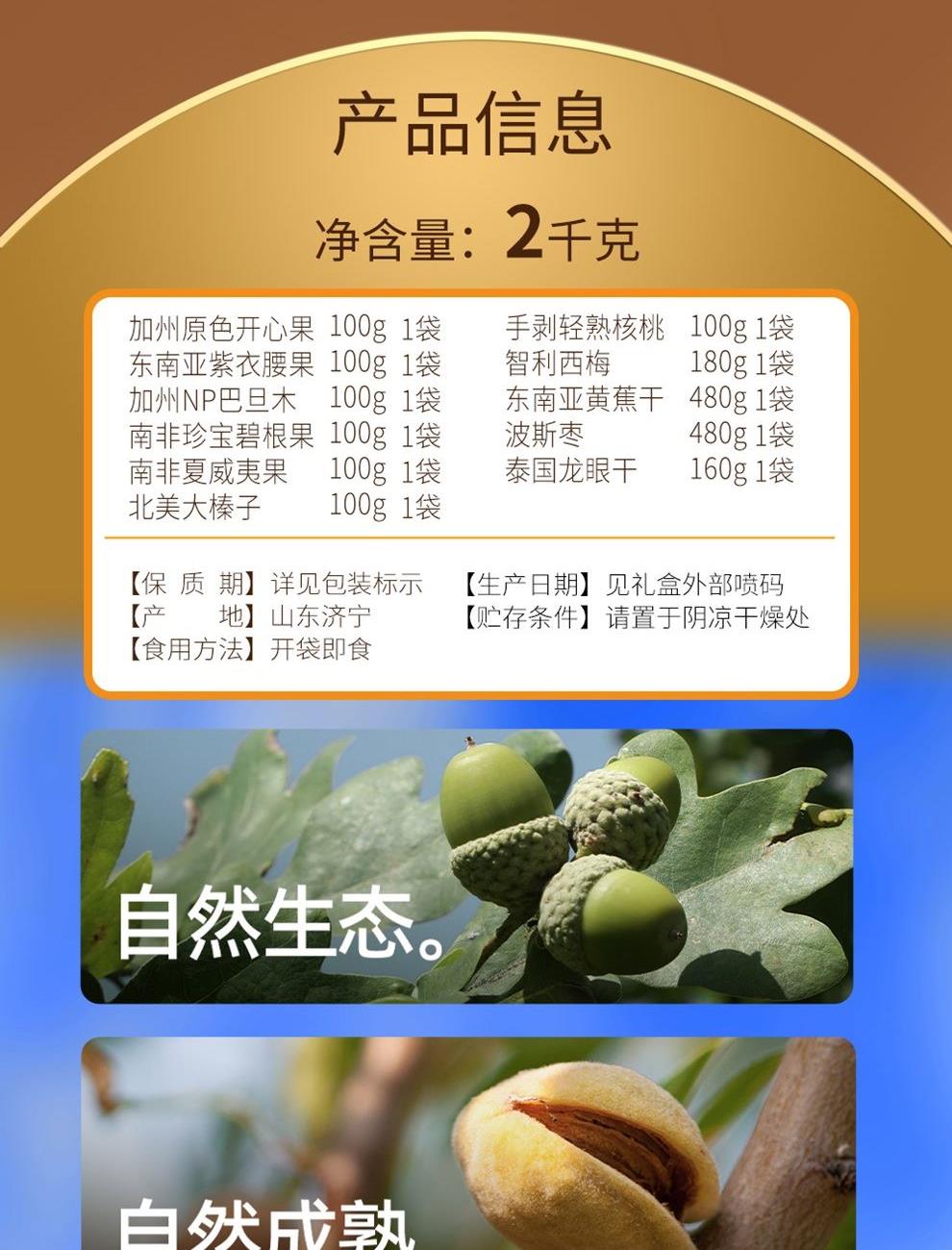 加州原色开心果 100g*1 东南亚紫衣腰果 100g*1 加州NP巴旦木 100g*1 南非珍宝碧根果 100g*1 南非夏威夷果 100g*1 北美大榛子 100g*1 手剥轻熟核桃 100g*1 智利西梅 180g*1 东南亚黄蕉干 480g*1 波斯枣 480g*1 泰国龙眼干 160g*1 合计:2000g