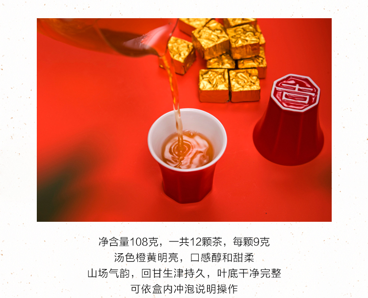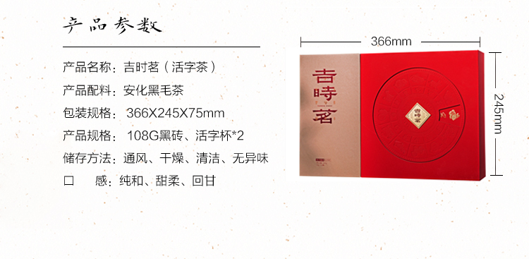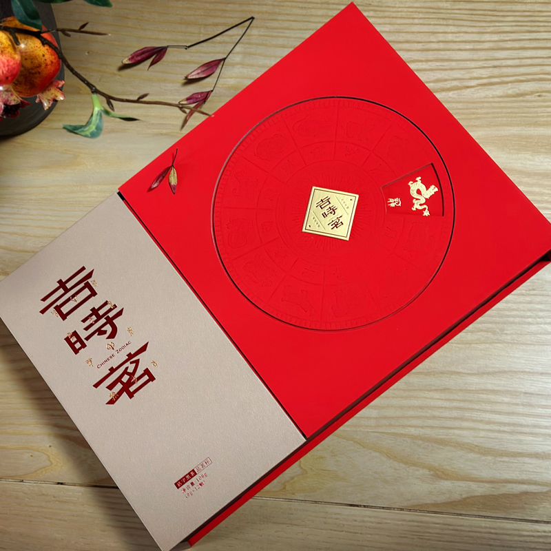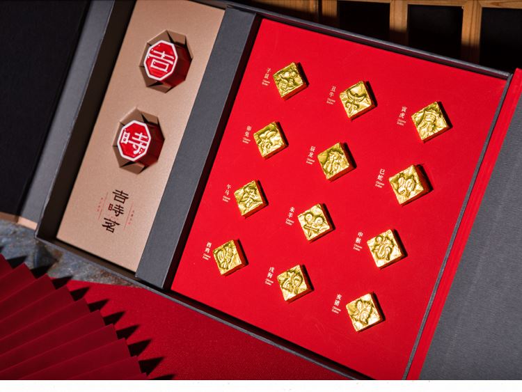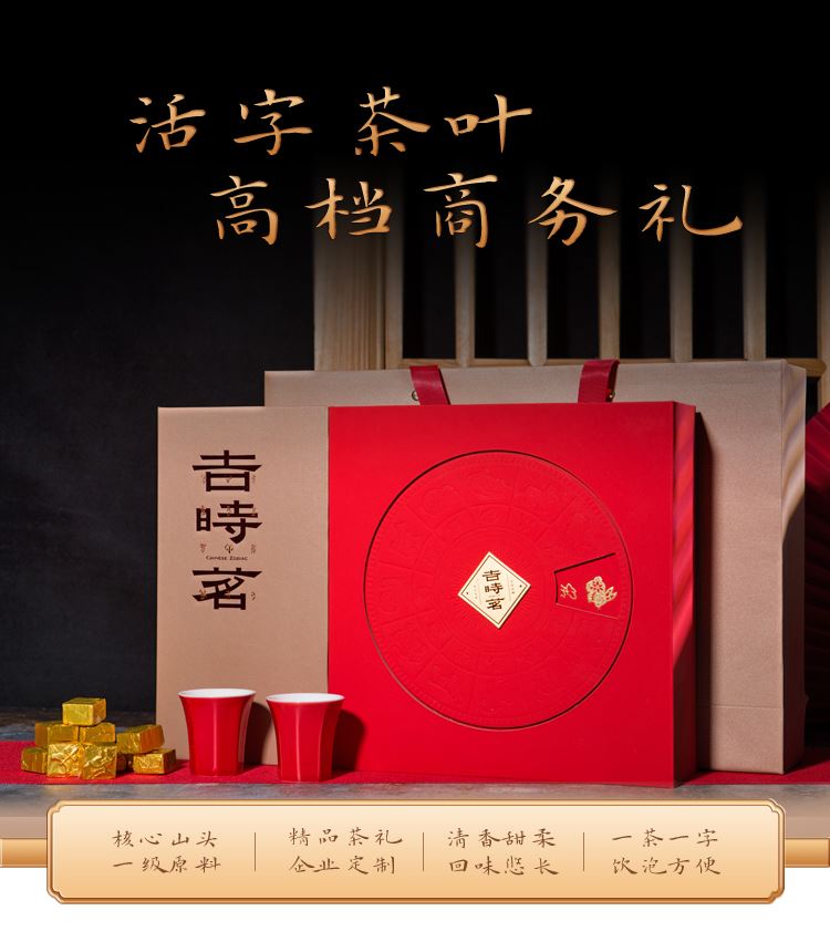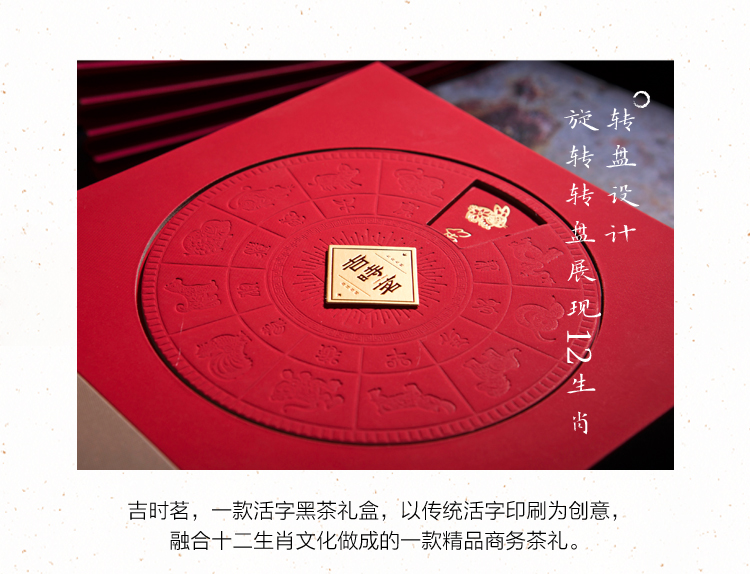 传统文化重视吉利, 吉时茗用吉时活字杯组合十二生肖图案的活字茶, 表达对美好生活的祝福。 茶叶108克,活字杯2个 包装规格,366*245*75mm 红黄拼色包装设计,精品特种纸材质,盒面安插创意转盘。商务品质感十足。茶字内容。茶杯立体文字均可定制