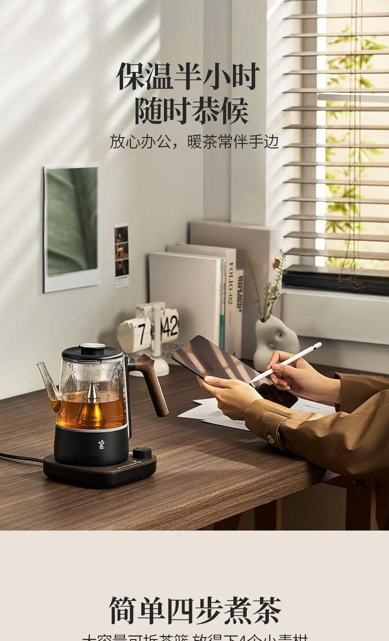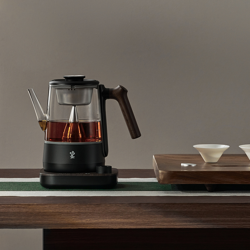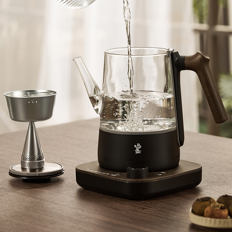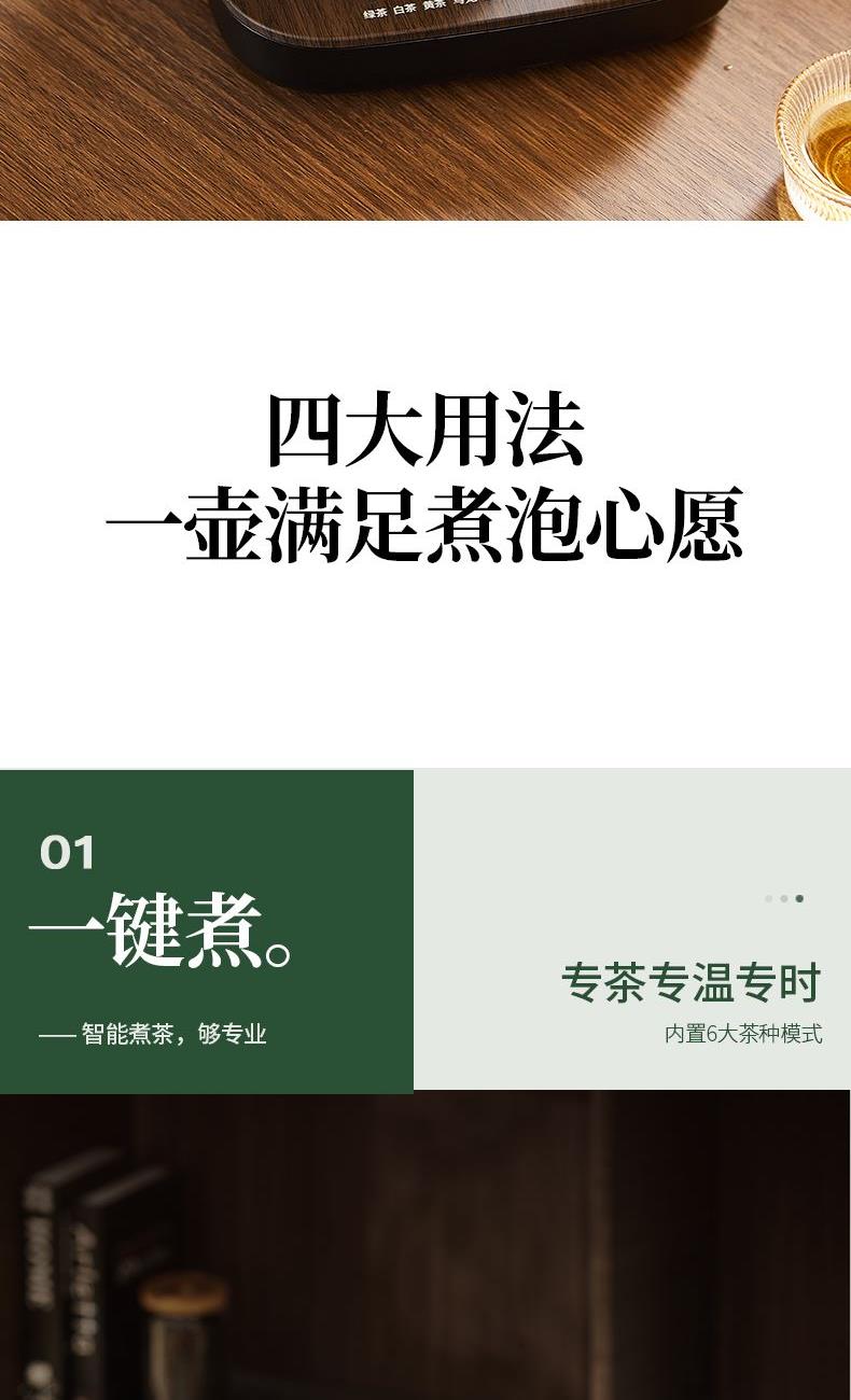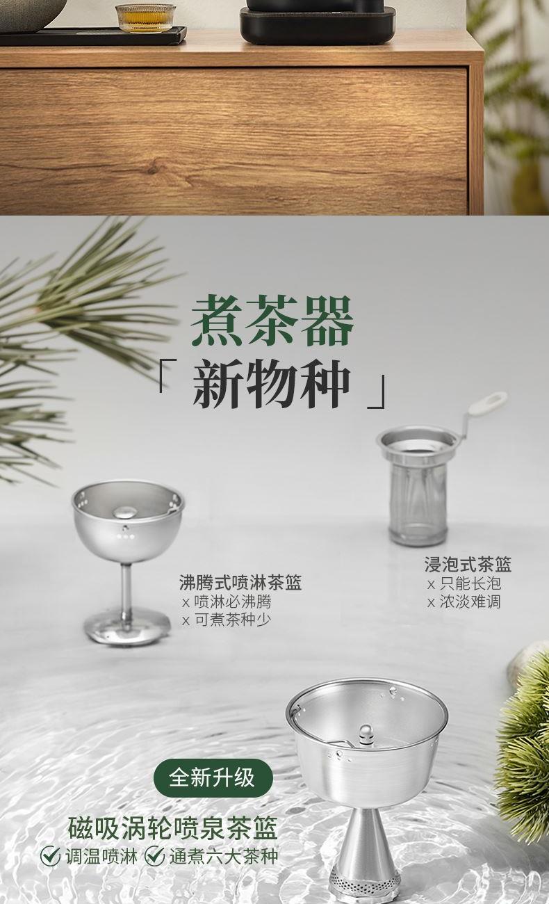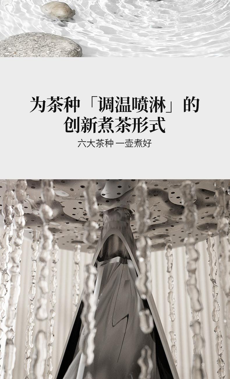 电源:220V~50Hz 额定功率:1000W 产品容量:700mL 产品颜色:曜岩黑 产品尺寸:248H*255L*170W / 彩盒315L * 296W * 207H / 邮盒330L * 306W * 225H 产品重量:产品净重1.34 Kg / 邮盒毛重2.35 Kg 材质:304不锈钢、高硼硅玻璃、硅胶、PP、PA、ABS 标准配件:壶盖、壶口圈、壶体、底座、茶篮 可调温喷淋的煮茶器,使用创新的磁吸旋转茶篮,主动抽水喷淋茶叶,实现不同温度都可喷淋,喷淋时间自由定义,解决传统喷淋煮茶器只能煮沸喷淋黑茶的局限。内置六种煮茶模式覆盖六大茶种,能维持80-100℃五档温度连续喷淋,做到专茶专温专时。夏天能直接用冷水萃取茶叶,一键15分快速出味,带来全新品茶体验。