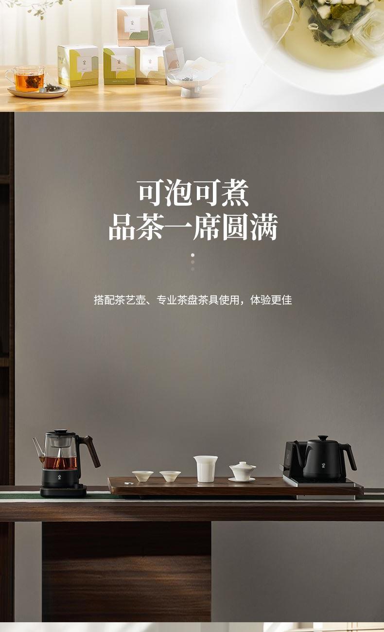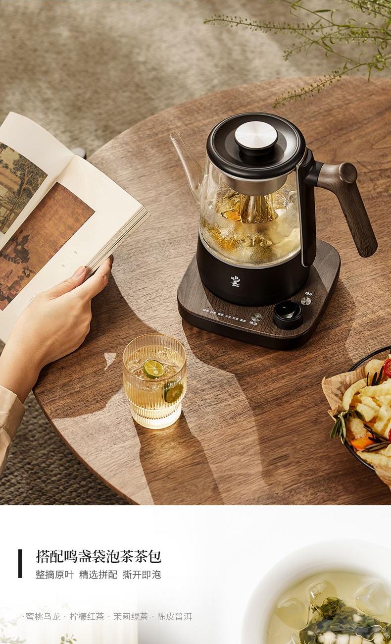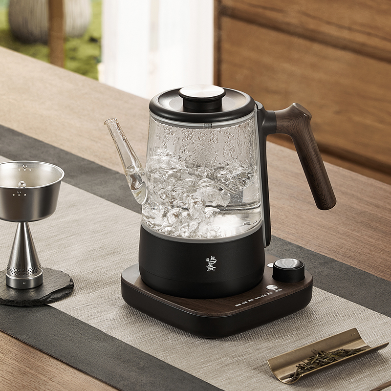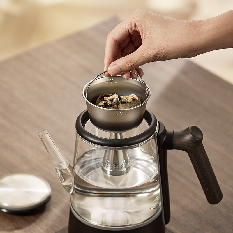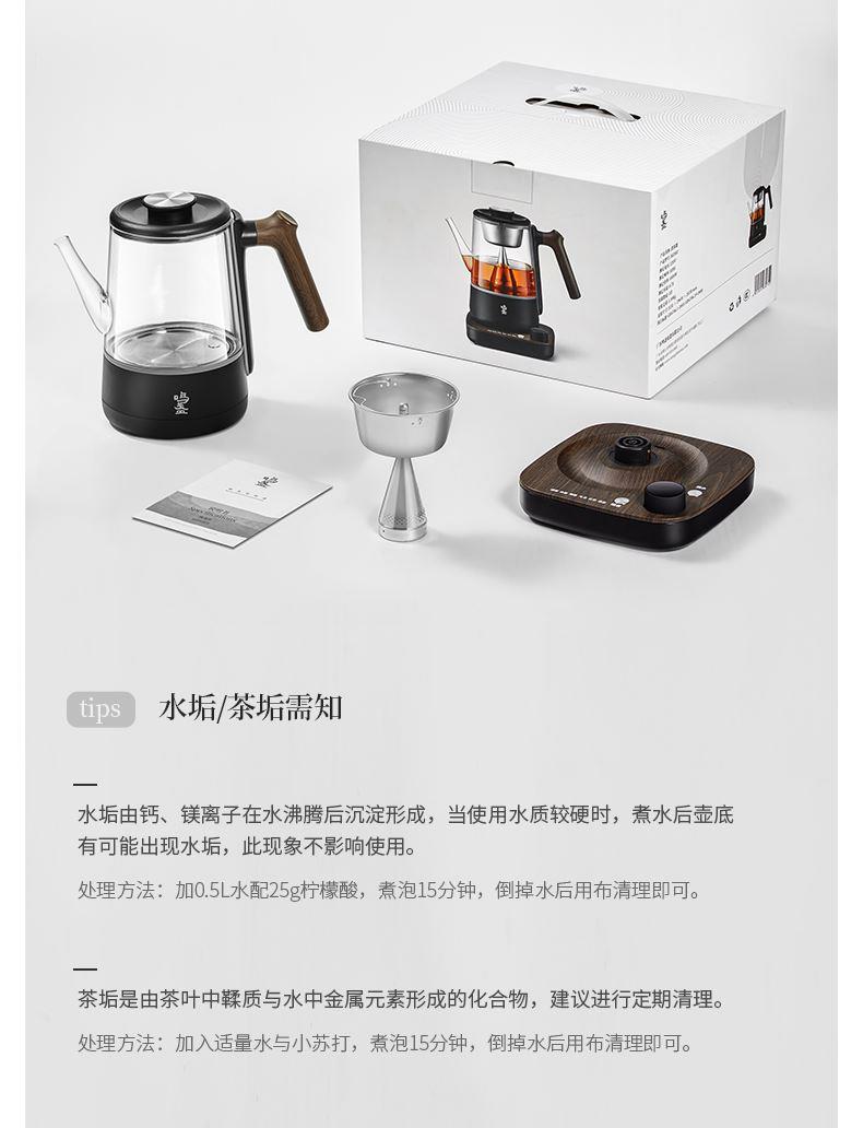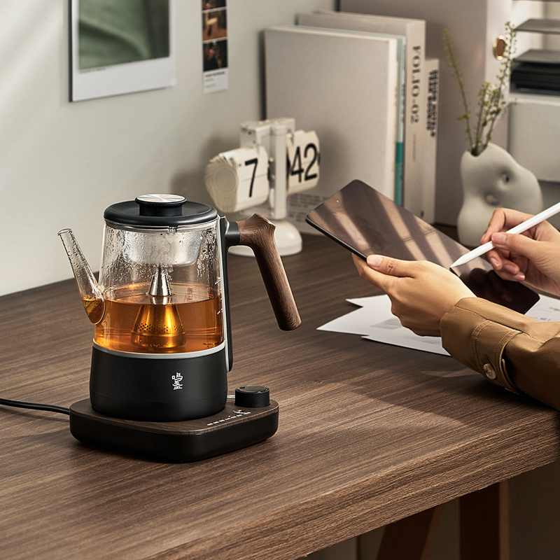 电源:220V~50Hz 额定功率:1000W 产品容量:700mL 产品颜色:曜岩黑 产品尺寸:248H*255L*170W / 彩盒315L * 296W * 207H / 邮盒330L * 306W * 225H 产品重量:产品净重1.34 Kg / 邮盒毛重2.35 Kg 材质:304不锈钢、高硼硅玻璃、硅胶、PP、PA、ABS 标准配件:壶盖、壶口圈、壶体、底座、茶篮 可调温喷淋的煮茶器,使用创新的磁吸旋转茶篮,主动抽水喷淋茶叶,实现不同温度都可喷淋,喷淋时间自由定义,解决传统喷淋煮茶器只能煮沸喷淋黑茶的局限。内置六种煮茶模式覆盖六大茶种,能维持80-100℃五档温度连续喷淋,做到专茶专温专时。夏天能直接用冷水萃取茶叶,一键15分快速出味,带来全新品茶体验。