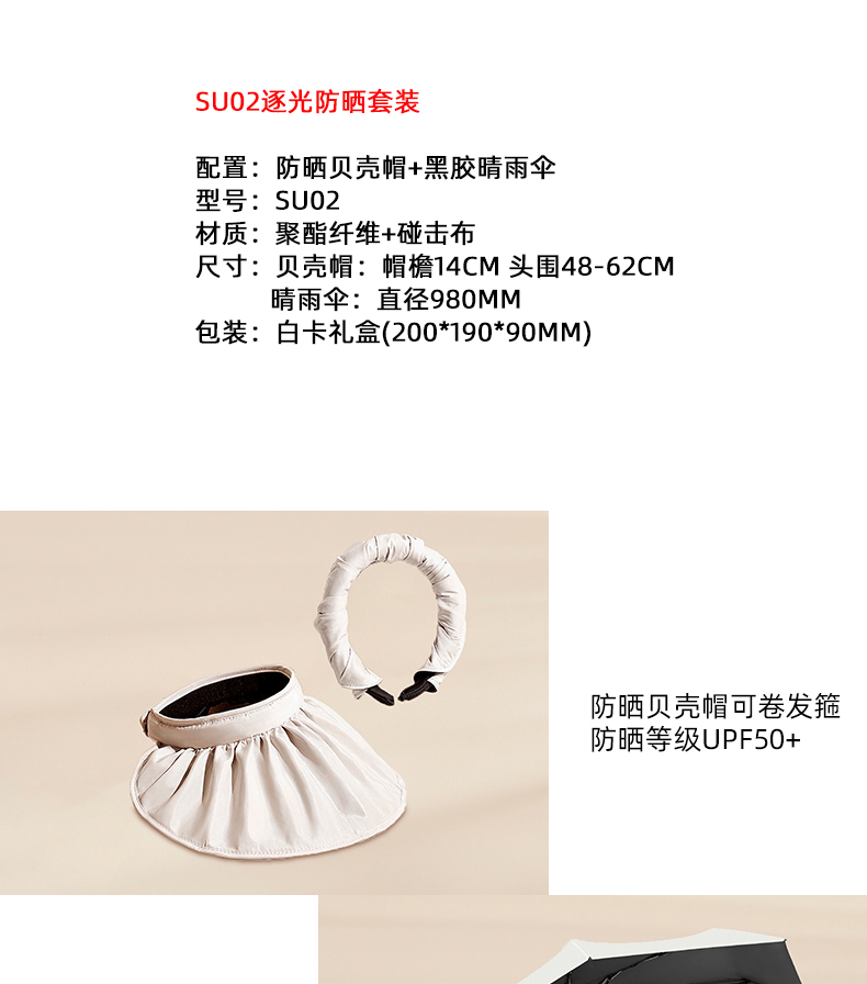 配置:防晒贝壳帽+黑胶晴雨伞 型号:SU02 材质:聚酯纤维+碰击布 尺寸:贝壳帽:帽檐14cm 头围48-62cm 晴雨伞:直径980mm 包装:白卡礼盒(200*190*90mm)