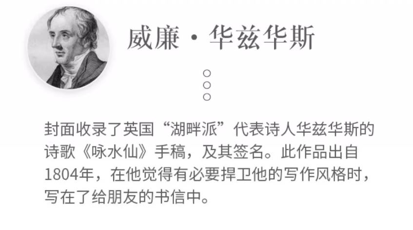 产品:华兹华斯羽毛笔笔记本礼盒套装 创作灵感:封面收录了英国“湖畔派”代表诗人华兹华斯的诗歌《咏水仙》手稿,以其签名。此作品出自1804年,在他觉得有必要捍卫他的写作风格时,写在了给朋友的书信中。 封面材质:星采黑银纸 礼盒组件:羽毛蘸墨笔、金属笔座、15ml墨水、中本笔记本、礼袋 礼盒尺寸:290*230*54mm 礼袋尺寸:300*250*60mm 本子尺寸:125*180mm 本子页数:144页 纸张材质:120克重无酸纸
