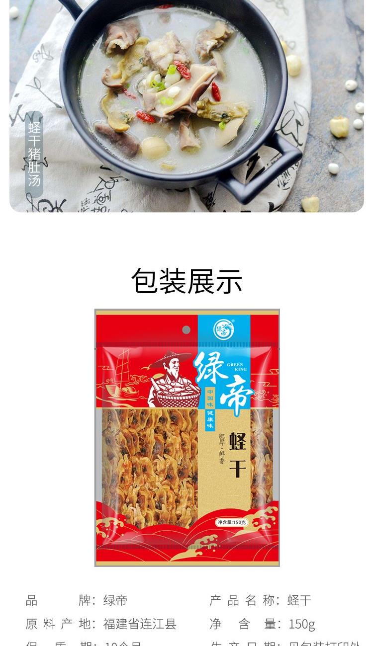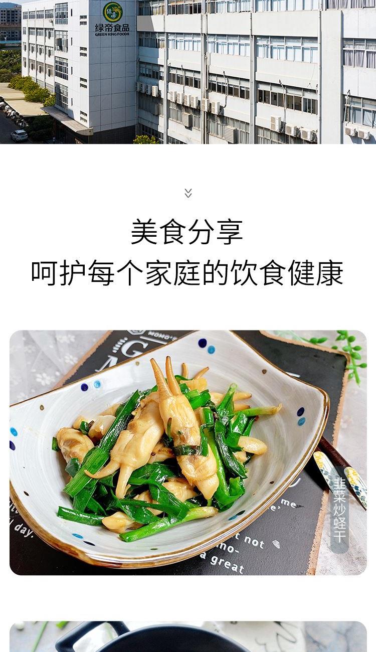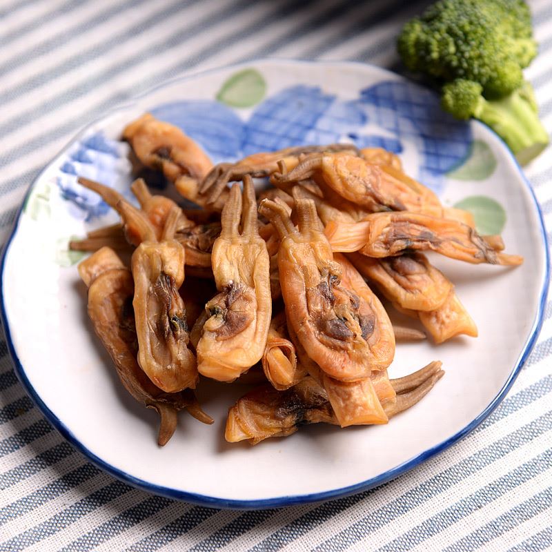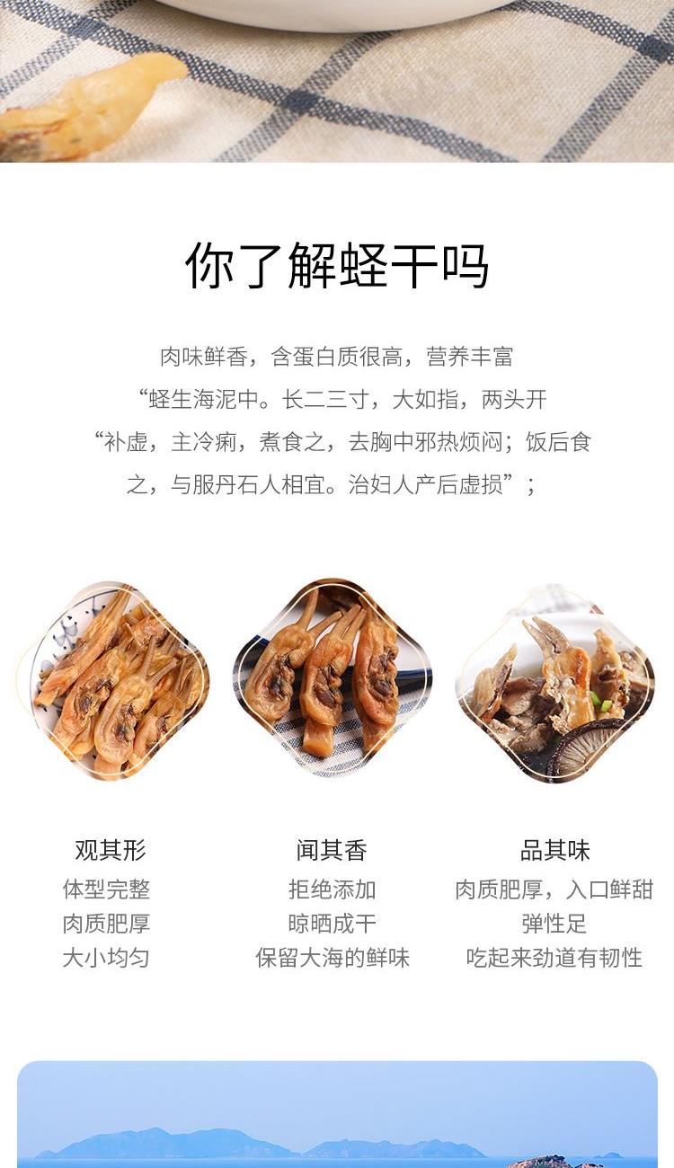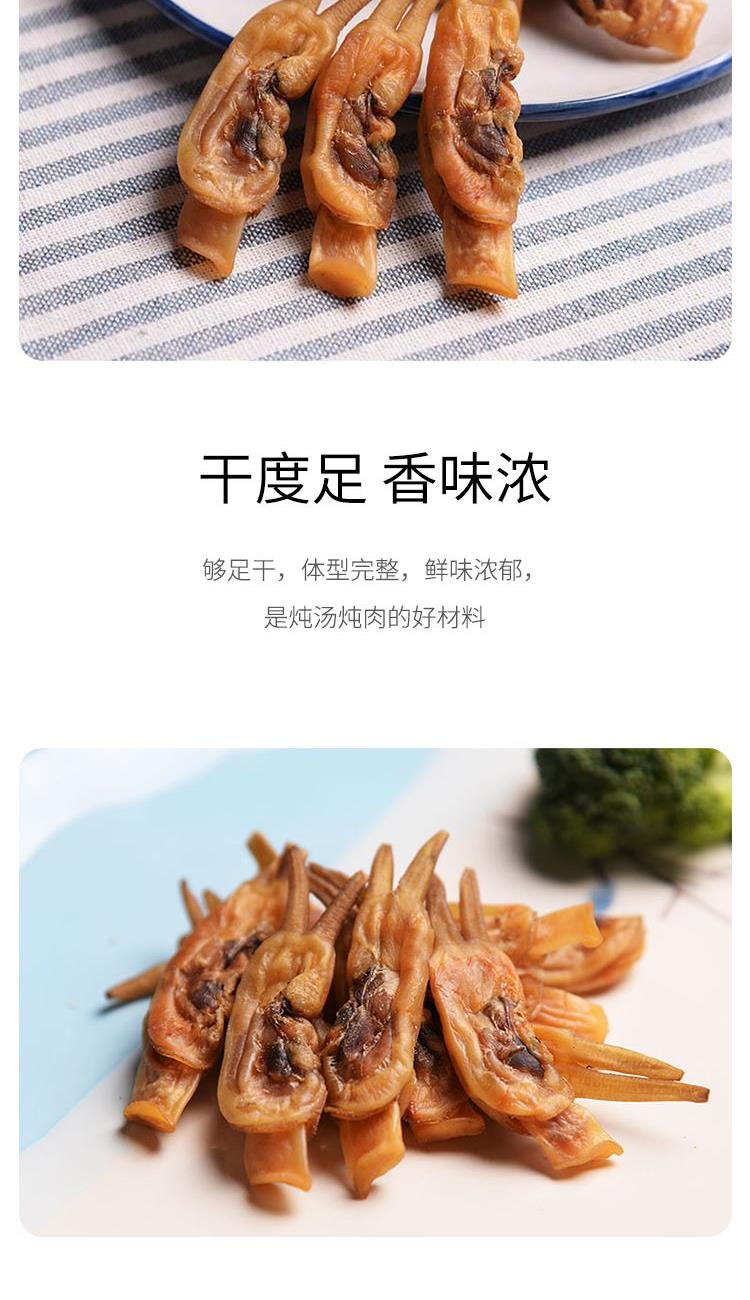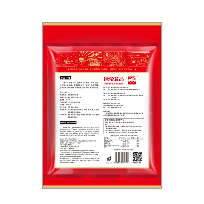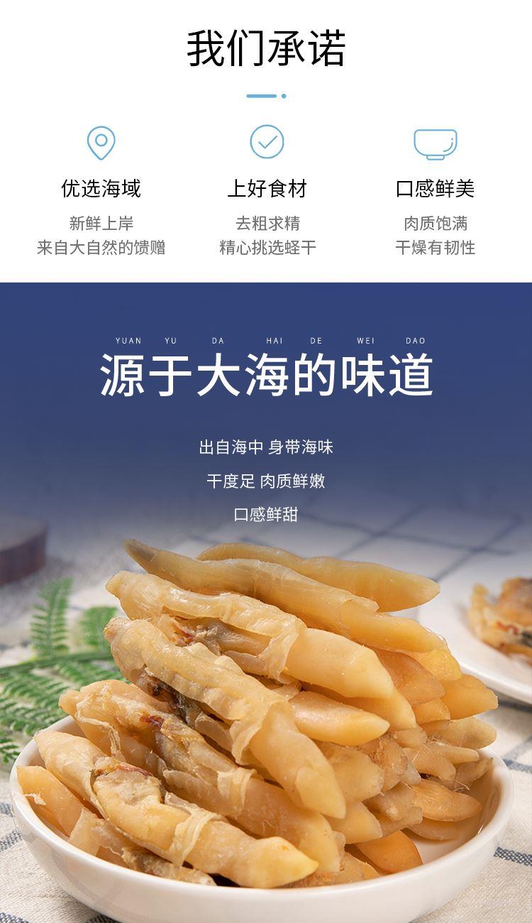 配料:蛏干 原料产地:福建省福州市连江县 净含量:150克 保质期:10个月 生产日期:见包装物打印处 食用方法:用清水浸泡回软洗净后,可炖、煮、蒸等,还可为多种菜肴调出美味。 蛏干又名蛏子干,是蛏肉的干制品,肉味鲜美,为贝类中的上品。质量好的蛏干个体大,肉质肥厚,色泽淡黄,质地干燥,气味清荤,少带咸味,无泥沙杂质。
