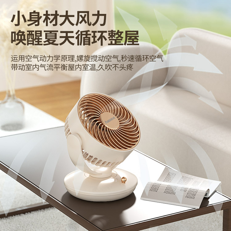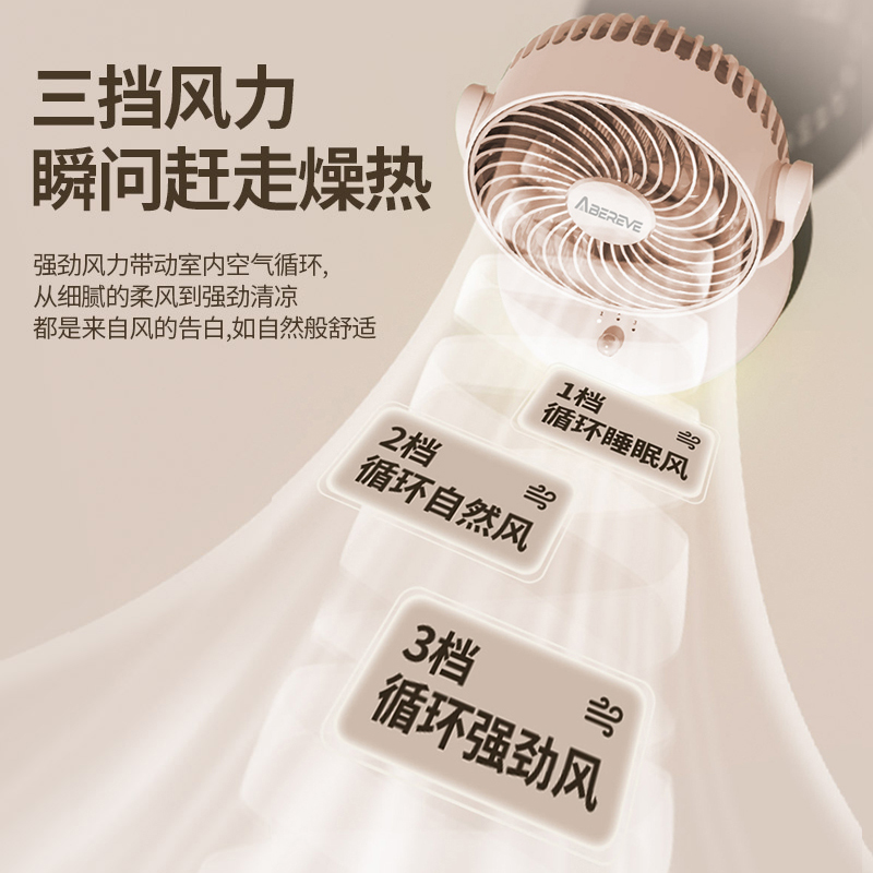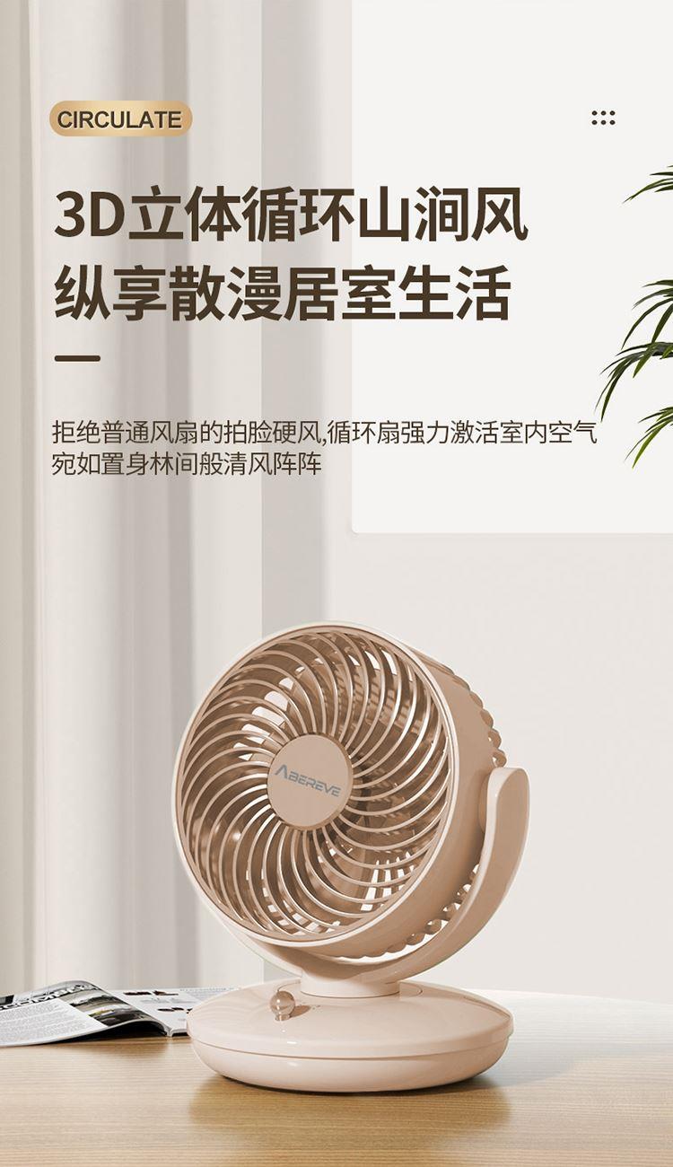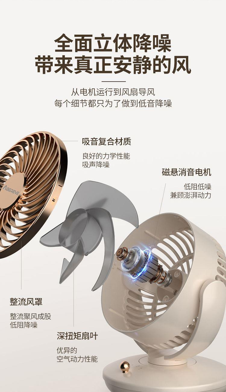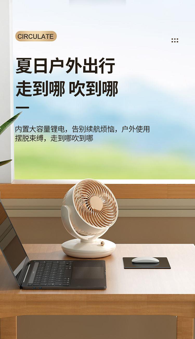 产品颜色:杏色 使用功率:7W 额定电压:5V 电池容量:1800毫安 产品净重:355g 产品毛重:479g 产品尺寸:211*161*82MM 包装尺寸:155*135*188MM 大锂电池续航 低音降噪电机 三档风速调节 上下左右摇头 立体循环送风