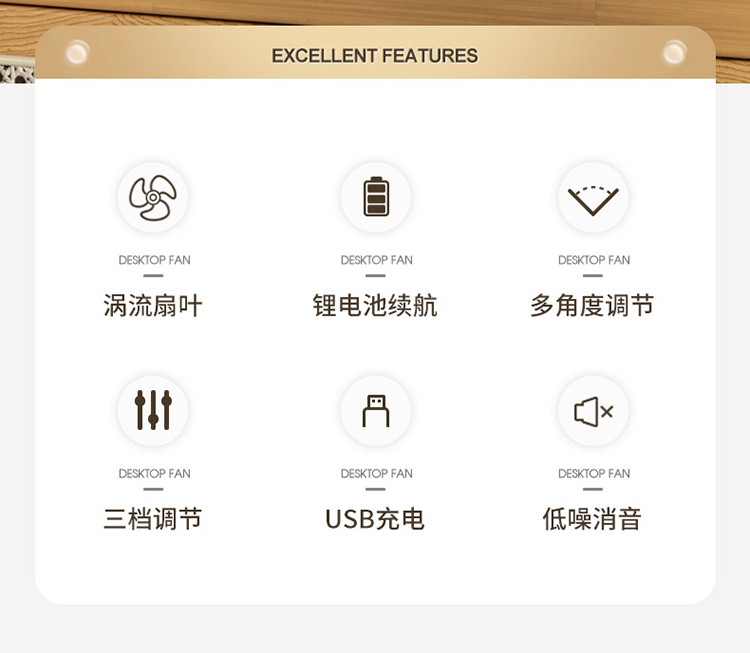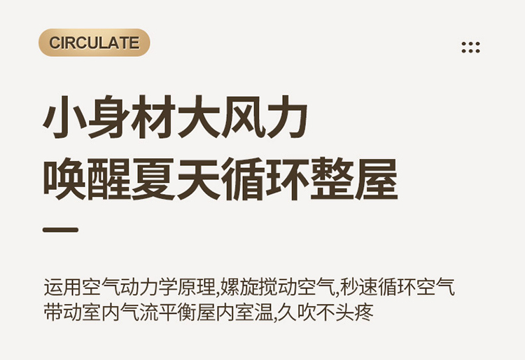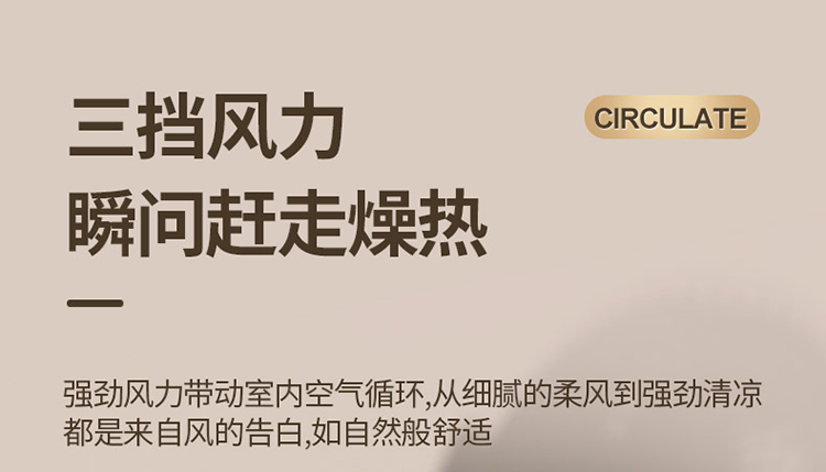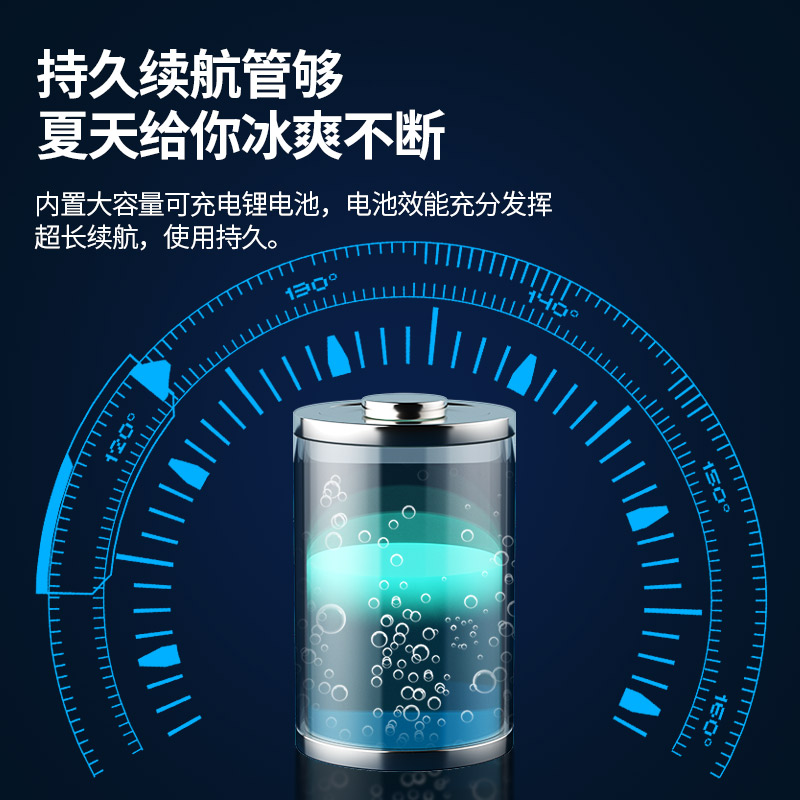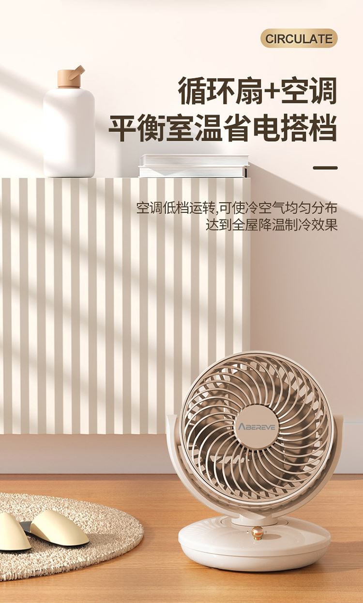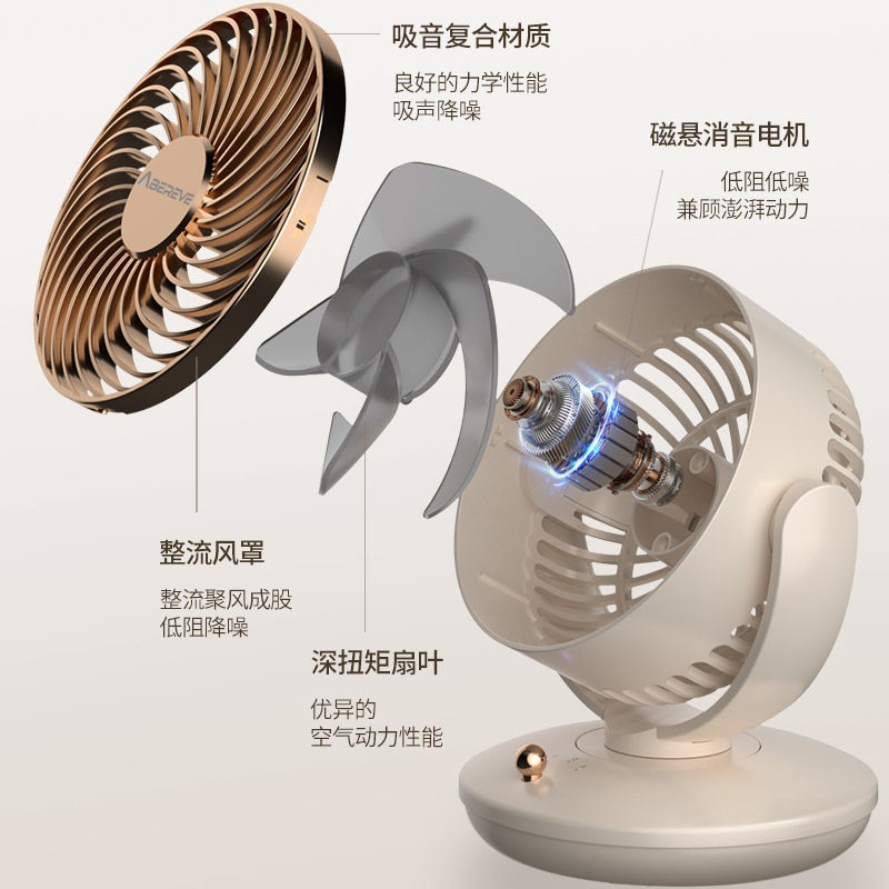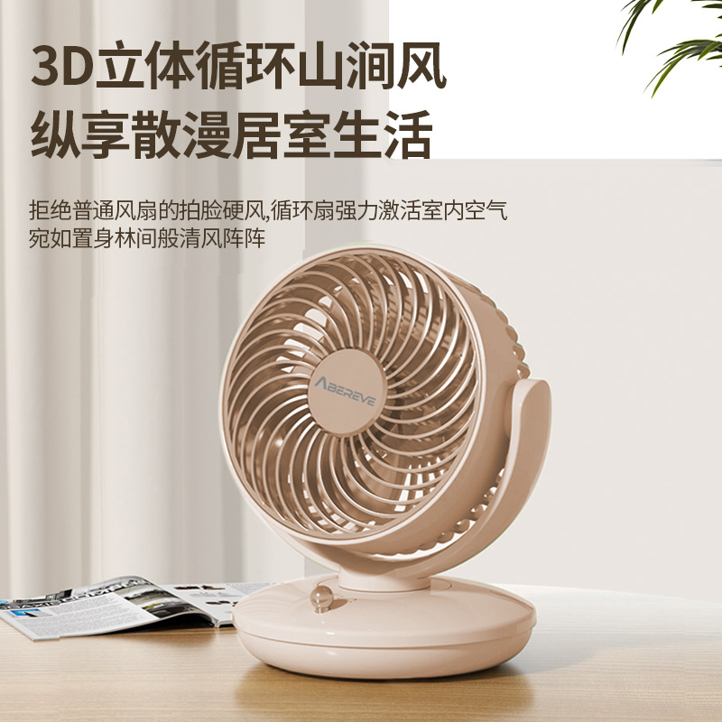 产品颜色:杏色 使用功率:7W 额定电压:5V 电池容量:1800毫安 产品净重:355g 产品毛重:479g 产品尺寸:211*161*82MM 包装尺寸:155*135*188MM 大锂电池续航 低音降噪电机 三档风速调节 上下左右摇头 立体循环送风