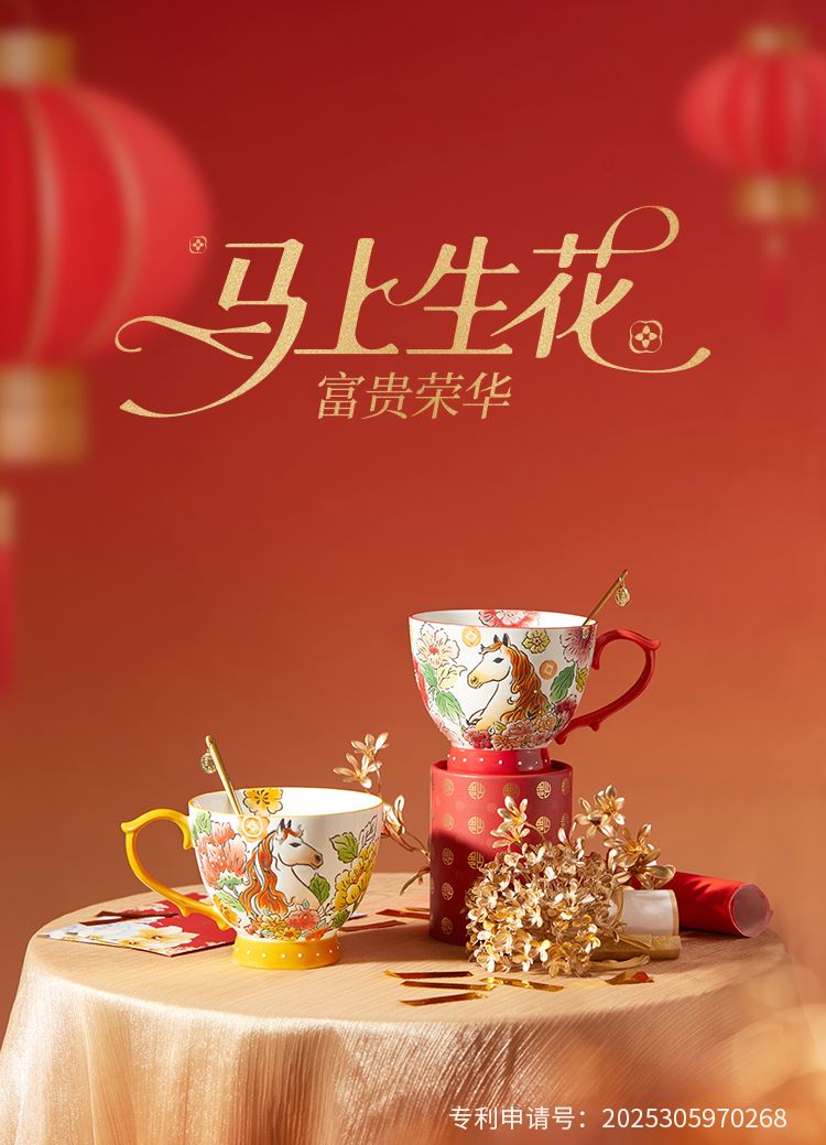 3.喜庆的红杯,以海棠谐音“满堂”,寓意阖家团圆,金玉满堂;尊贵大气的黄杯,以芙蓉谐音“富荣”,祝愿财富与荣耀兼得。