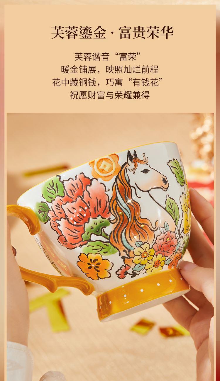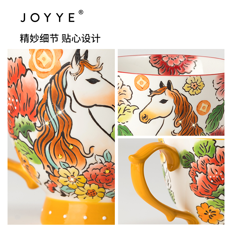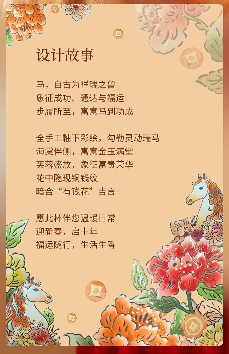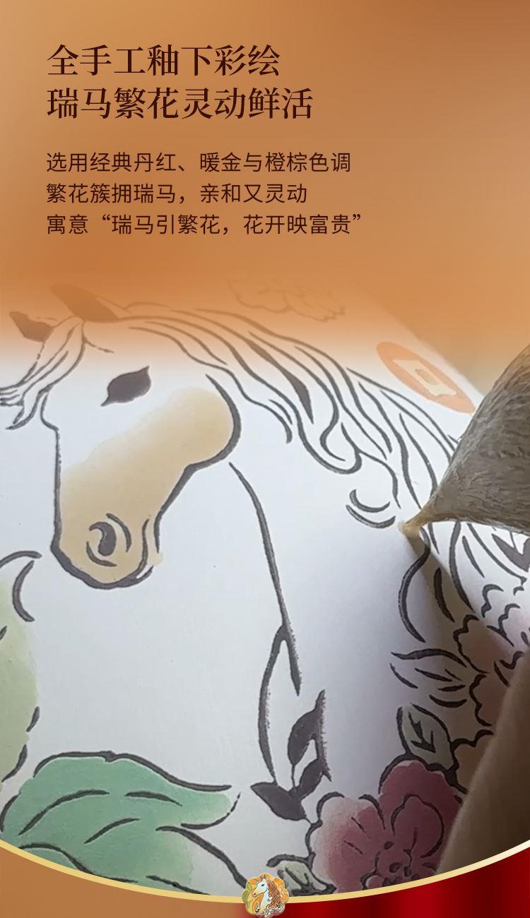 1.全手工釉下彩绘,绘出灵动鲜活的瑞马繁花,吉祥寓意和手绘美感融合。