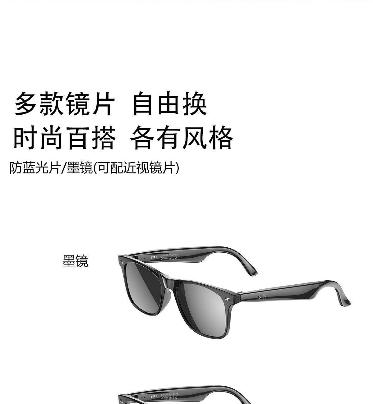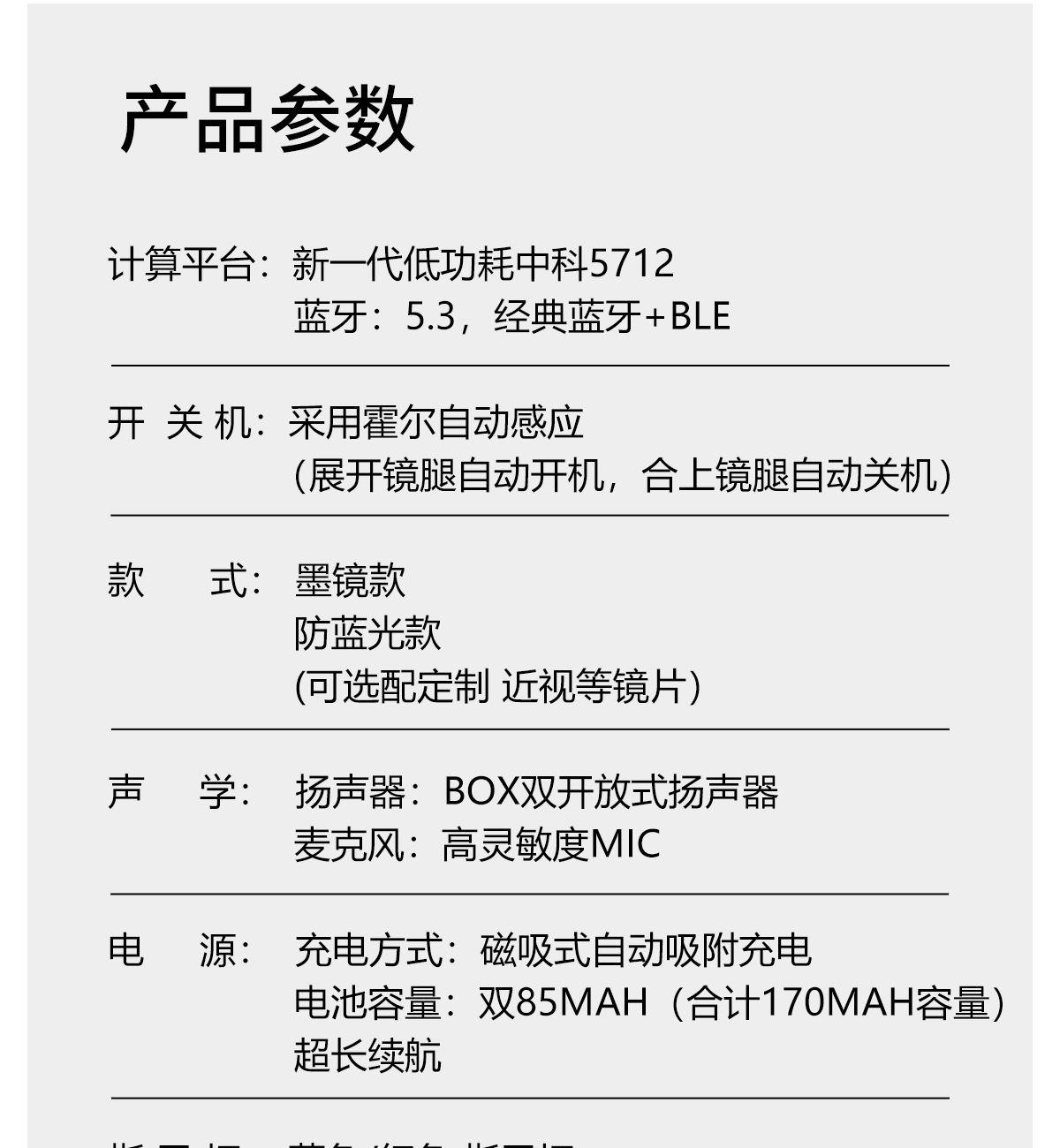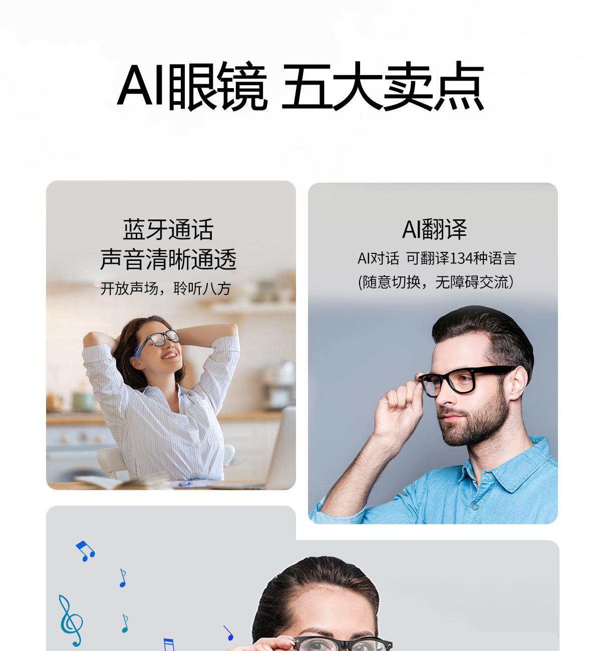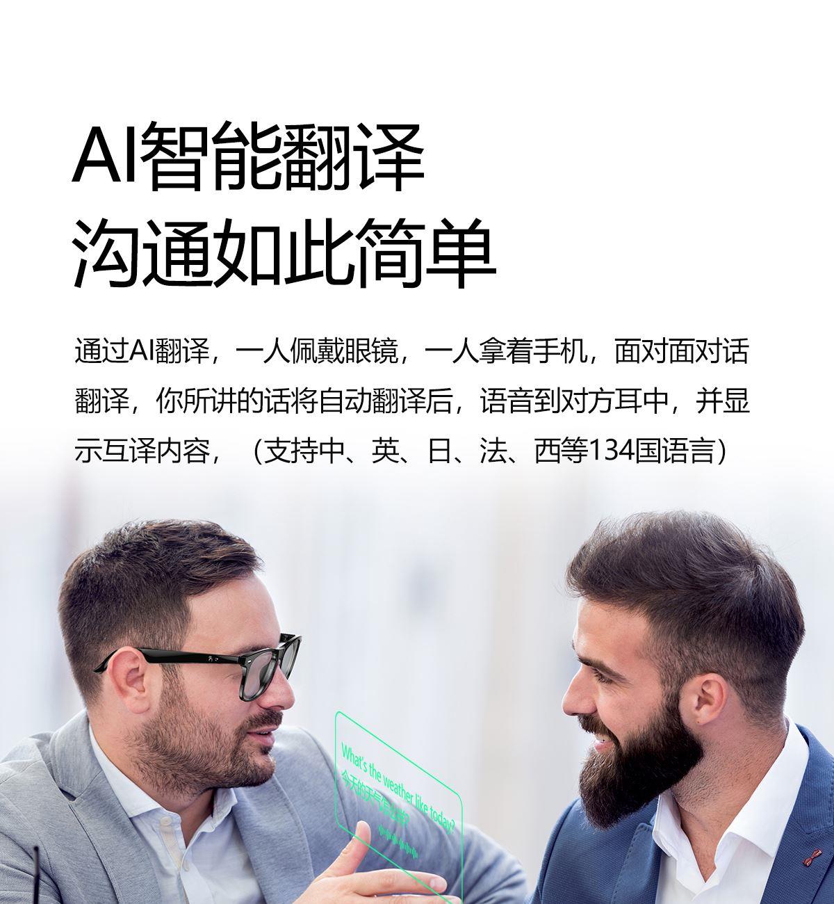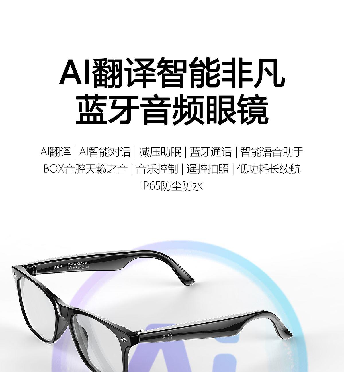产品功能:AI对话、AI智能翻译(翻译机模式,眼镜+手机翻译模式,可翻译定制134多种语言)语音笔记、助眠模式、拍照翻译、遥控拍照、蓝牙通话、智能霍尔感应自动开关机,智能语音助手、音乐播放(切换、暂停音乐欣赏)、遥控拍照、使用低功耗AB5712F低功耗芯片,续航持久、25g轻质重量无感佩戴舒适、可配置墨镜、蓝光、近视等多种镜片;