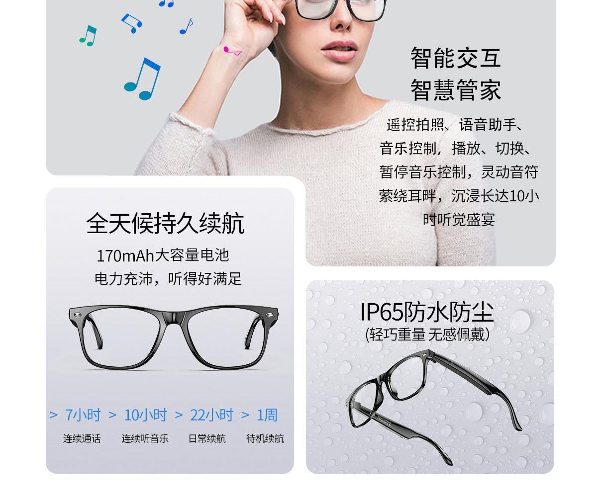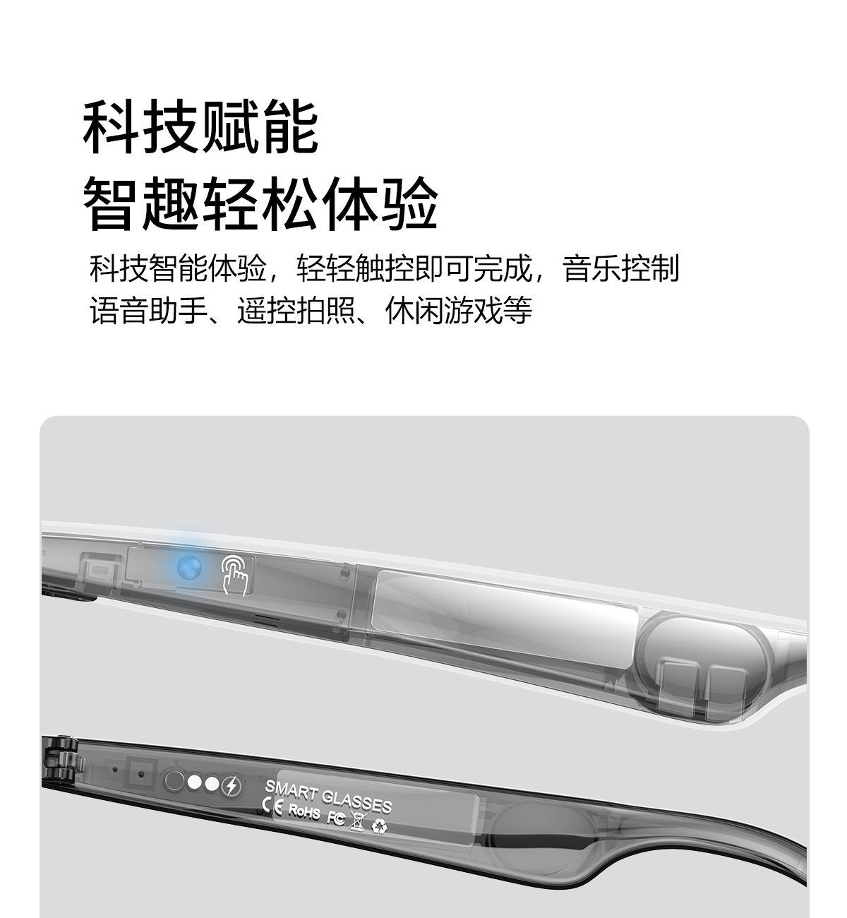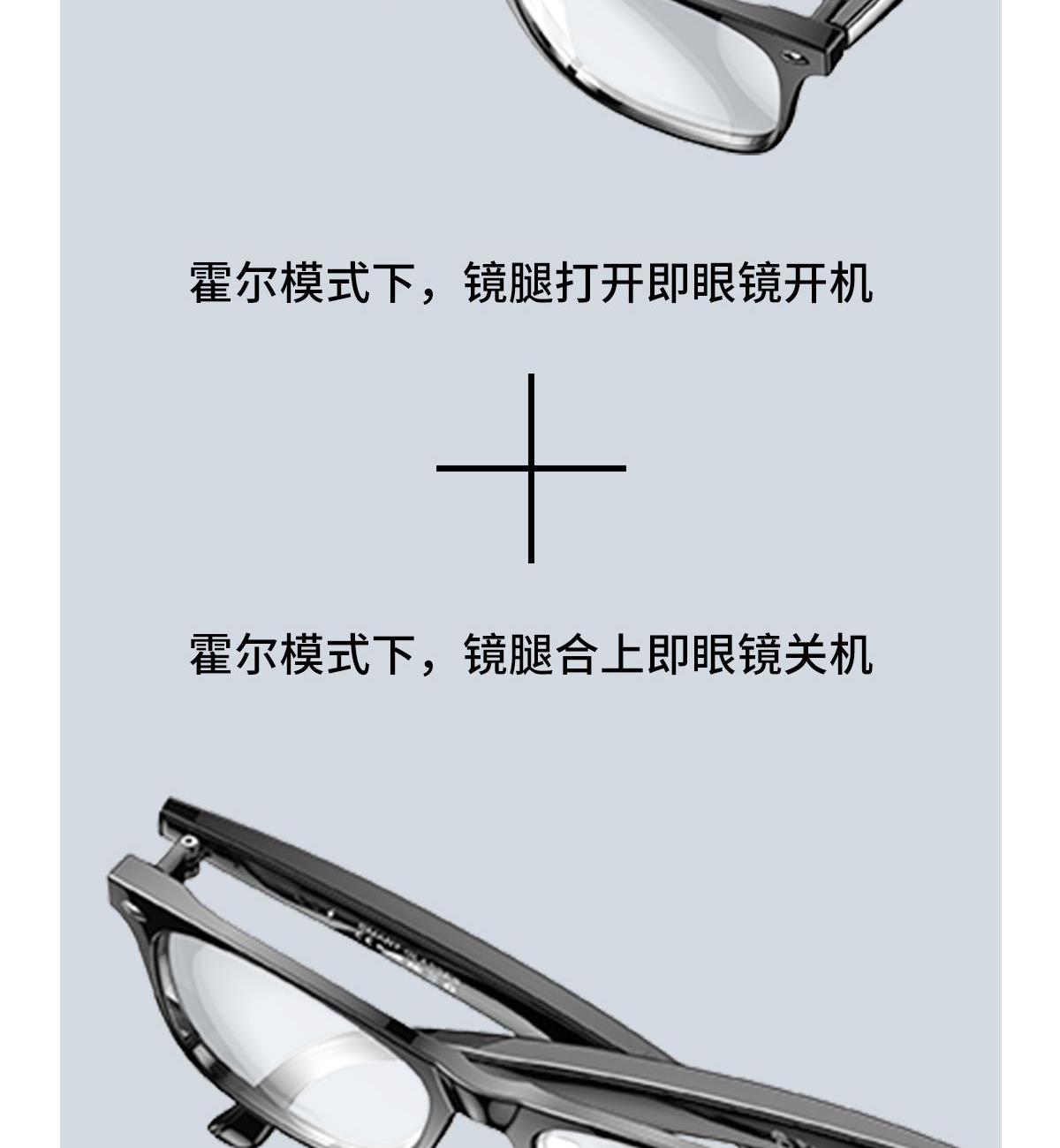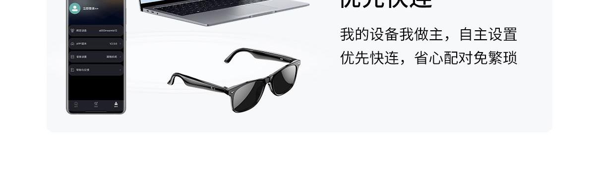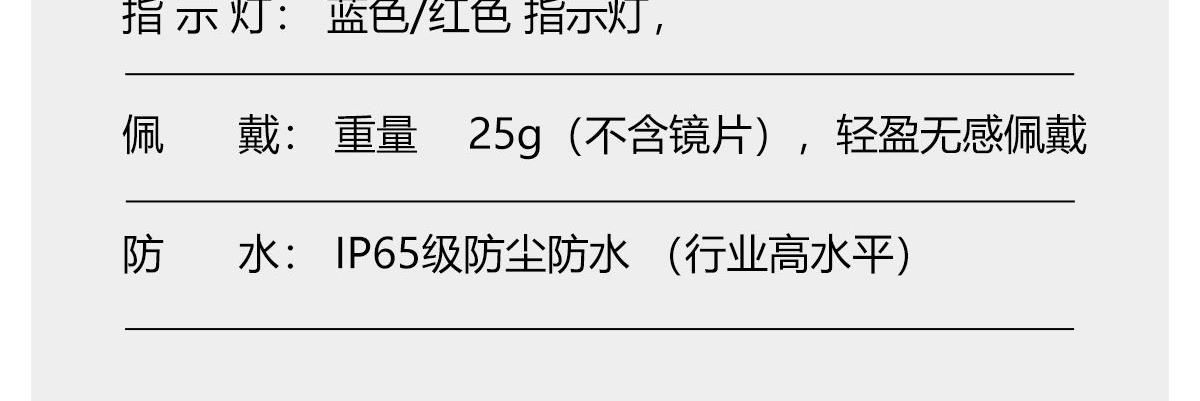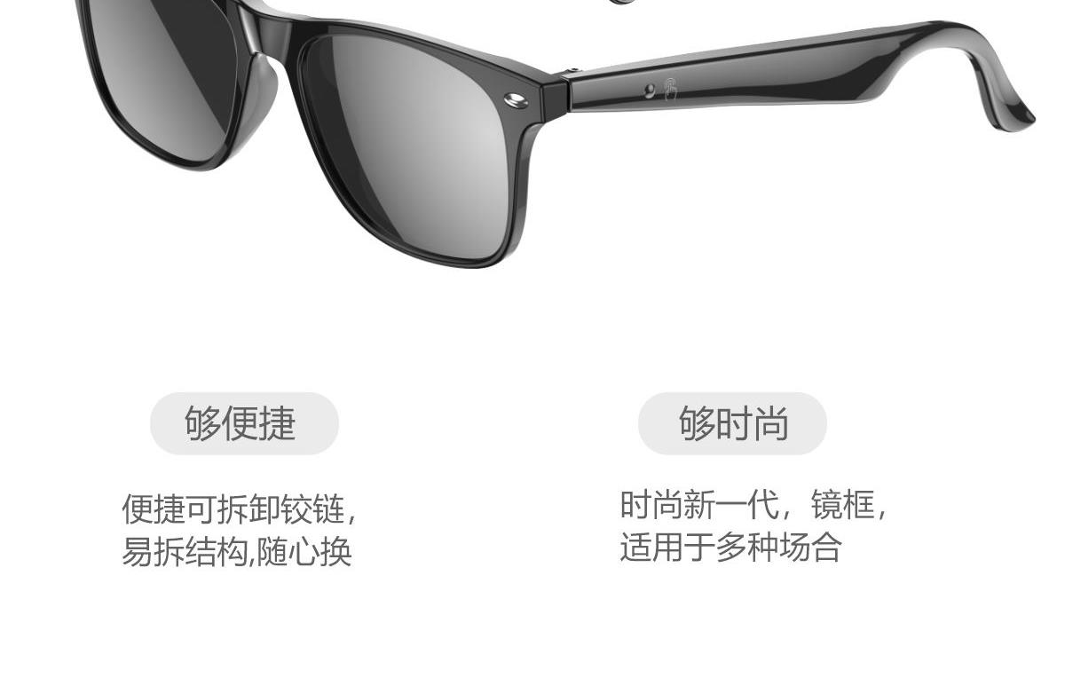 产品功能:AI对话、AI智能翻译(翻译机模式,眼镜+手机翻译模式,可翻译定制134多种语言)语音笔记、助眠模式、拍照翻译、遥控拍照、蓝牙通话、智能霍尔感应自动开关机,智能语音助手、音乐播放(切换、暂停音乐欣赏)、遥控拍照、使用低功耗AB5712F低功耗芯片,续航持久、25g轻质重量无感佩戴舒适、可配置墨镜、蓝光、近视等多种镜片;