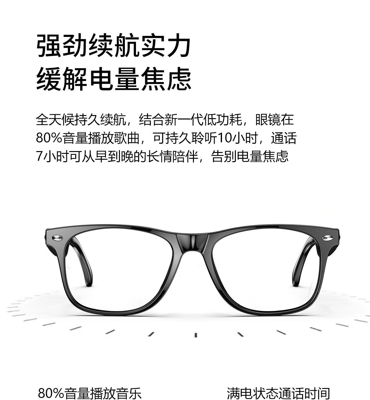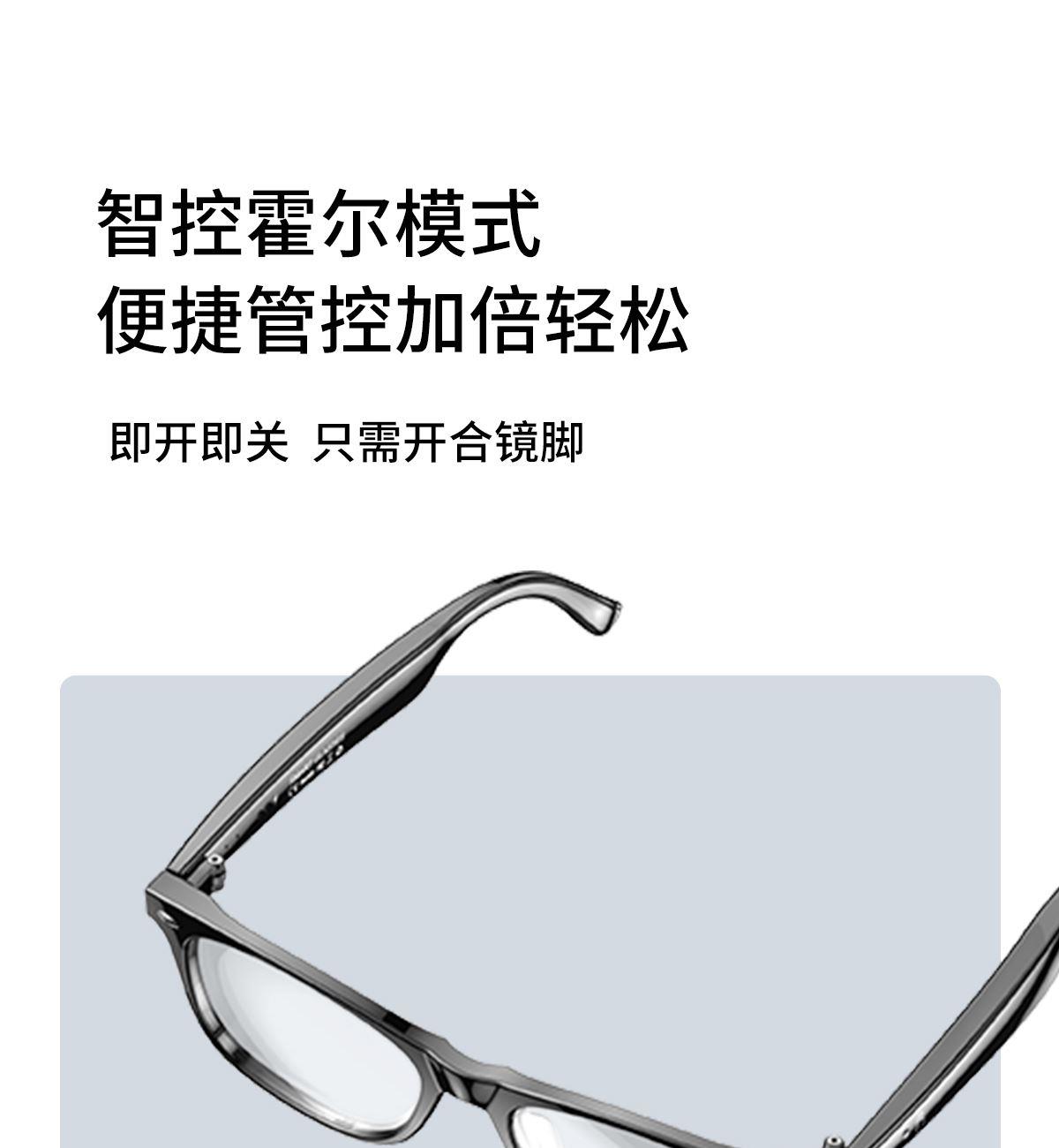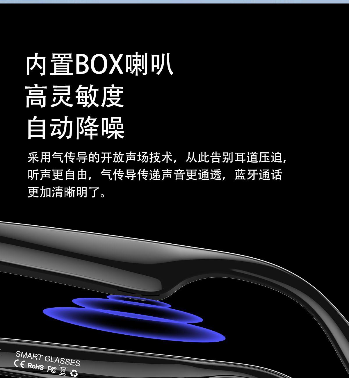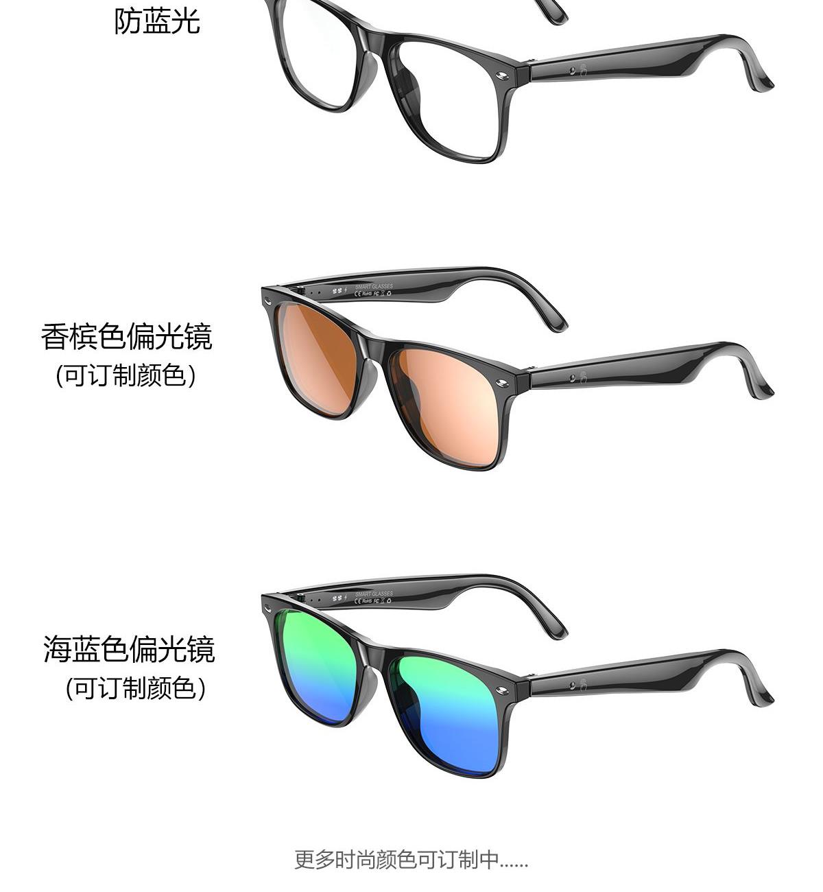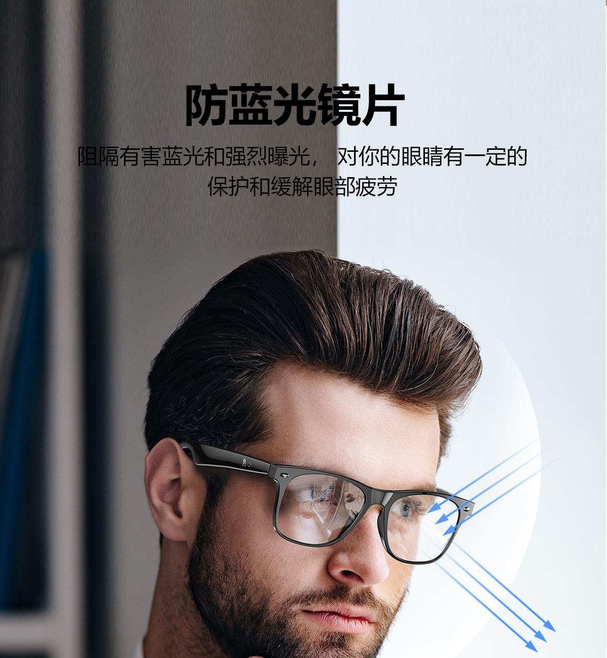 产品功能:AI对话、AI智能翻译(翻译机模式,眼镜+手机翻译模式,可翻译定制134多种语言)语音笔记、助眠模式、拍照翻译、遥控拍照、蓝牙通话、智能霍尔感应自动开关机,智能语音助手、音乐播放(切换、暂停音乐欣赏)、遥控拍照、使用低功耗AB5712F低功耗芯片,续航持久、25g轻质重量无感佩戴舒适、可配置墨镜、蓝光、近视等多种镜片;