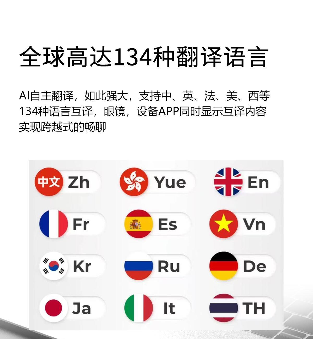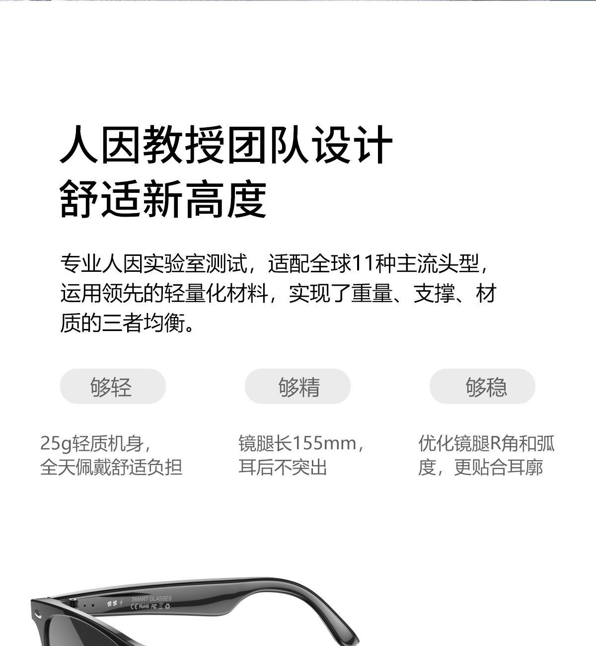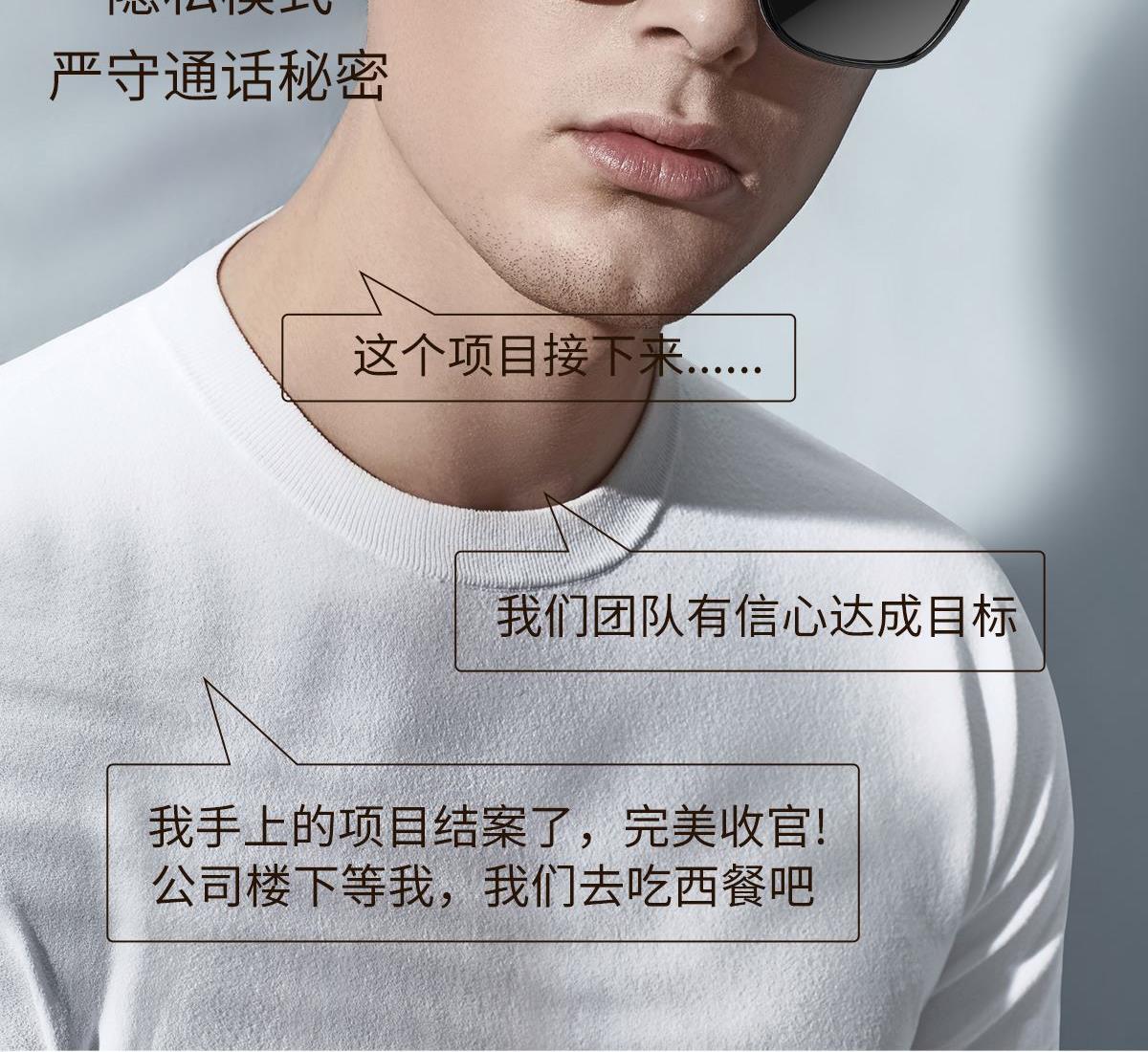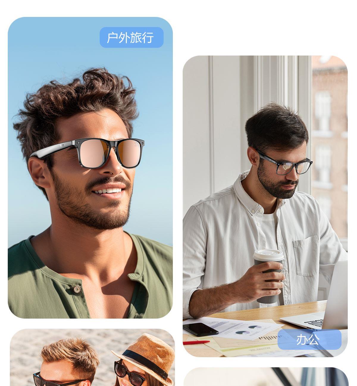 产品功能:AI对话、AI智能翻译(翻译机模式,眼镜+手机翻译模式,可翻译定制134多种语言)语音笔记、助眠模式、拍照翻译、遥控拍照、蓝牙通话、智能霍尔感应自动开关机,智能语音助手、音乐播放(切换、暂停音乐欣赏)、遥控拍照、使用低功耗AB5712F低功耗芯片,续航持久、25g轻质重量无感佩戴舒适、可配置墨镜、蓝光、近视等多种镜片;