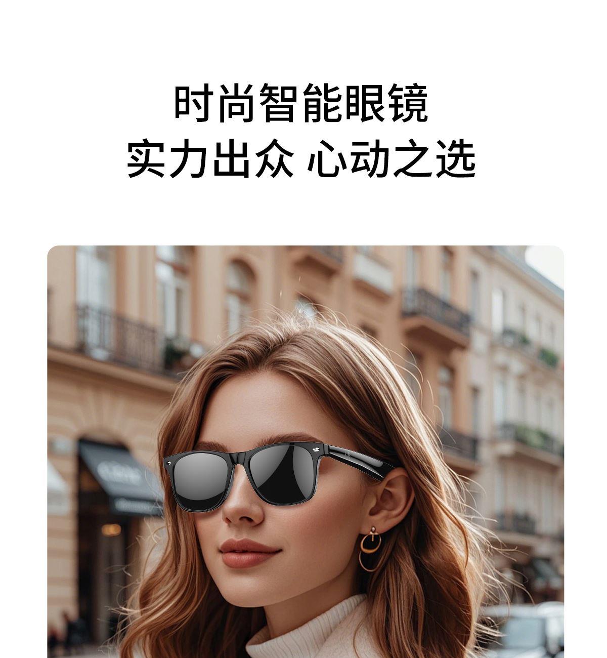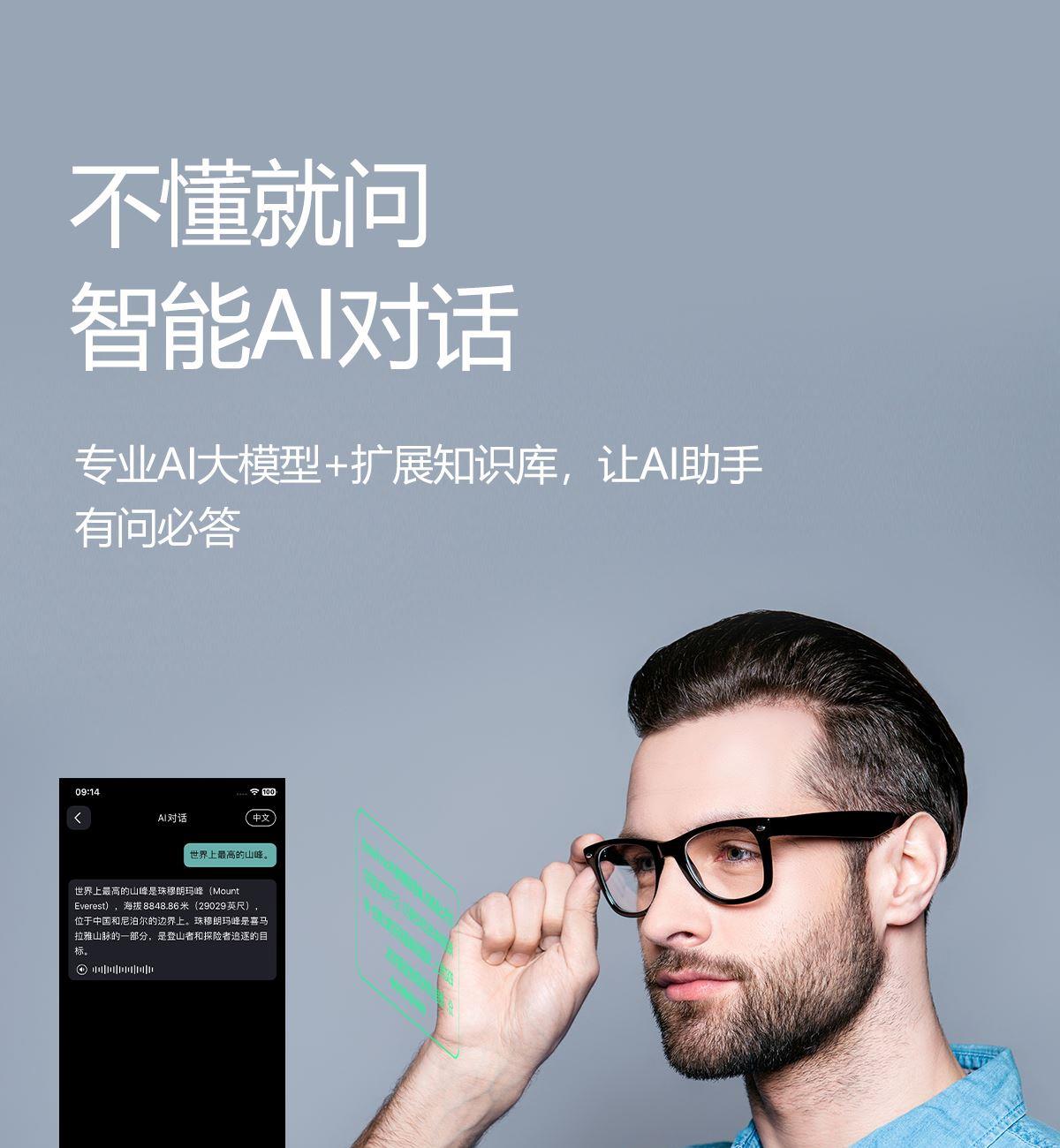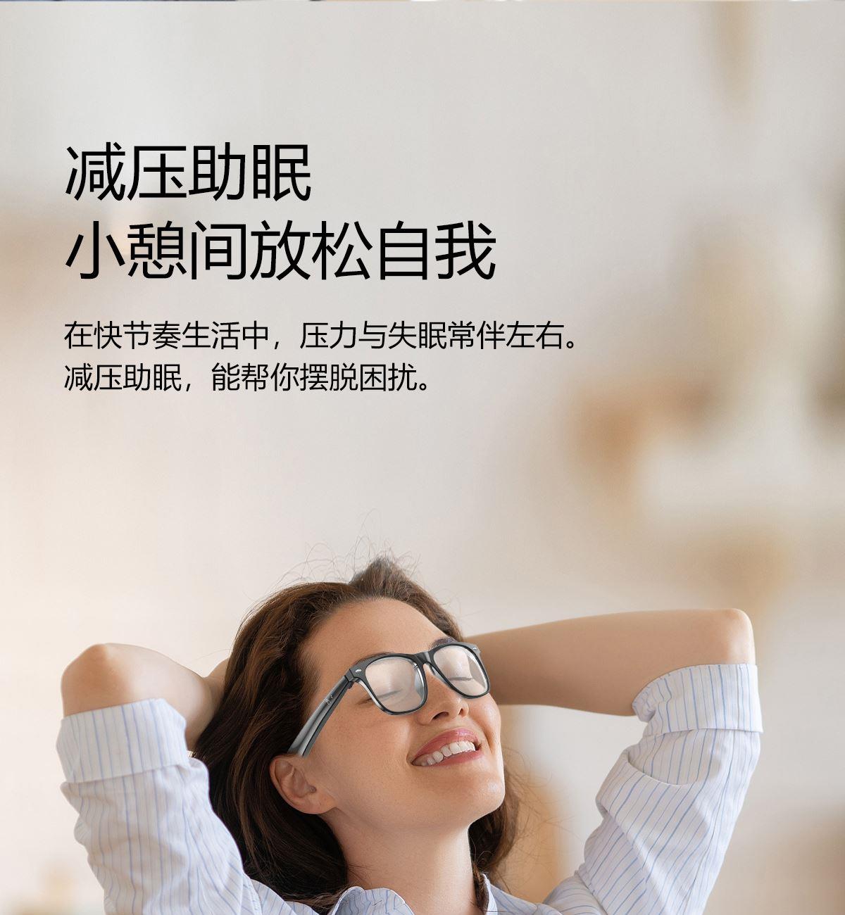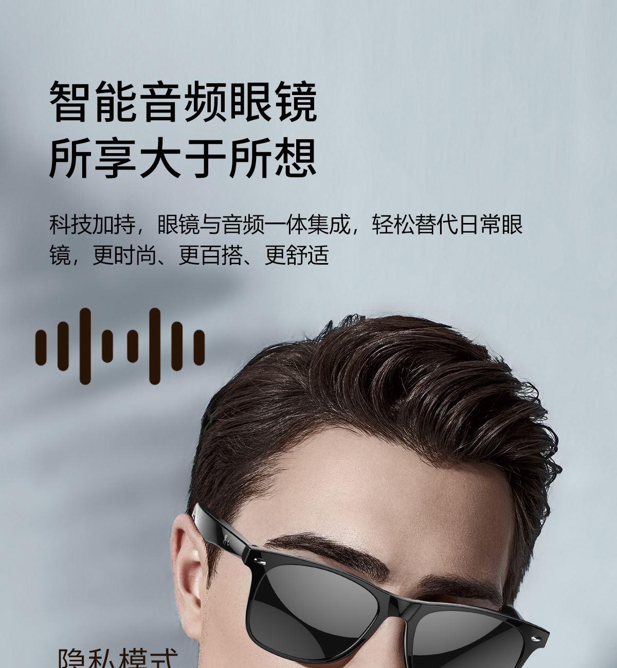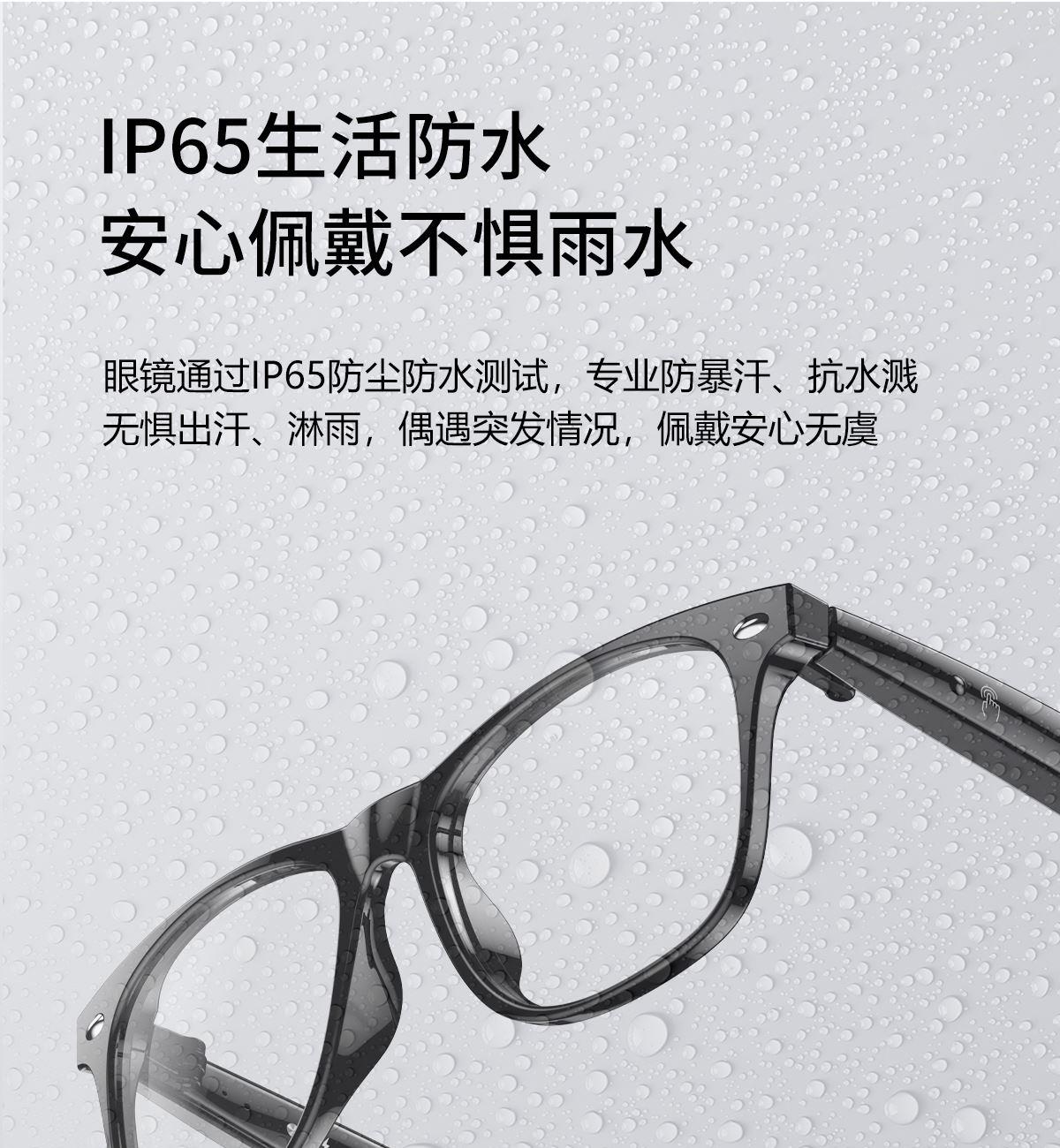 产品功能:AI对话、AI智能翻译(翻译机模式,眼镜+手机翻译模式,可翻译定制134多种语言)语音笔记、助眠模式、拍照翻译、遥控拍照、蓝牙通话、智能霍尔感应自动开关机,智能语音助手、音乐播放(切换、暂停音乐欣赏)、遥控拍照、使用低功耗AB5712F低功耗芯片,续航持久、25g轻质重量无感佩戴舒适、可配置墨镜、蓝光、近视等多种镜片;