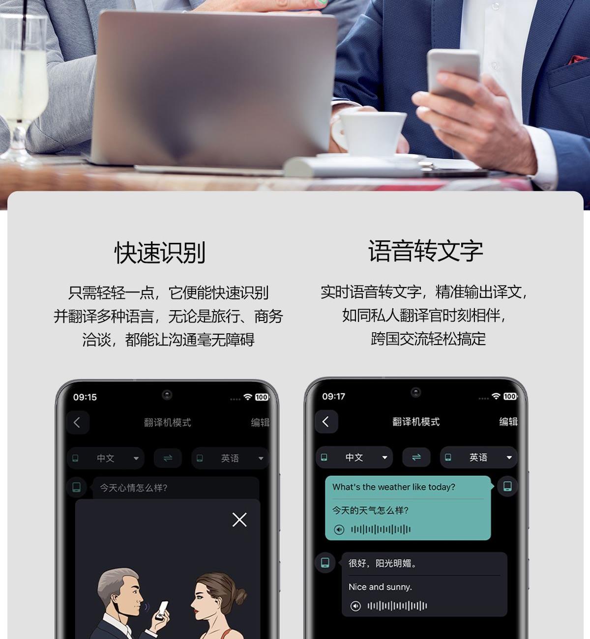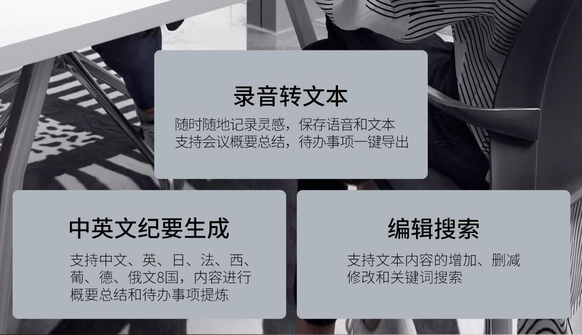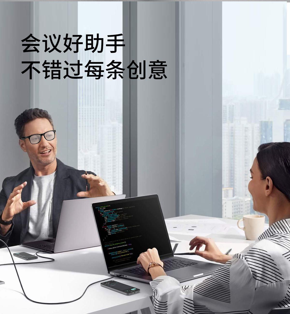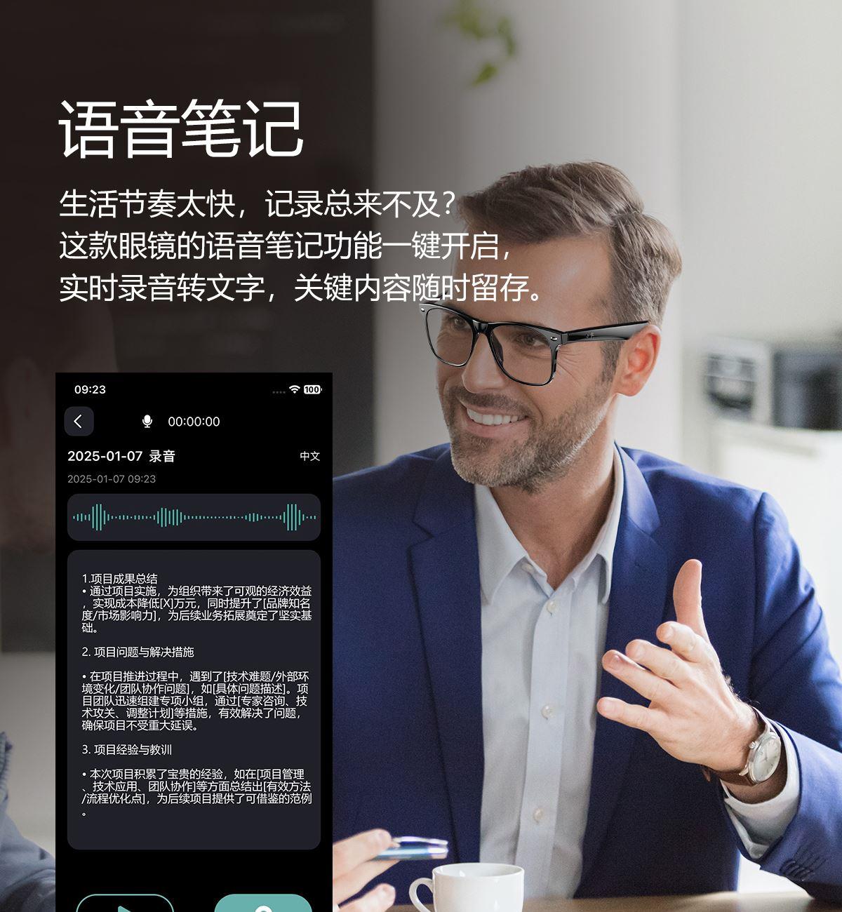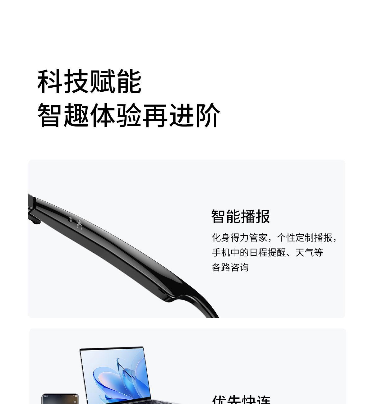 产品功能:AI对话、AI智能翻译(翻译机模式,眼镜+手机翻译模式,可翻译定制134多种语言)语音笔记、助眠模式、拍照翻译、遥控拍照、蓝牙通话、智能霍尔感应自动开关机,智能语音助手、音乐播放(切换、暂停音乐欣赏)、遥控拍照、使用低功耗AB5712F低功耗芯片,续航持久、25g轻质重量无感佩戴舒适、可配置墨镜、蓝光、近视等多种镜片;