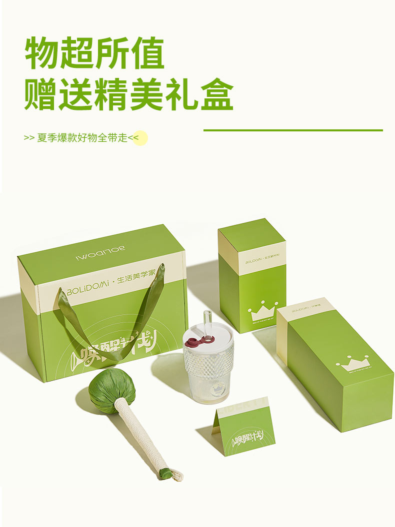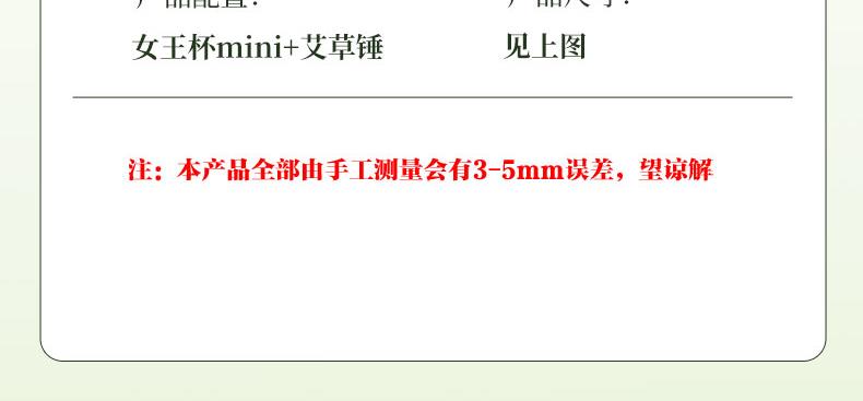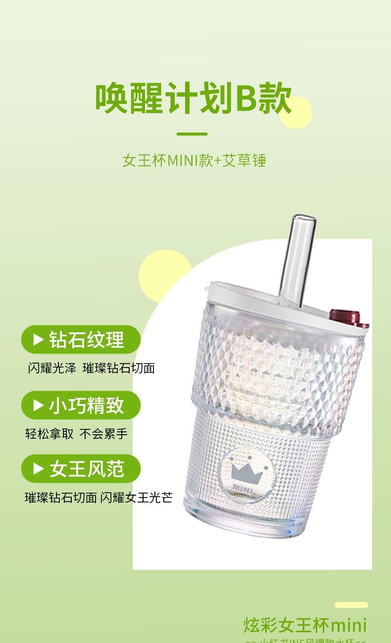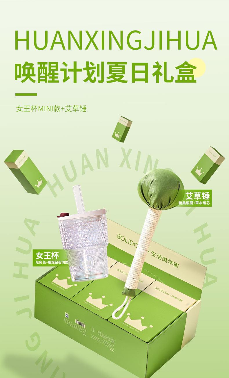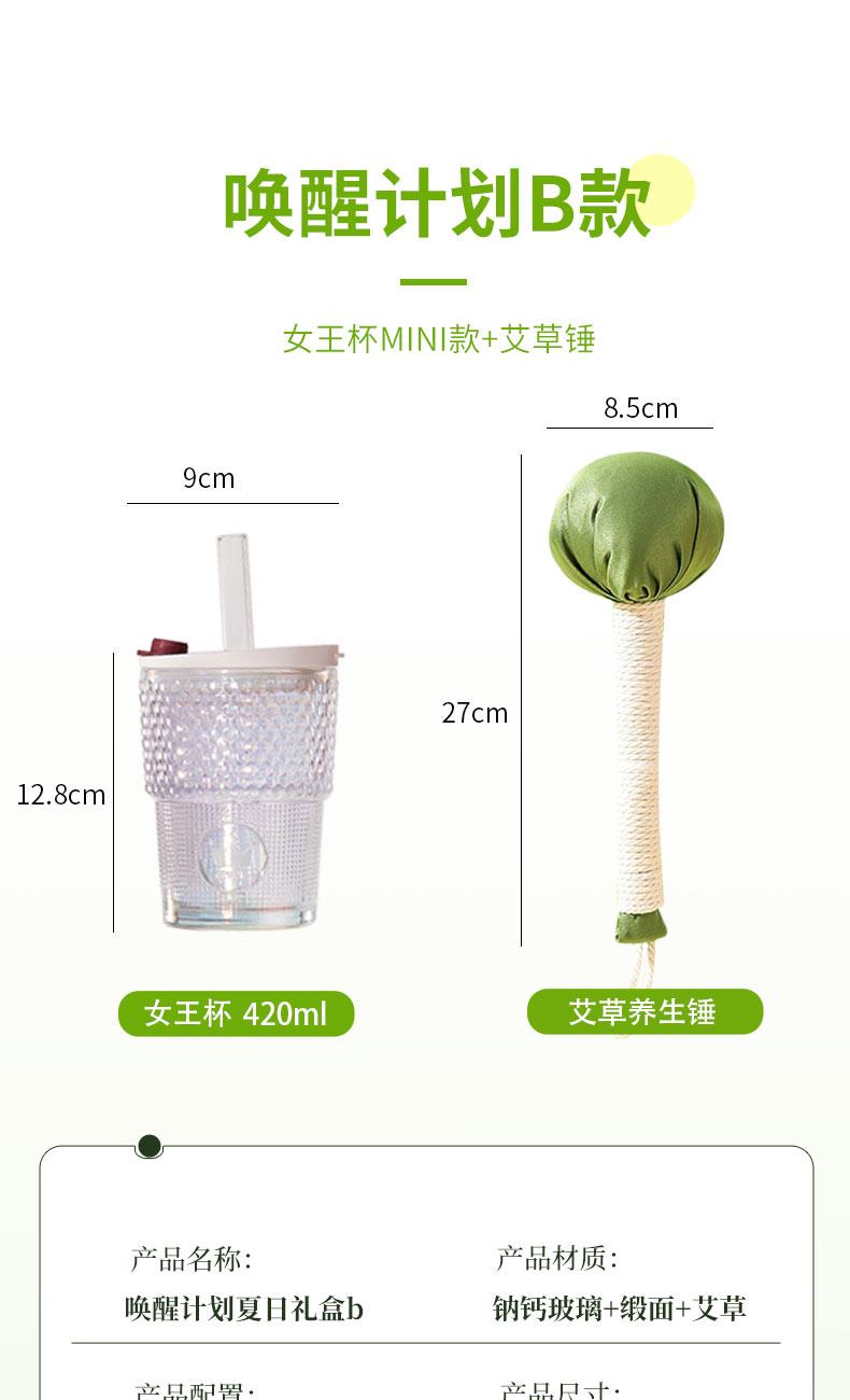 【组合】:水杯420ml*1 、艾草锤*1 【材质】:高白料钠钙玻璃、食品级PP、食品级硅胶、丝绸、艾草 【彩盒尺寸】:284*106*209mm 【外箱尺寸】:59*44*45cm 【毛重】:14KG 【69码】:6972526481714 产品卖点:行走的钻石艺术」--INS风钻石切割纹路设计,攻克传统水杯设计同质化痛点。黄金容量攻防战:420ML「奶茶VS温水」双场景通杀,单手可握设计破解大容量水杯笨重困局。 文化溢价:复刻故宫古法艾灸配方 五年陈艾:(比普通款多50%精油含量) 丝绸裹芯:优选丝绸面料包裹,与市面常规款拉开差异。