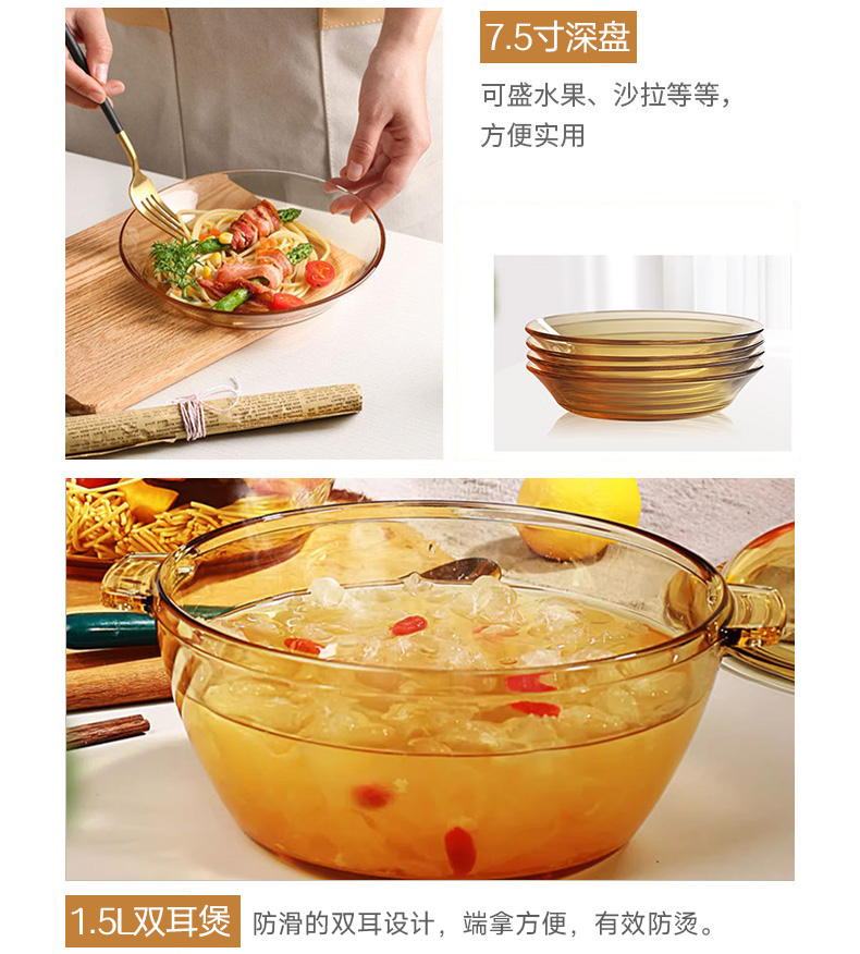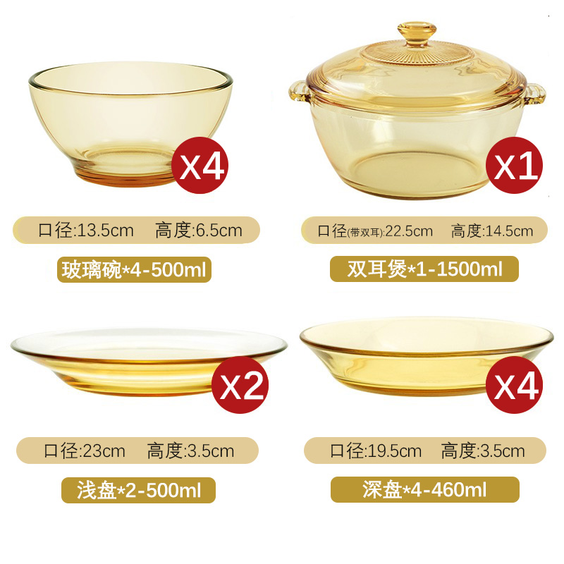 容量:玻璃碗500ml *4+深盘*4+浅盘*2+双耳煲1500ml*1 材质:高硼硅耐热玻璃 包装方式:彩盒包装 优势:高品质,低价位,样品支持,前端服务体系完善,售后无忧