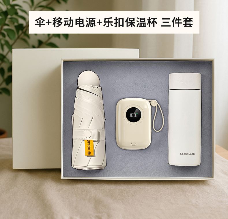 礼盒配置: 1、LOCK&LOCK 保温杯 316内胆 300ml 2、22.5W超级快充10000mAh自带线移动电源 3、21寸5折6骨钢胶囊伞(高密度碰击黑胶布) 4、包装盒尺寸:275x227x75mm 5、手提袋尺寸:286x260x85mm 6、颜色:米白色 7、重量:25kg/箱