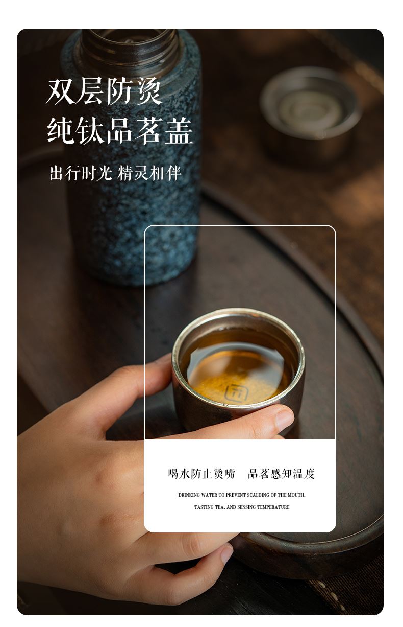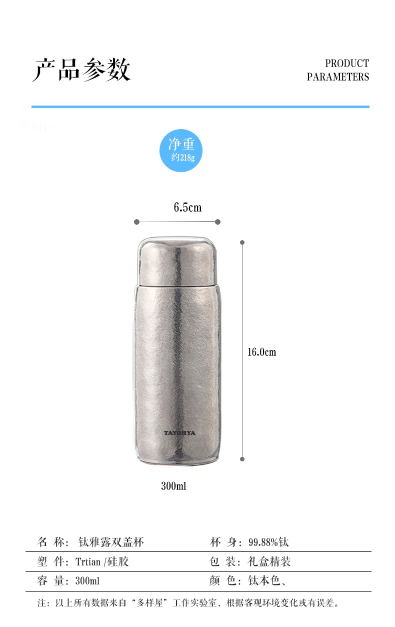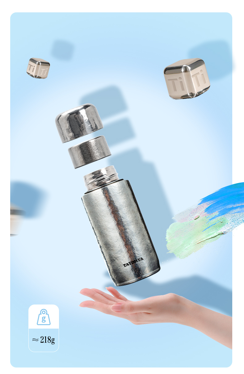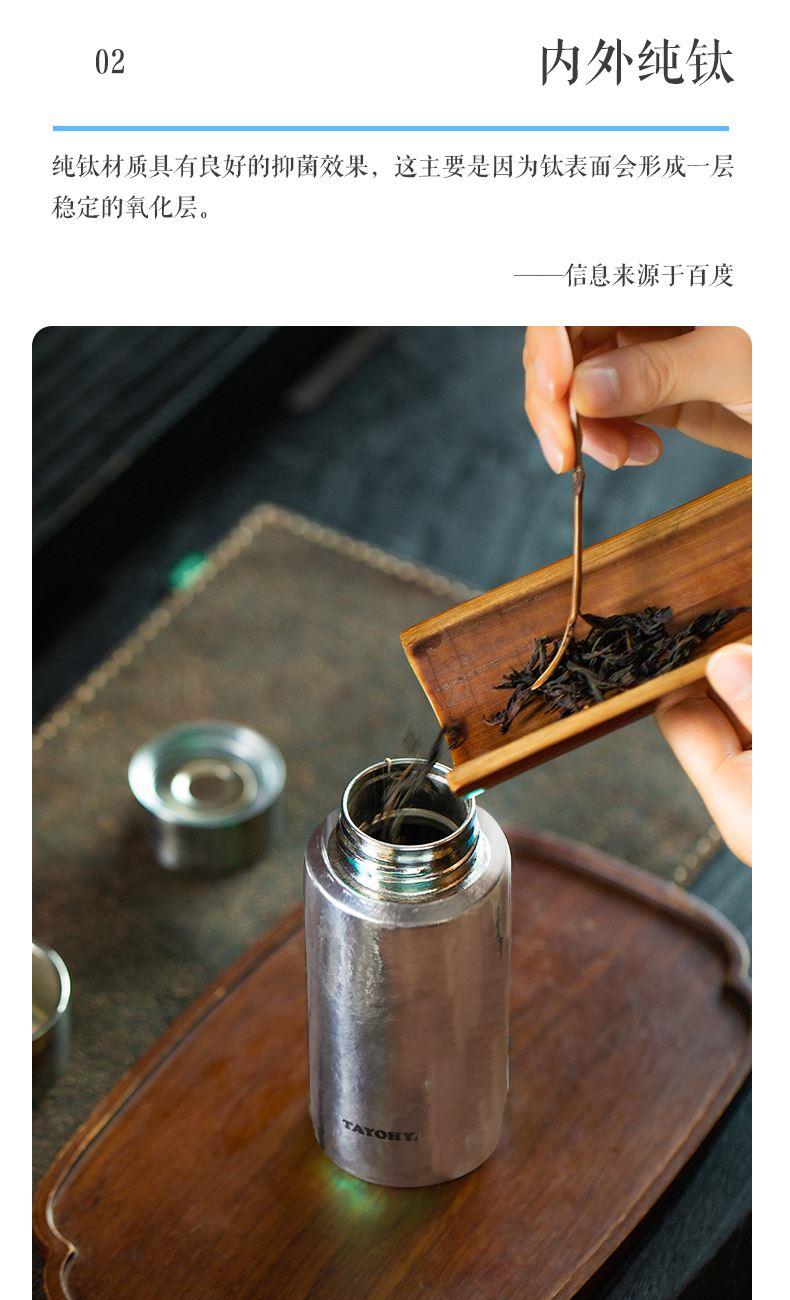容 量: 300ml 金属材质:99%纯钛(Ti) 包装方式:礼盒包装 1. 钛含量99.88%,纯度高,更保鲜,同时钛具有良好的yijun效果。 2. 钛的耐腐蚀性极强,可盛装各种冷热酸碱饮品。 3. 茶漏+双盖设计,外盖可做小茶杯,享受养生茶。 4.保温保冷;密封防漏。