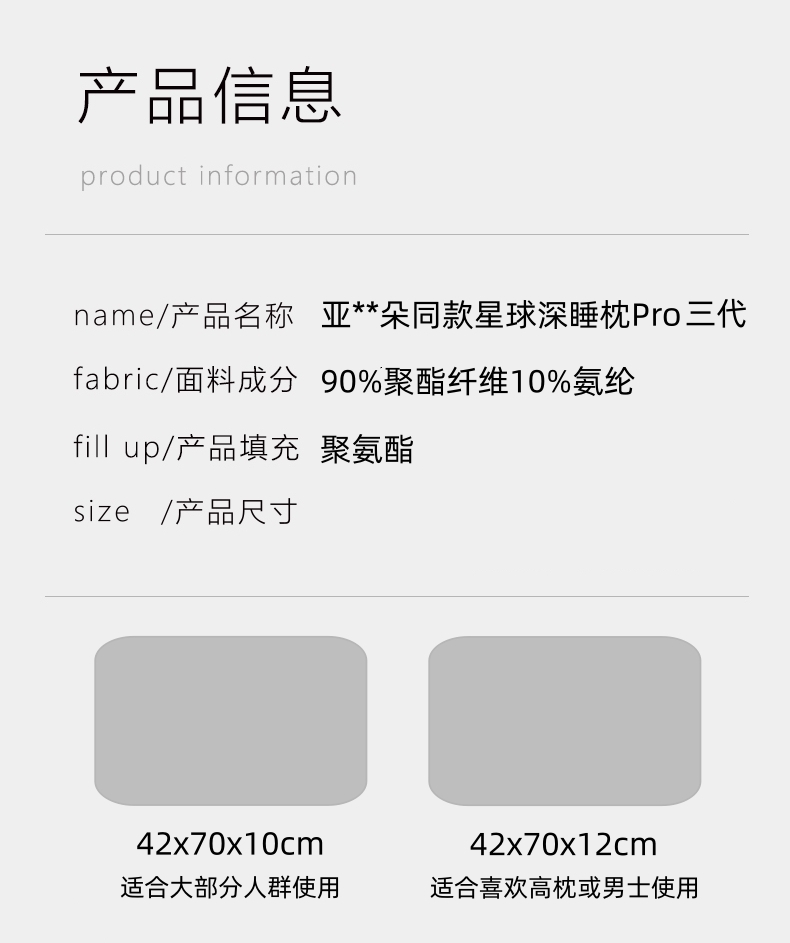 规格:42*70-10cm 面料:90%涤纶 10%氨纶 填充:聚氨酯 A类母婴级面料;精选优良抗压记忆棉,密度更均匀,枕芯软而不塌,奶油般柔润舒适睡感减少对肩颈的挤压,弹性十足自由翻滚零压回弹,支撑力强,解放睡姿轻松入眠;仰侧皆宜;云感裸肌涤氨冰丝面料,舒适细腻,柔软亲肤,吸湿透气裸睡佳品。