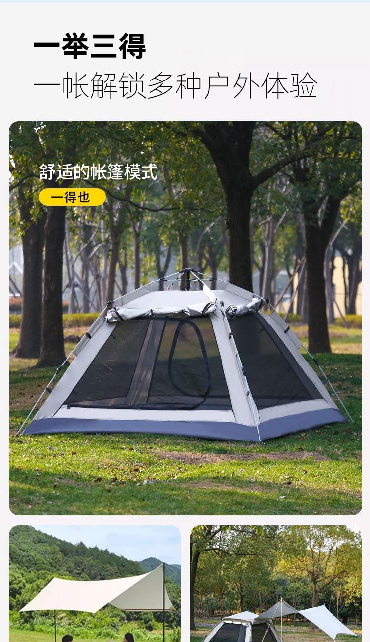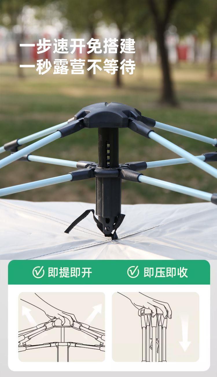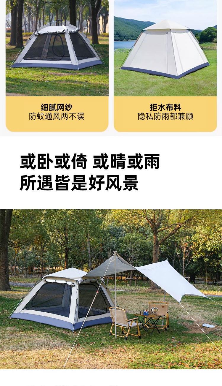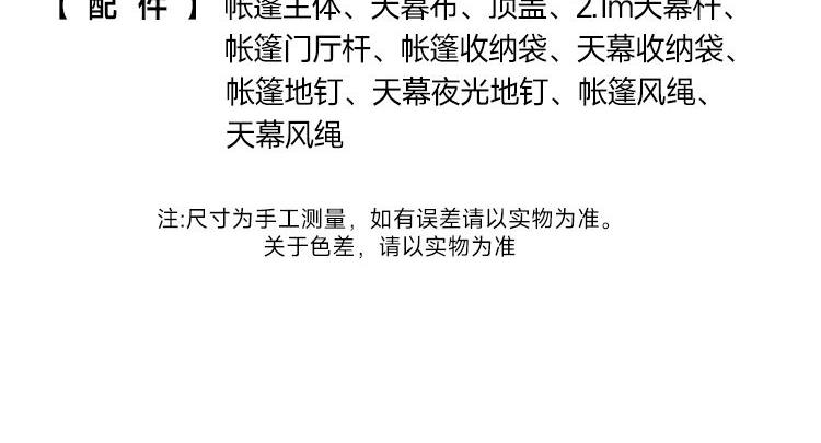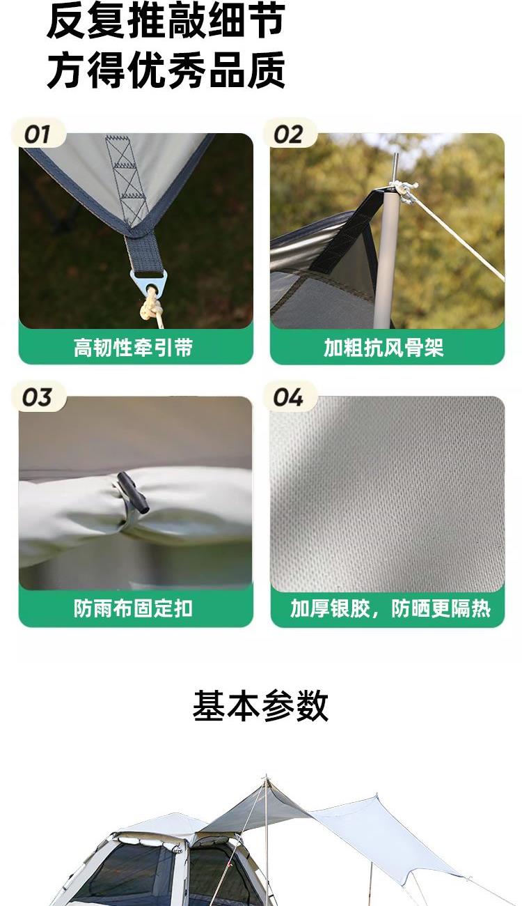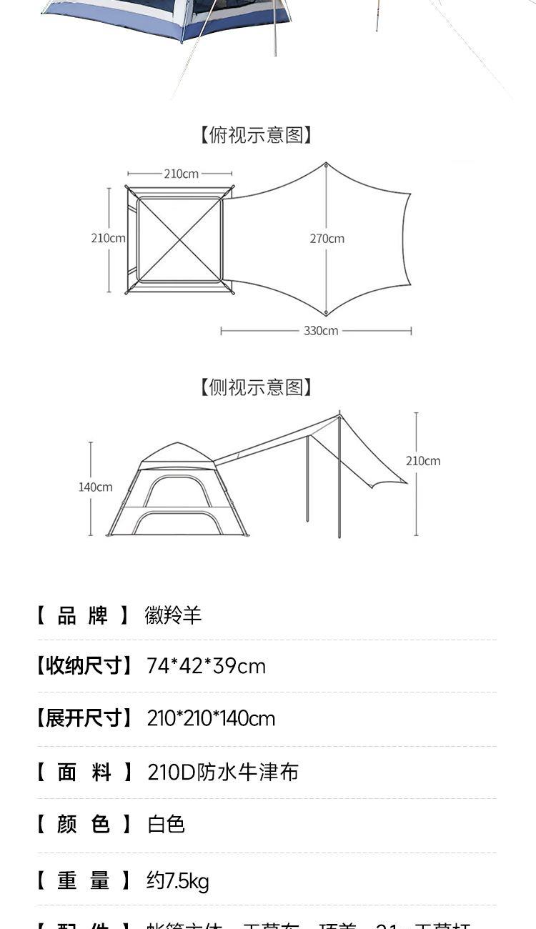货号:HLY-ZP-25001 展开尺寸:210*210/330*140cm 收纳尺寸:74*42*39cm 重量: 约7.5kg 帐篷结构:单层帐,颜色:白色 液压速开,全自动免搭建,一提即可展开;外帐可做沙滩天幕,一帐多用,随机切换满足多种需求 告别闷热环境,宽大高密度网纱双门设计,透气防蚊 宽大空间,可容纳3-4人,畅享一家人舒适露营;强韧防风骨架防断更安全
