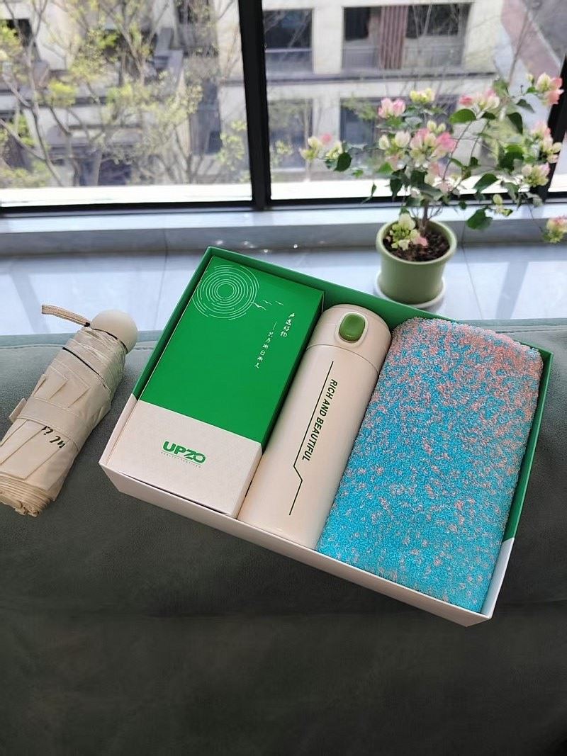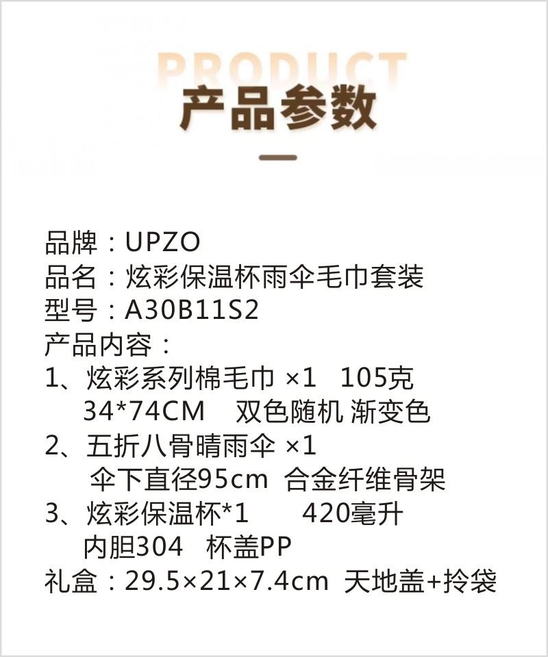 型号: A8B11S2 产品内容: 1、炫彩系列棉毛巾×1 34*74CM 105克 精梳棉 2、大号晴雨伞 ×1 五折八骨 伞下直径95CM 3、炫彩保温杯 ×1 420毫升容量 内胆304 杯盖PP 礼盒: 29.5×21×7.4cm 天地盖+拎袋 1、炫彩系列毛巾精选精梳棉材质结合色织工艺 优质且靓丽 2、420毫升高颜值保温杯 304内胆 精美设计文案 3、大号晴雨伞主题设计融入 五折八骨大伞 外观靓丽 实用性强