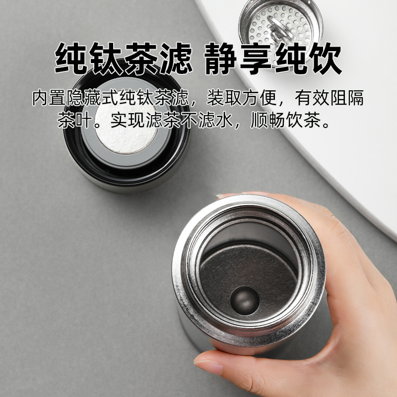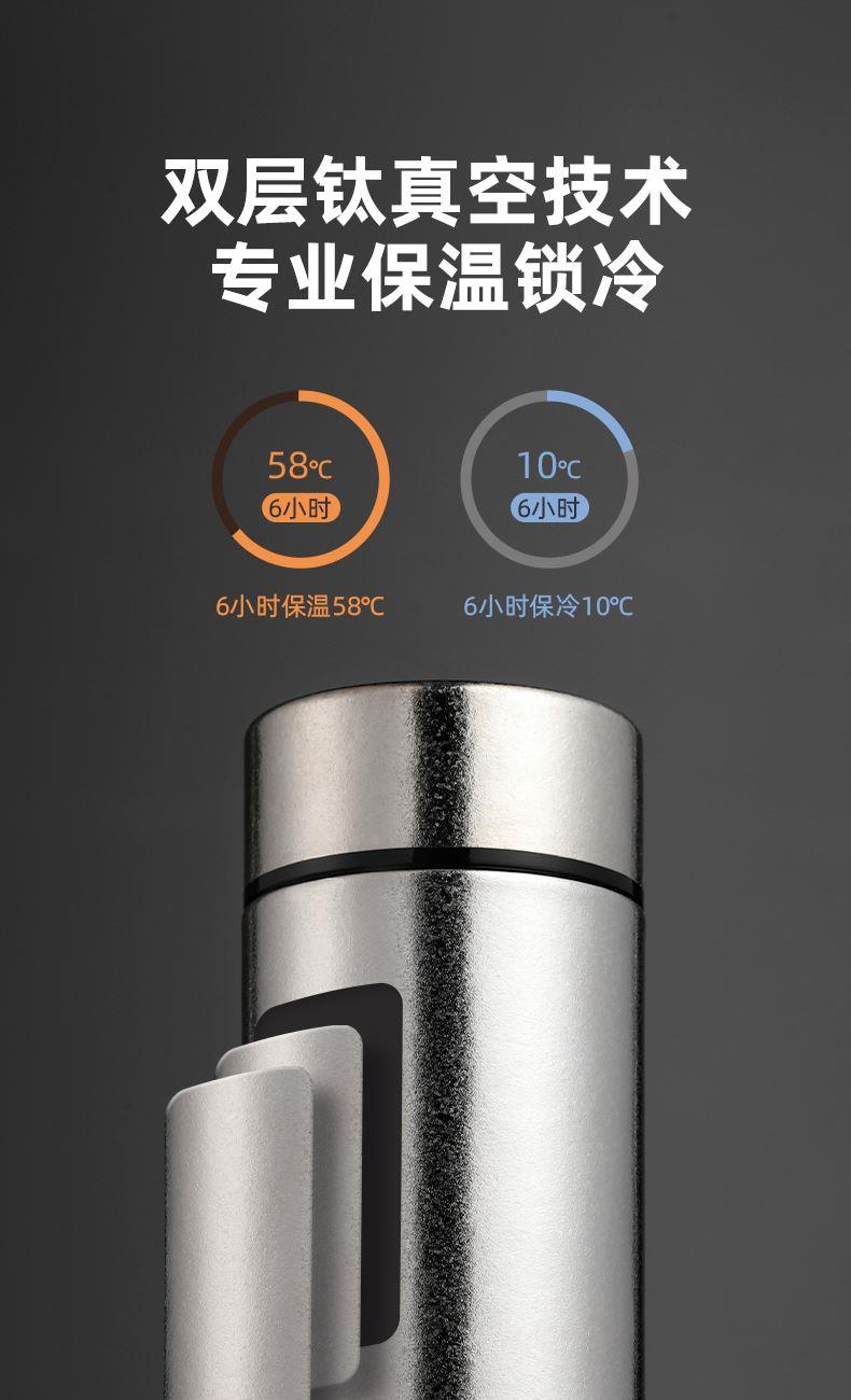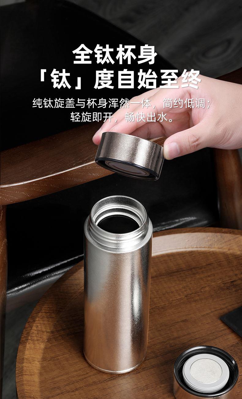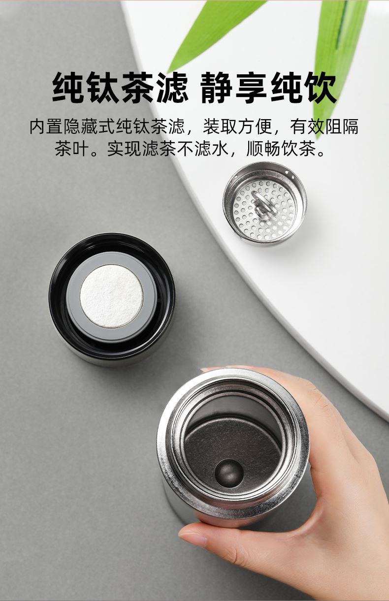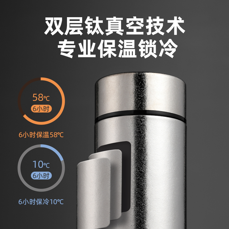 产品材质:钛 杯身样式:直身杯 产品容量:470ml 产品尺寸:68*212mm 颜色分类:皓月银, 高颜值,带茶水分隔,携带方便,适用于多种场合,冰花质感,无重金属析出、耐酸碱、耐腐蚀、不含磁、易清洁、抑制细菌保鲜时长可5-7天,杯身外观自然成色,不使用一滴颜料,不存在掉色、“铅”超标等问题