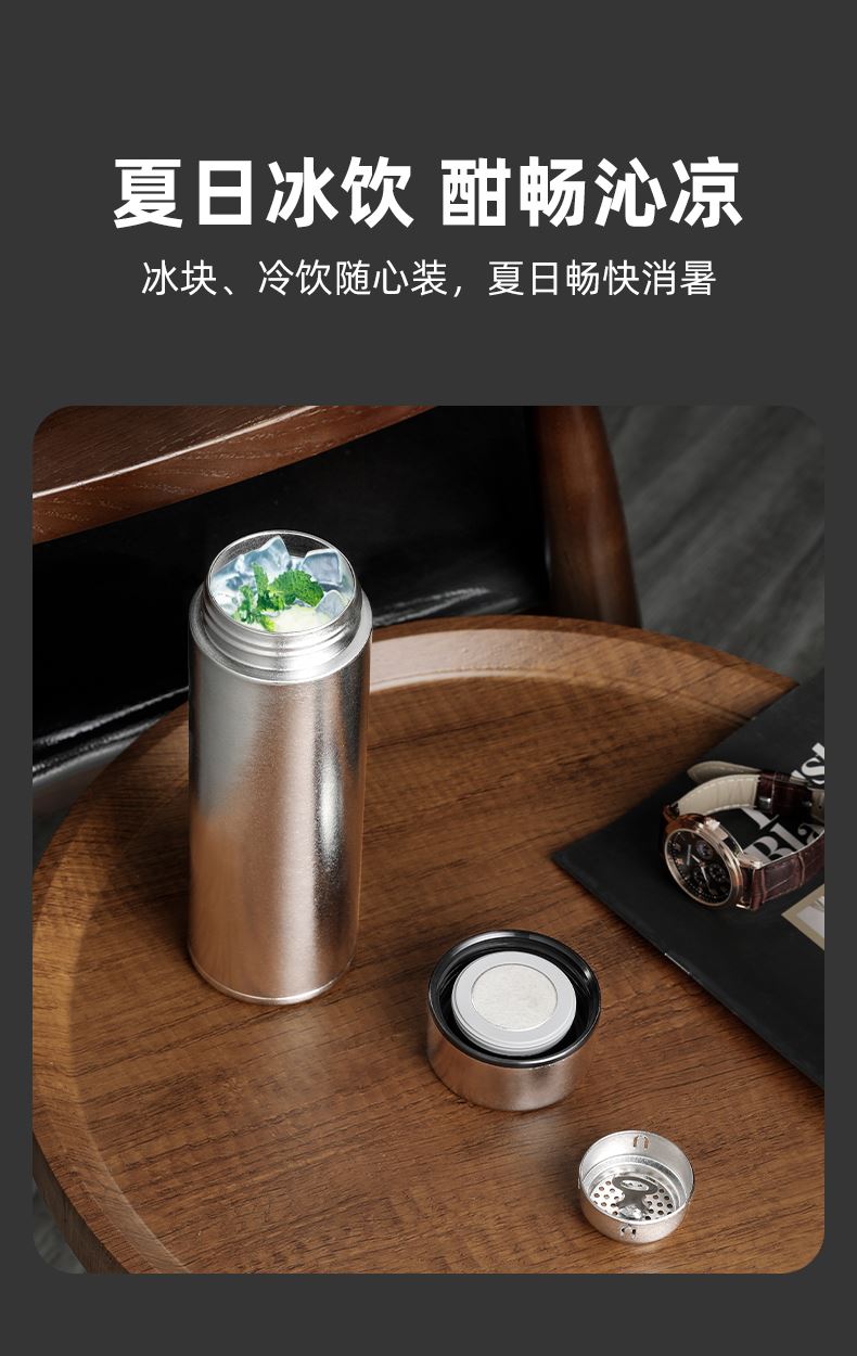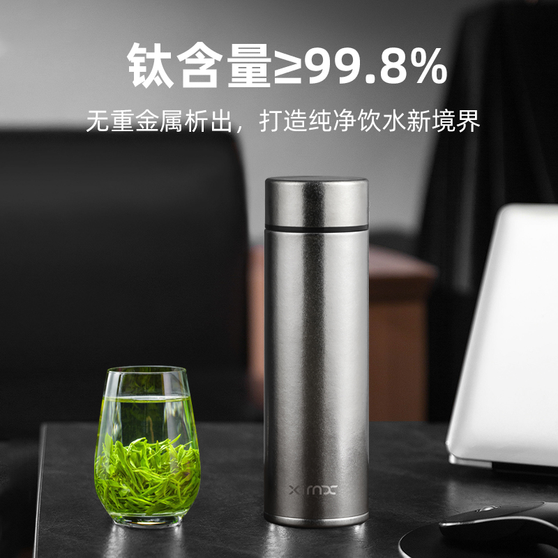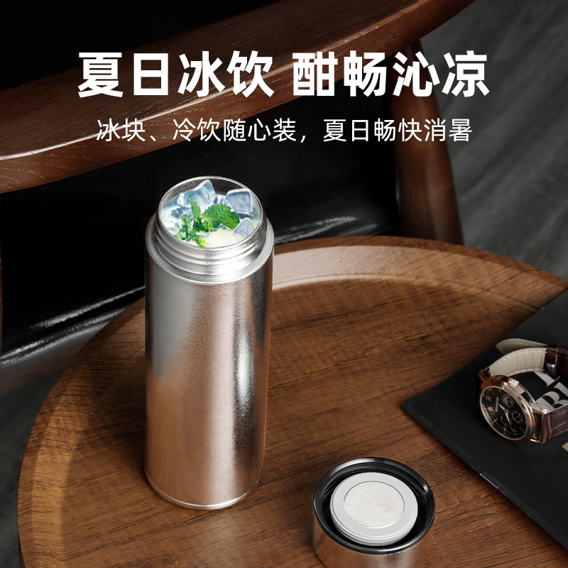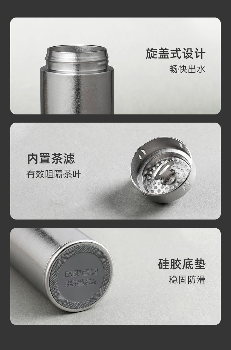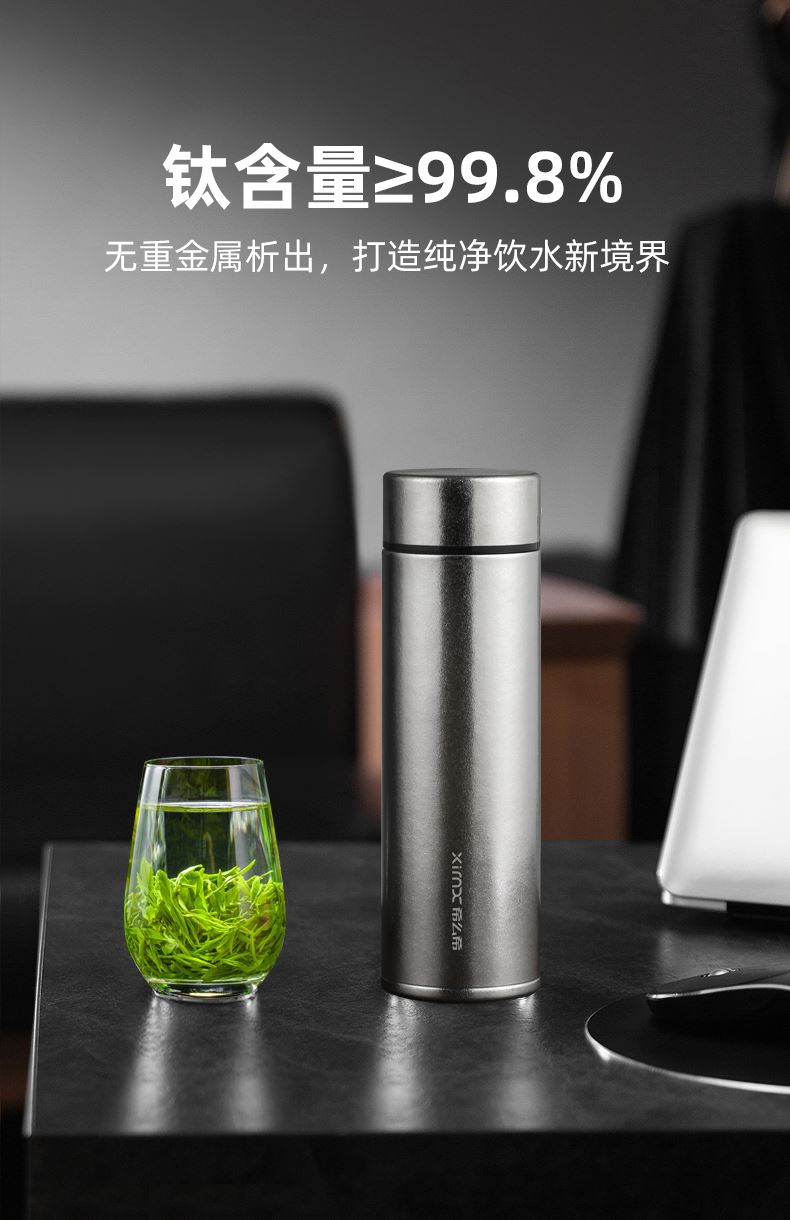 产品材质:钛 杯身样式:直身杯 产品容量:470ml 产品尺寸:68*212mm 颜色分类:皓月银, 高颜值,带茶水分隔,携带方便,适用于多种场合,冰花质感,无重金属析出、耐酸碱、耐腐蚀、不含磁、易清洁、抑制细菌保鲜时长可5-7天,杯身外观自然成色,不使用一滴颜料,不存在掉色、“铅”超标等问题