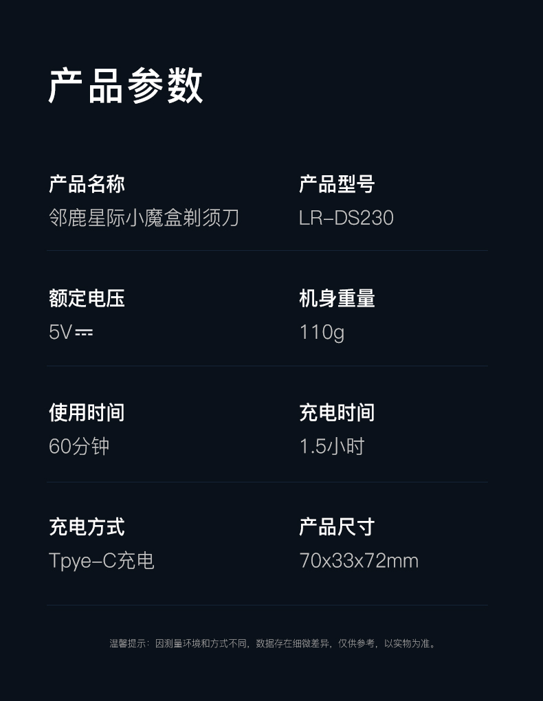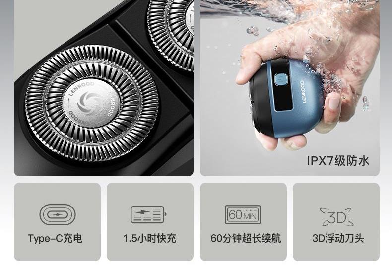 1、IPX7级防水,干湿双剃; 2、磁吸头盖,潮玩有趣,拆卸方便; 3、高清实时数码电量显示,低电量提示; 4、1.5小时快充,60分钟超长放电时间; 5、环保锂电池,Type-c充电,即插即用; 6、旅行锁功能,长按解锁,一键启动; 7、3D浮动刀头,智能防夹须; 8、高速电机马达,动力强劲; 9、自研磨刀片,切剃更锋利; 10、大气礼盒包装。