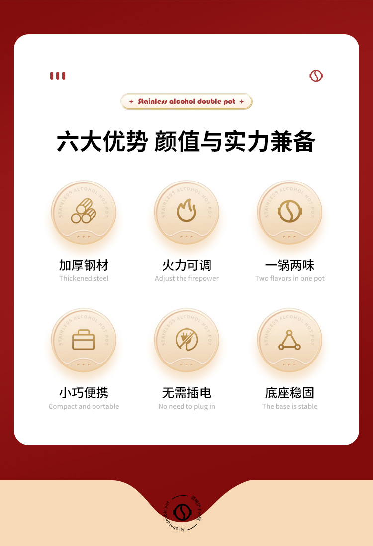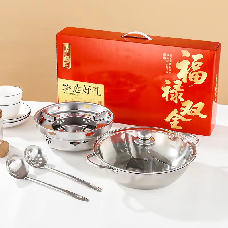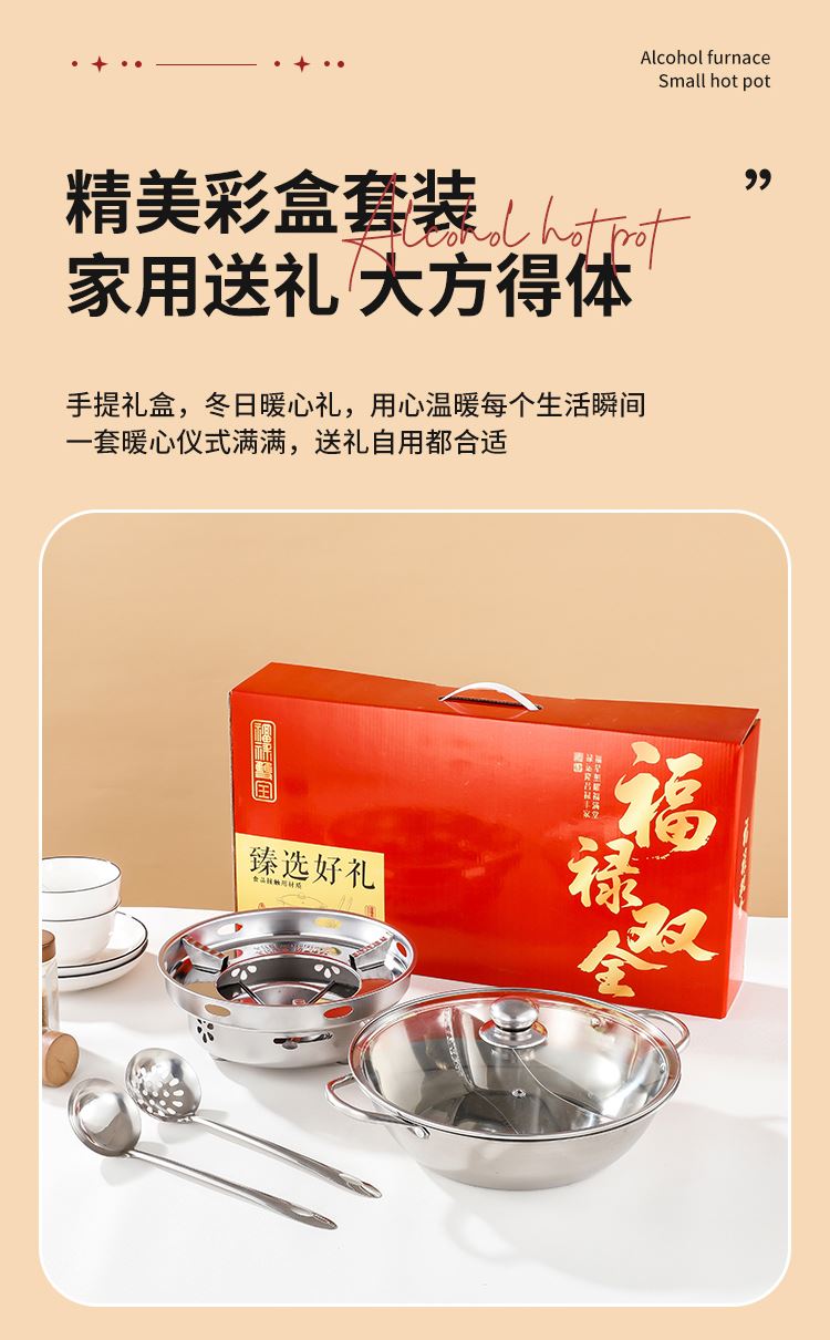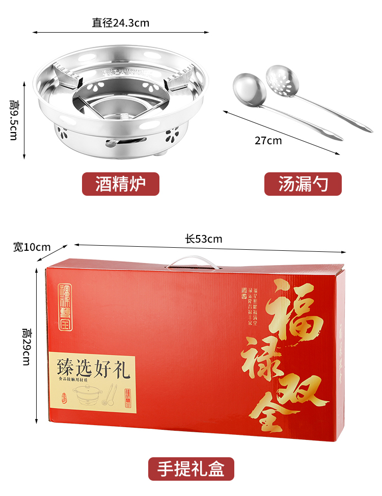 产品规格:28cm鸳鸯锅➕酒精炉➕汤勺➕漏勺 产品材质:201不锈钢 彩盒尺寸:52.5*10*28.5CM 外箱尺寸:64*54*59 cm 福禄双喜,汤勺捞福,漏勺添财,红红火火团团圆圆, 火锅二味分隔设计满足不同口味需求,酒精炉加热保持温度稳定 搭配不锈钢汤勺漏勺,冬天涮火锅实用又美味~ 超大礼盒包装,客情维护,促销储值礼品,低成本高价值。
