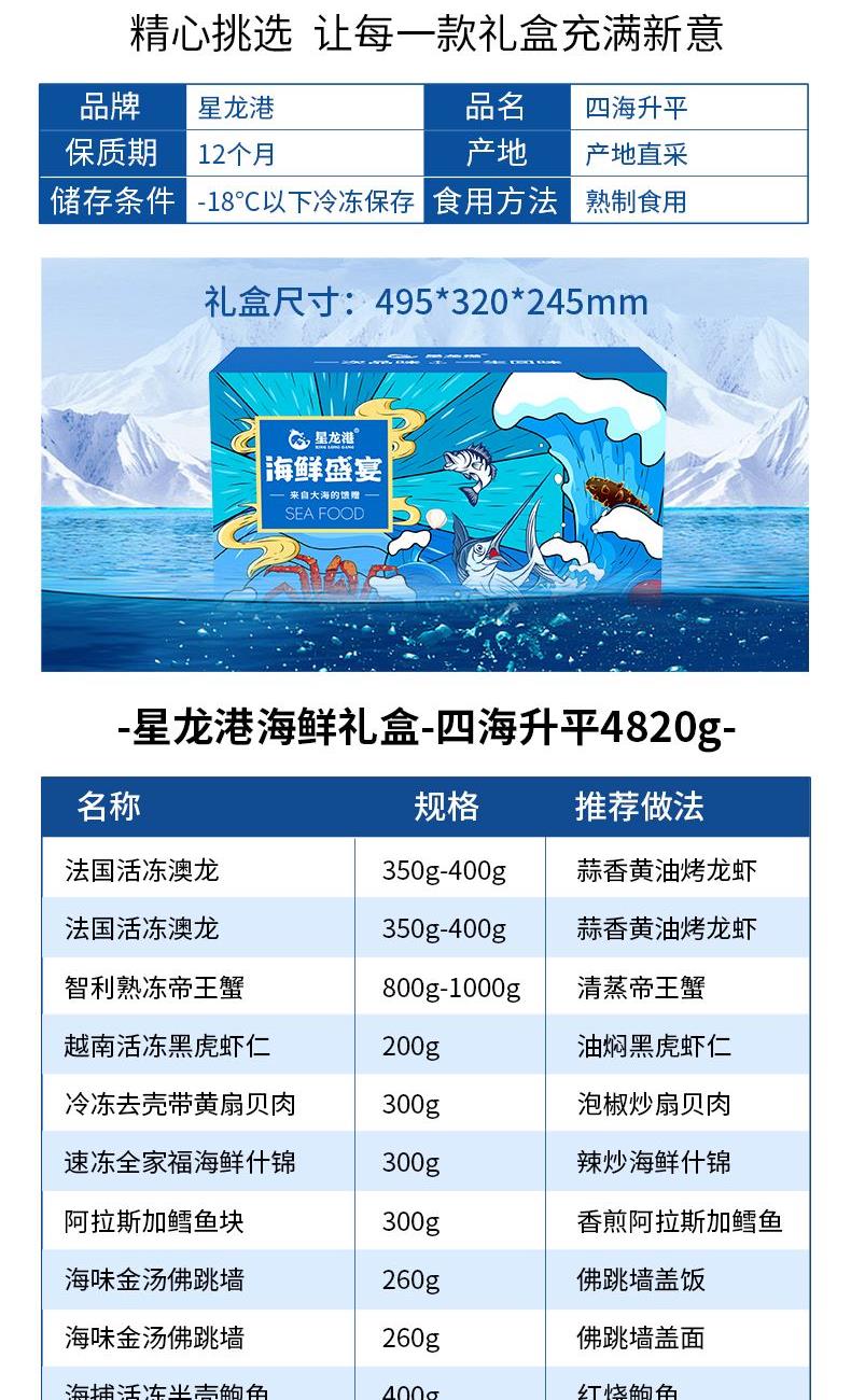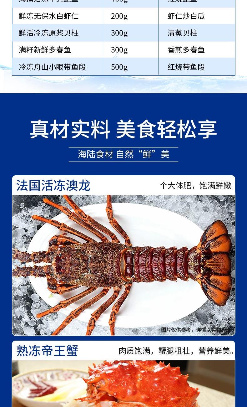 法国活冻澳龙350g-400g 法国活冻澳龙350g-400g 智利熟冻帝王蟹800g-1000g 越南活冻黑虎虾仁200g 冷冻去壳带黄扇贝肉300g 速冻全家福海鲜什锦300g 阿拉斯加鳕鱼块300g 海味金汤佛跳墙260g 海味金汤佛跳墙260g 海捕活冻半壳鲍鱼400g 鲜冻无保水虾仁200g 鲜活冷冻原浆贝柱300g 满籽新鲜多春鱼300g 冷冻舟山小眼带鱼段500g