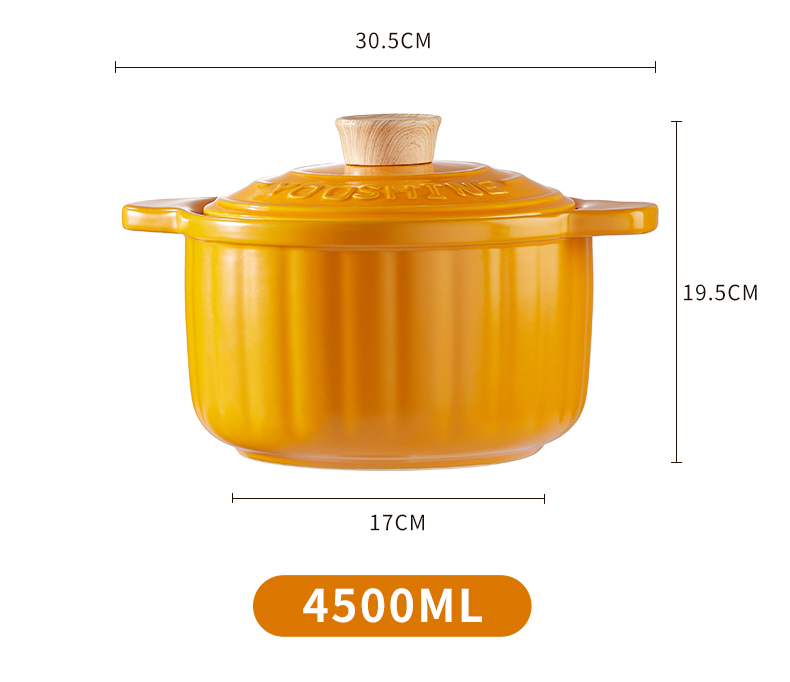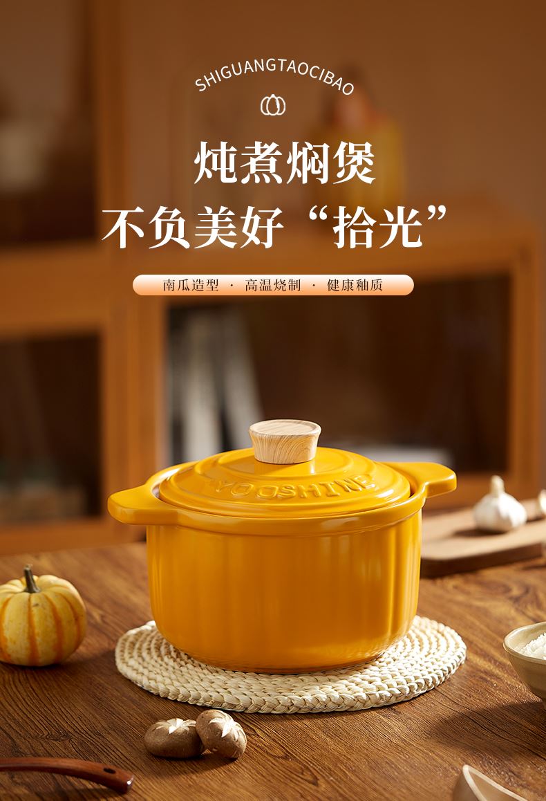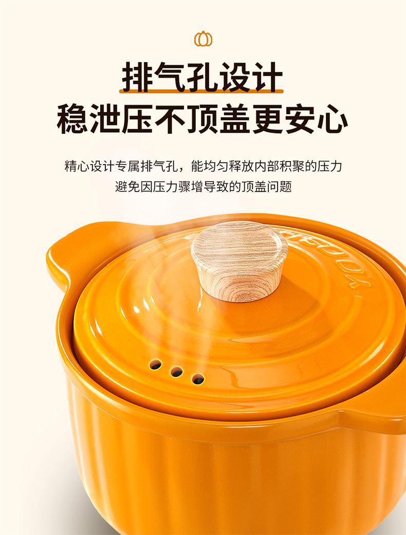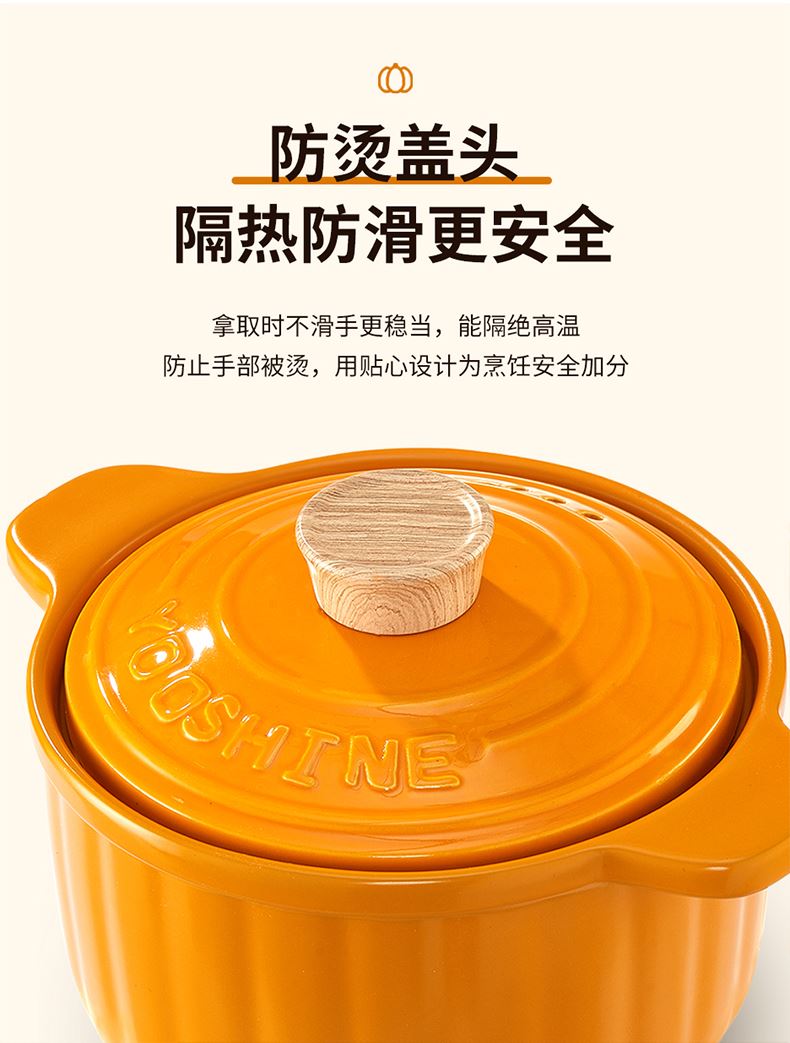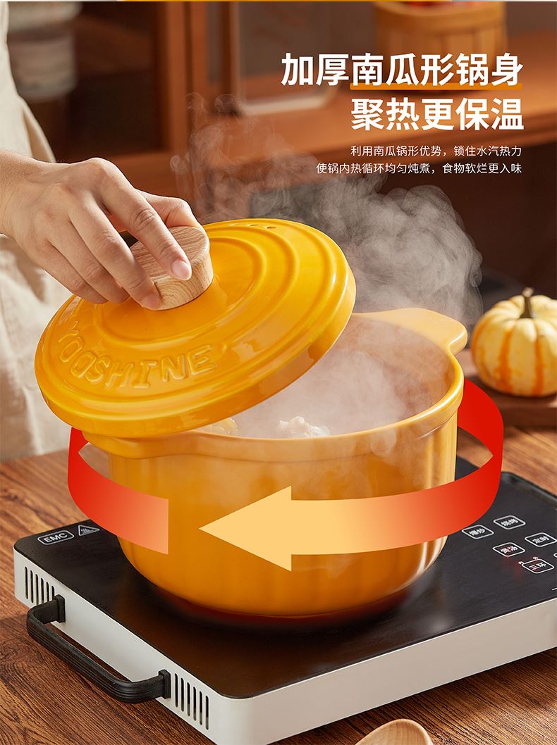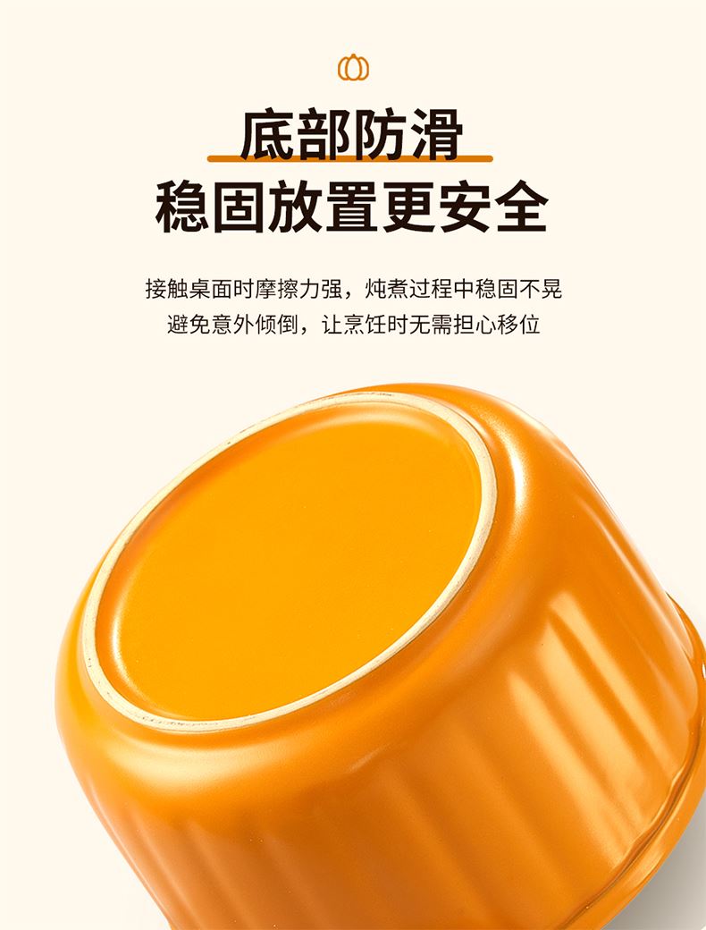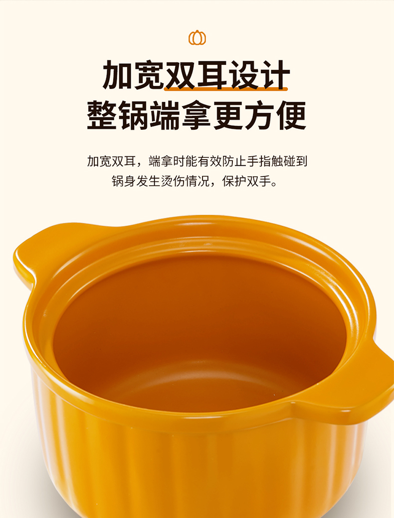 材 质:陶瓷 产品参数:陶瓷煲4500ml 彩盒尺寸:269*235*345mm 外箱尺寸:72.3*55.4*36.1cm 产品卖点:1. 真火淬炼,坚固耐用:进口南非进口透锂长石,1300℃真火淬炼,冷热骤变400℃不裂! 2. 安心釉彩,健康相伴:食品级健康色釉,久用如新,安心入食。 3. 端拿稳当,轻松不烫:加宽防烫双耳,端拿稳稳当当。 4. 聚热锁温,美味更浓:加厚南瓜肚,聚热锁温,慢煨更香浓。