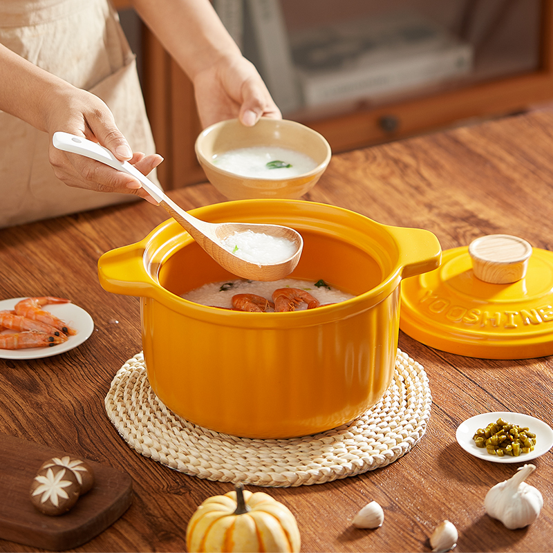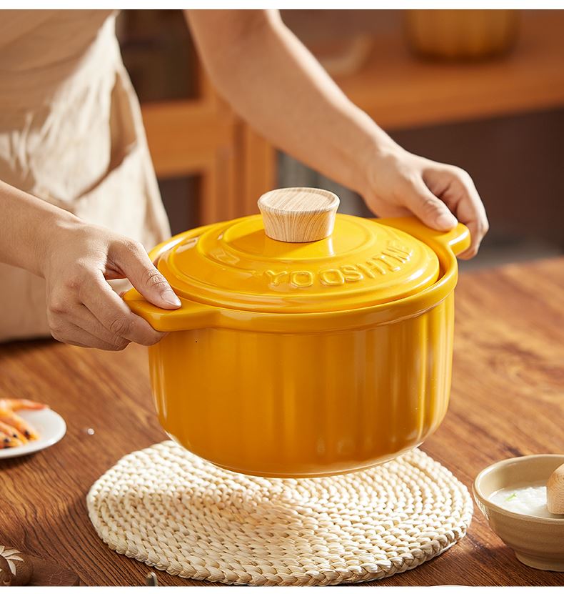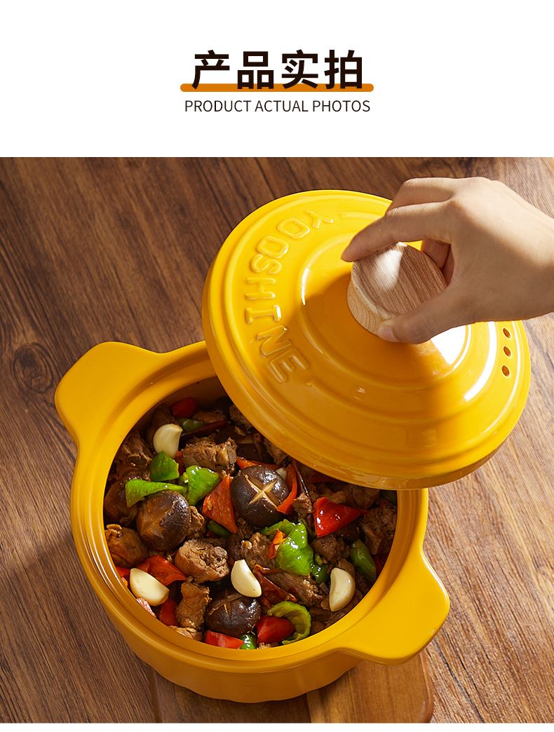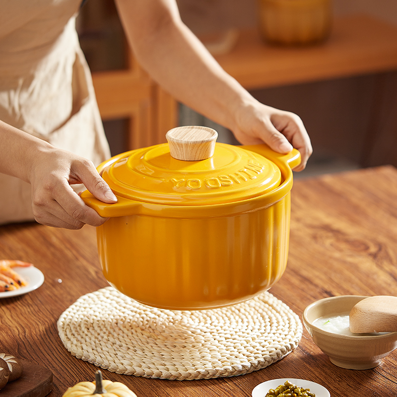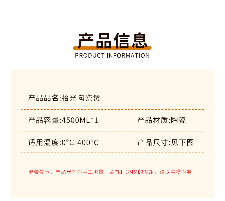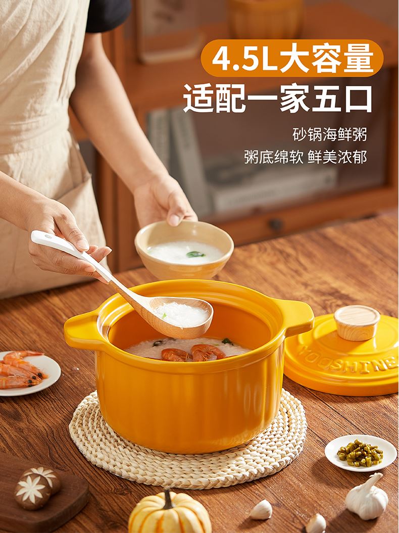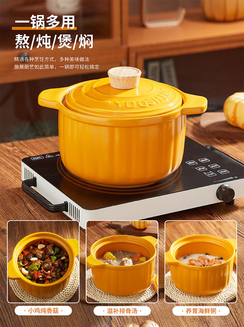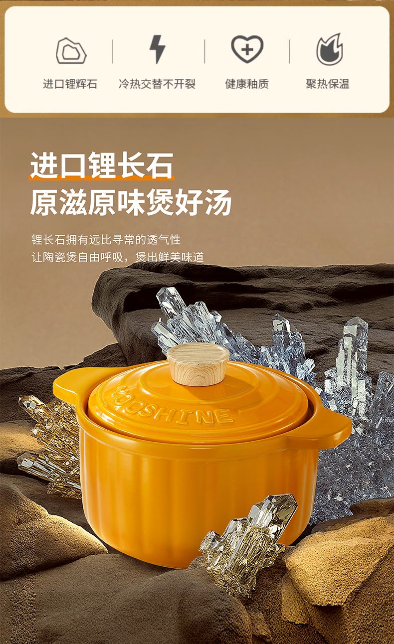 材 质:陶瓷 产品参数:陶瓷煲4500ml 彩盒尺寸:269*235*345mm 外箱尺寸:72.3*55.4*36.1cm 产品卖点:1. 真火淬炼,坚固耐用:进口南非进口透锂长石,1300℃真火淬炼,冷热骤变400℃不裂! 2. 安心釉彩,健康相伴:食品级健康色釉,久用如新,安心入食。 3. 端拿稳当,轻松不烫:加宽防烫双耳,端拿稳稳当当。 4. 聚热锁温,美味更浓:加厚南瓜肚,聚热锁温,慢煨更香浓。