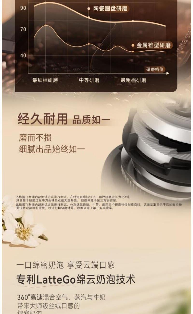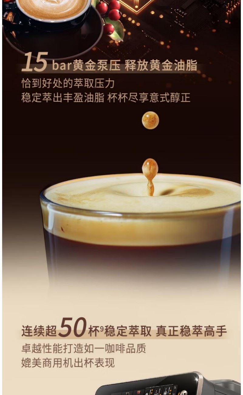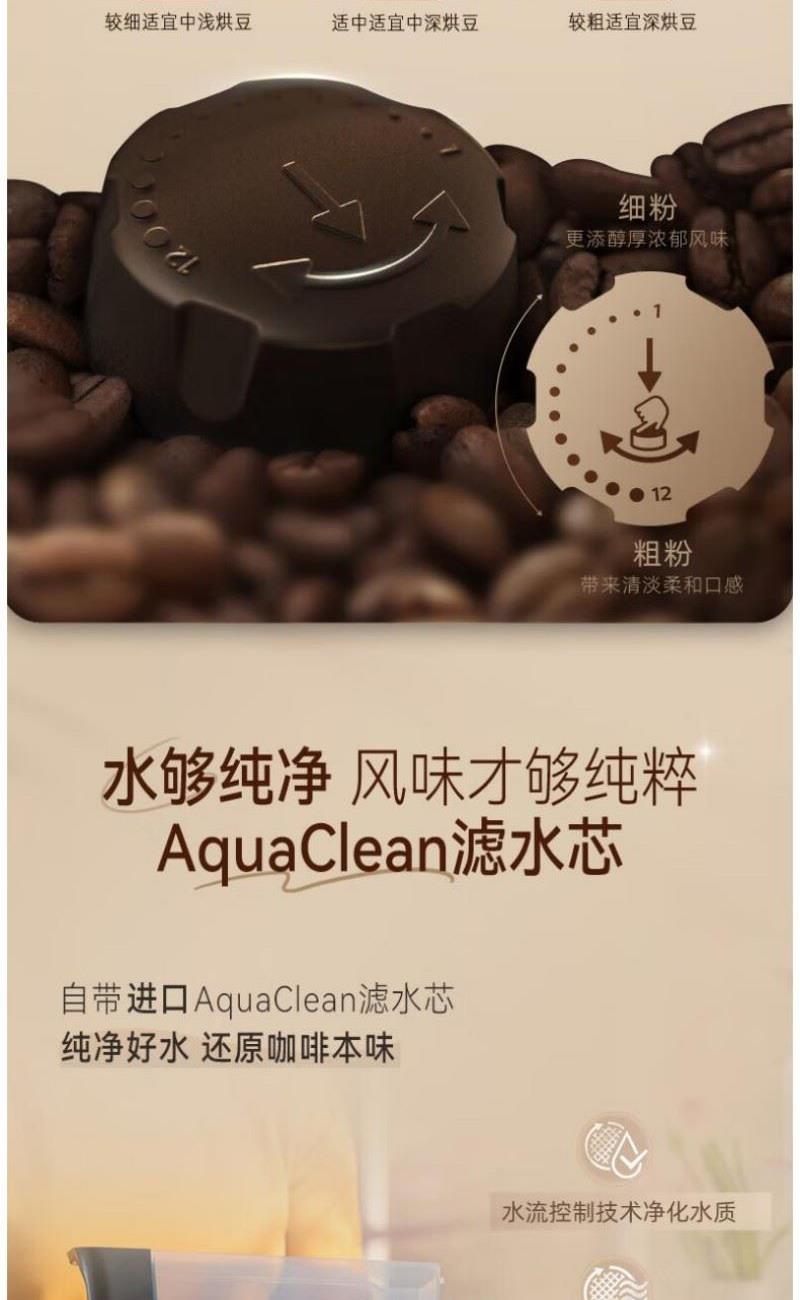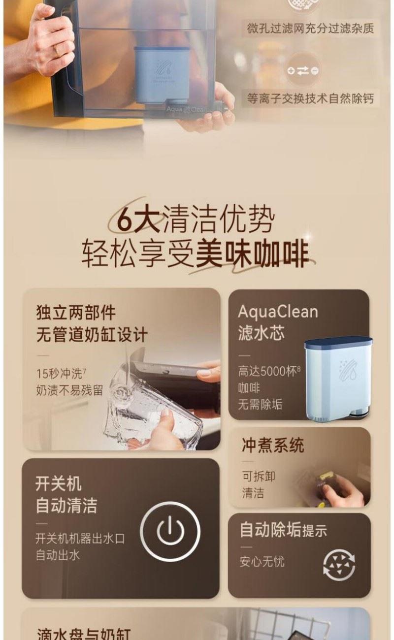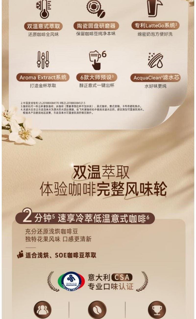 1、双温意式萃取,创新冷萃低温意式 2、LatteGo系统,绵云奶泡技术 3、AromaExtract系统,三档口味调节,定制你喜欢的咖啡口味 4、陶瓷圆盘研磨器 5、AquaClean滤水芯