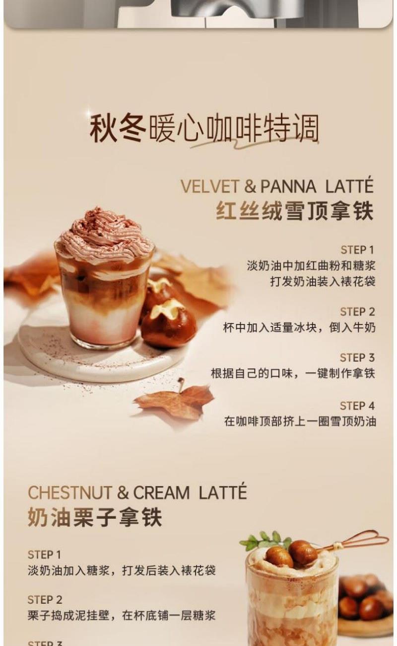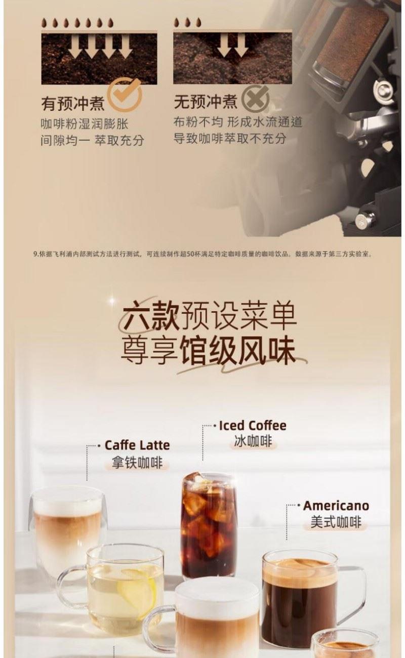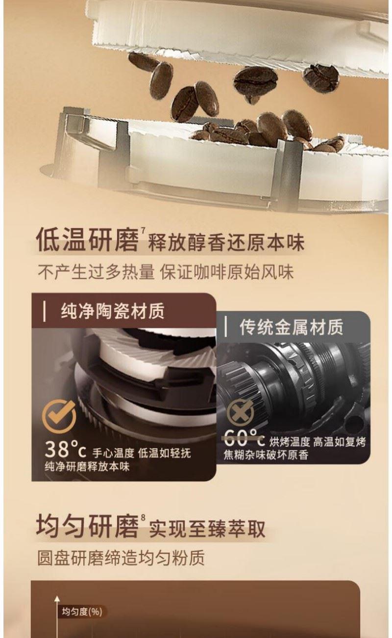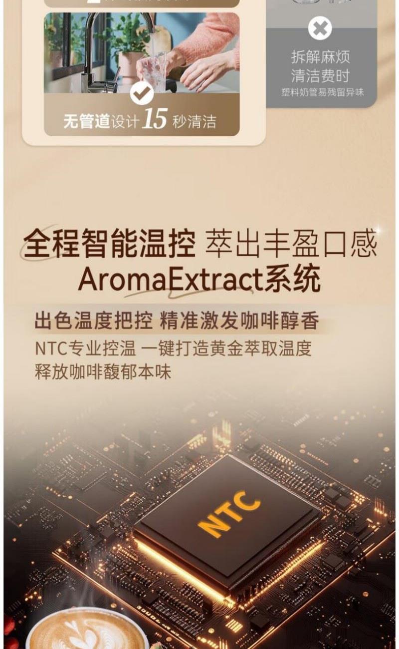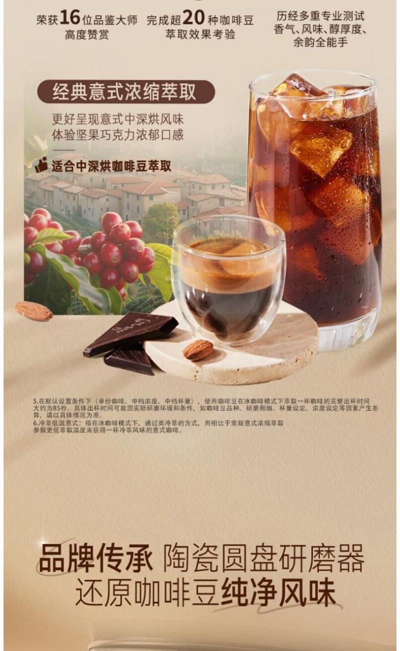1、双温意式萃取,创新冷萃低温意式 2、LatteGo系统,绵云奶泡技术 3、AromaExtract系统,三档口味调节,定制你喜欢的咖啡口味 4、陶瓷圆盘研磨器 5、AquaClean滤水芯