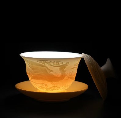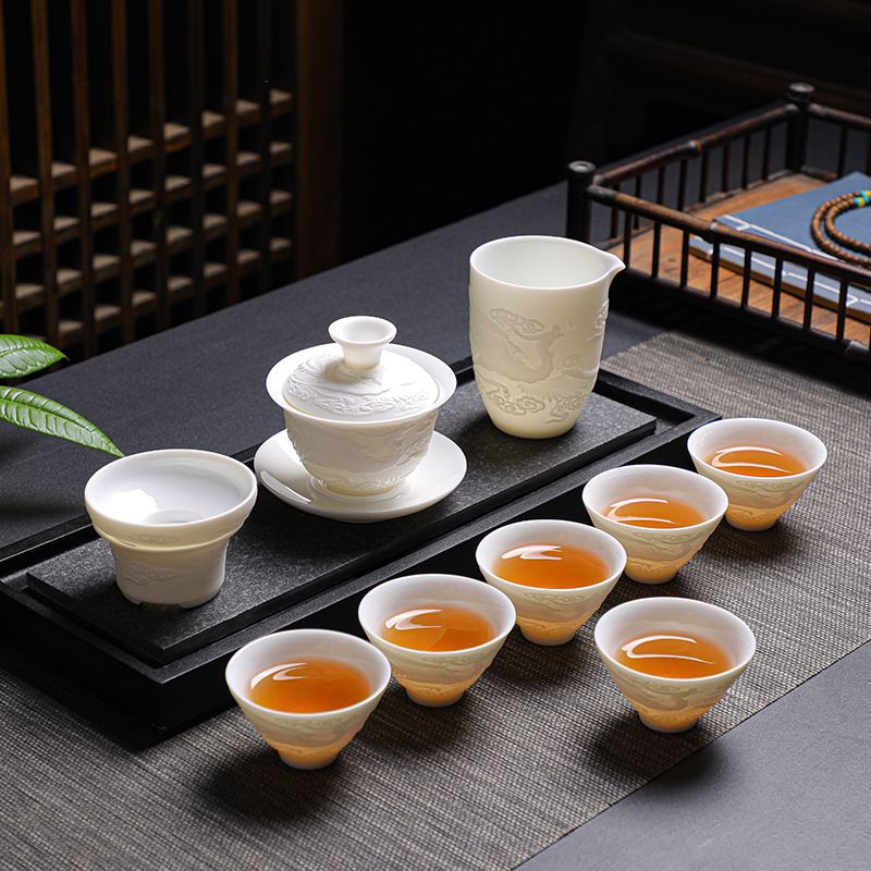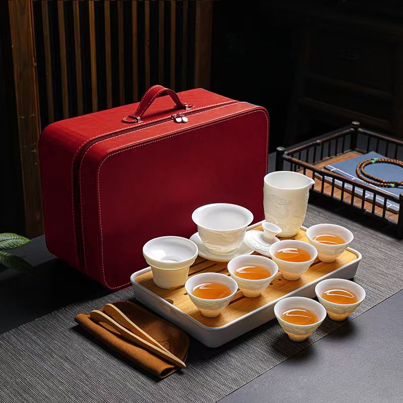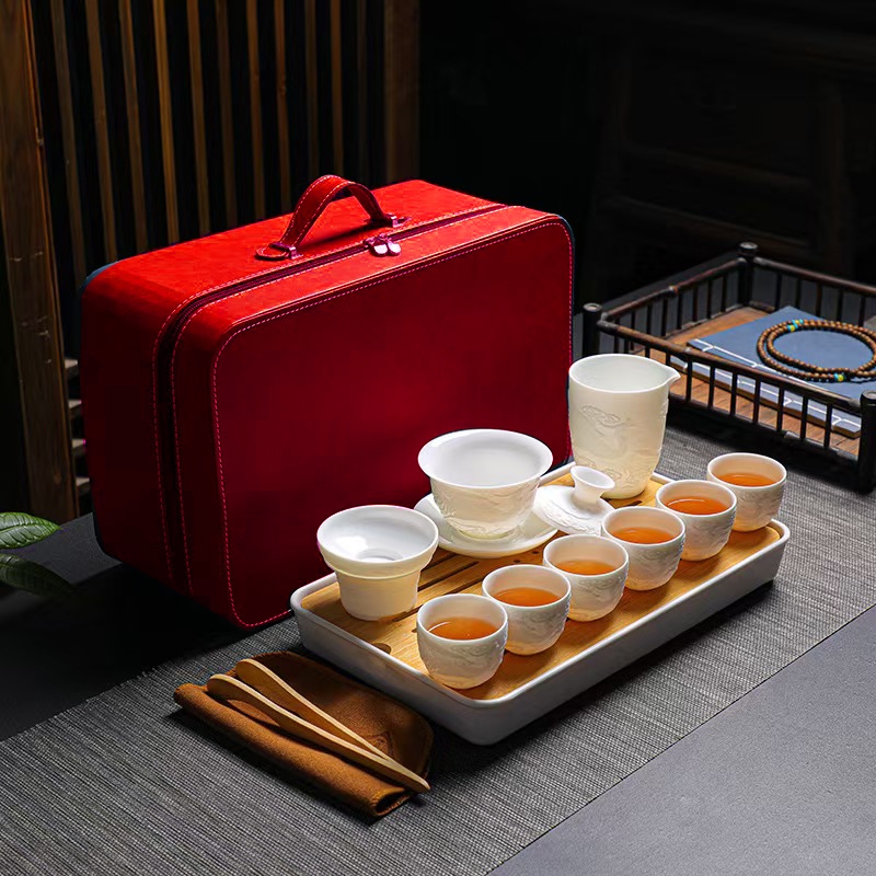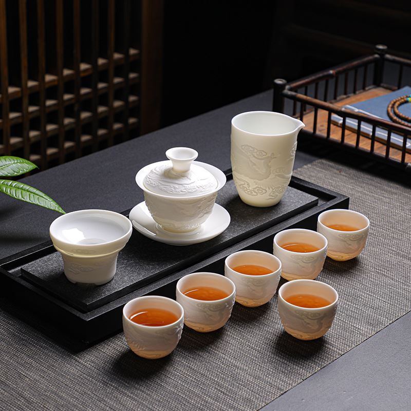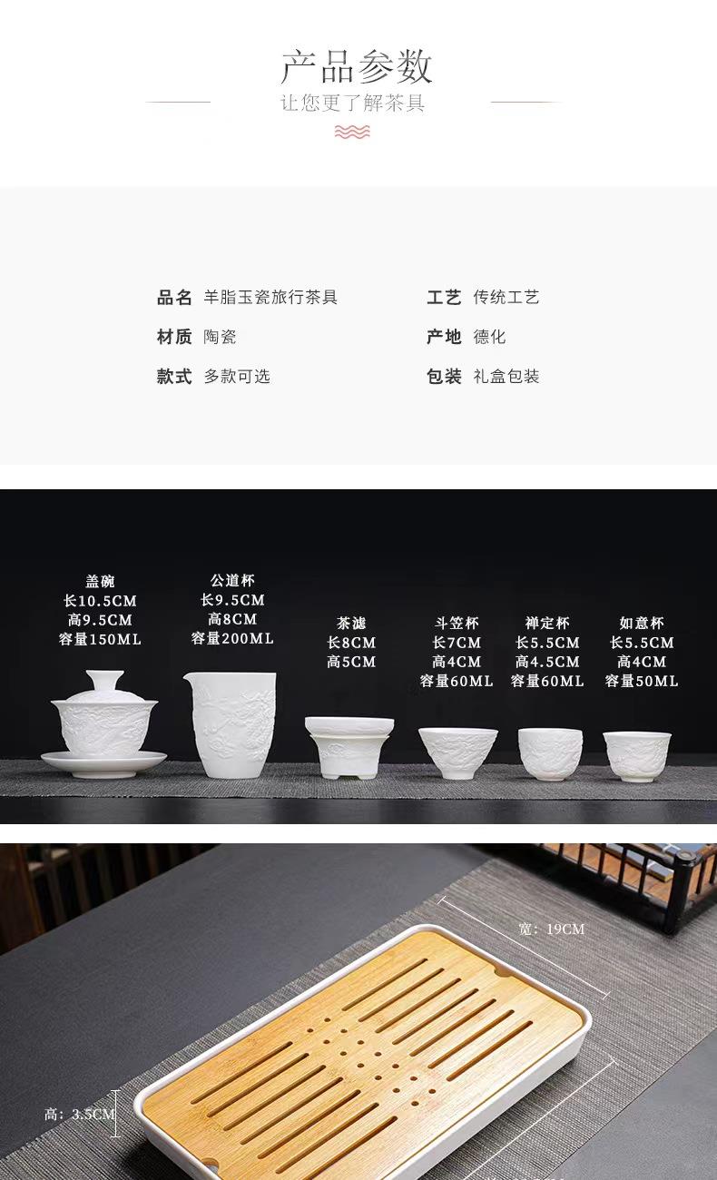 配制:1壶 6杯 1公道杯1茶托1茶漏1茶巾茶夹 1茶盘 1旅行包 规格: 盖碗:10.5*9.5cm 茶杯:6.5*5cm 公道杯:9.5*8.5cm 茶托茶漏:8*5cm 茶盘:33*19*3.5cm 推荐说明:手工浮雕凤纹茶具,栩栩如生。羊脂玉瓷,瓷质细腻温润,触感舒适。似凝脂,如美玉。在阳光照射下,呈半透明羊油状,洁白滋润,故称羊脂玉。锦盒装,时尚精致上档次。