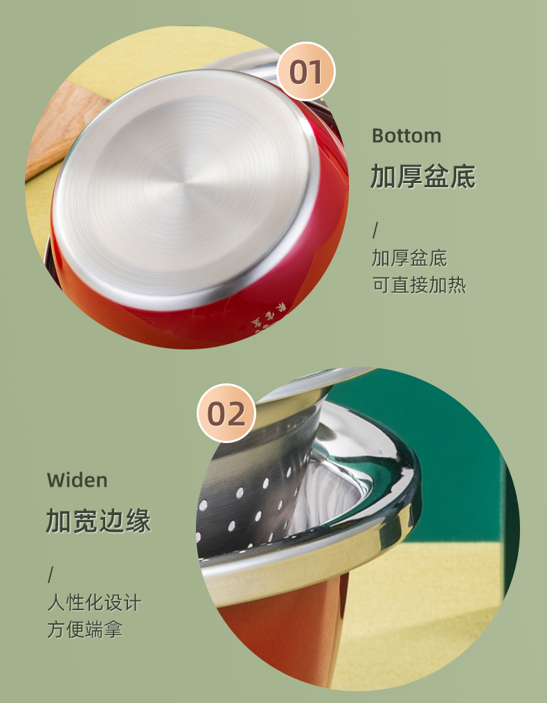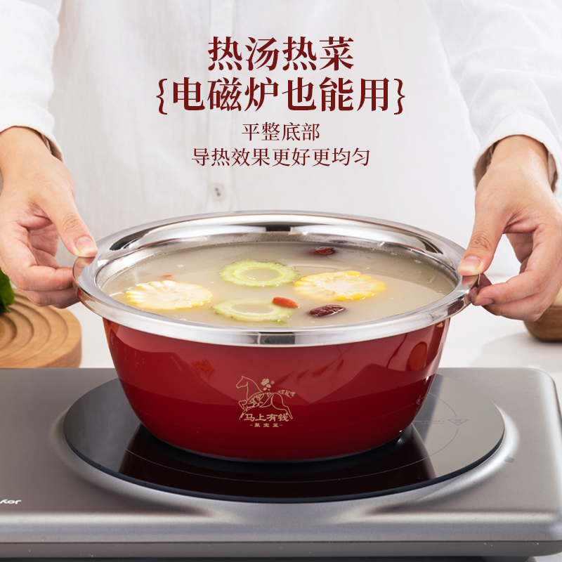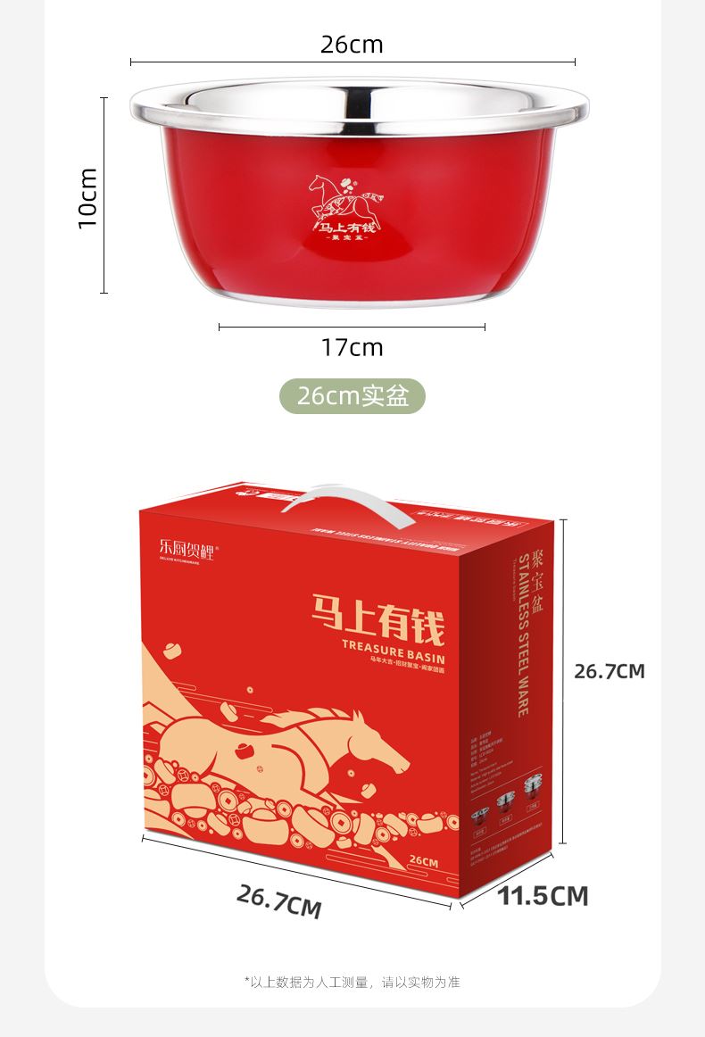 产品规格:26cm 产品材质:201不锈钢 外箱尺寸:95*55*55 cm 条 码:6959460801907 彩盒尺寸:26.7*11.5*26.7cm 聚宝盆,顾名思义就是装满金银财宝,取之不尽用之不完的宝盆。 送礼送聚宝盆,美好寓意,广纳八方财富,汇聚四方鸿运。 加厚盆,宽边设计方便端拿,精抛工艺,清洗方便。 好礼品,是日日用得上,为你的消费者从日常生活入手, 颜值在线,厨房不再单调,精美礼盒包装,送礼有面子。 马上有钱,助力开门红,宣传必备礼品。