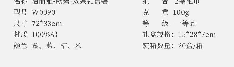 组 合:2条 材 质:棉 规 格:72*33cm 克 重:100g 颜 色:紫、蓝、桔、米 等 级:一等品 礼盒规格:15*28*7cm