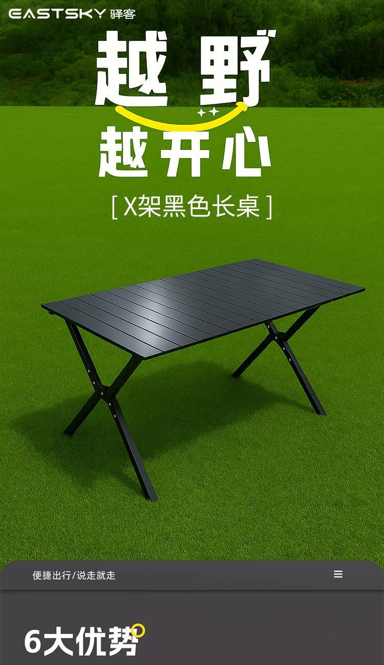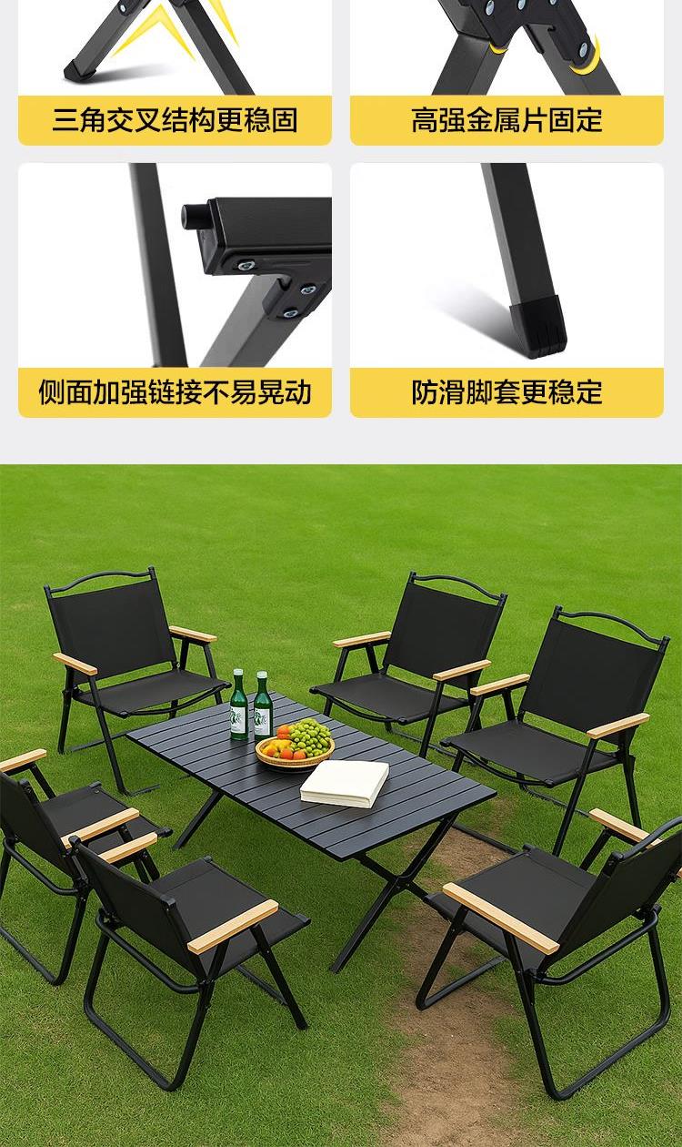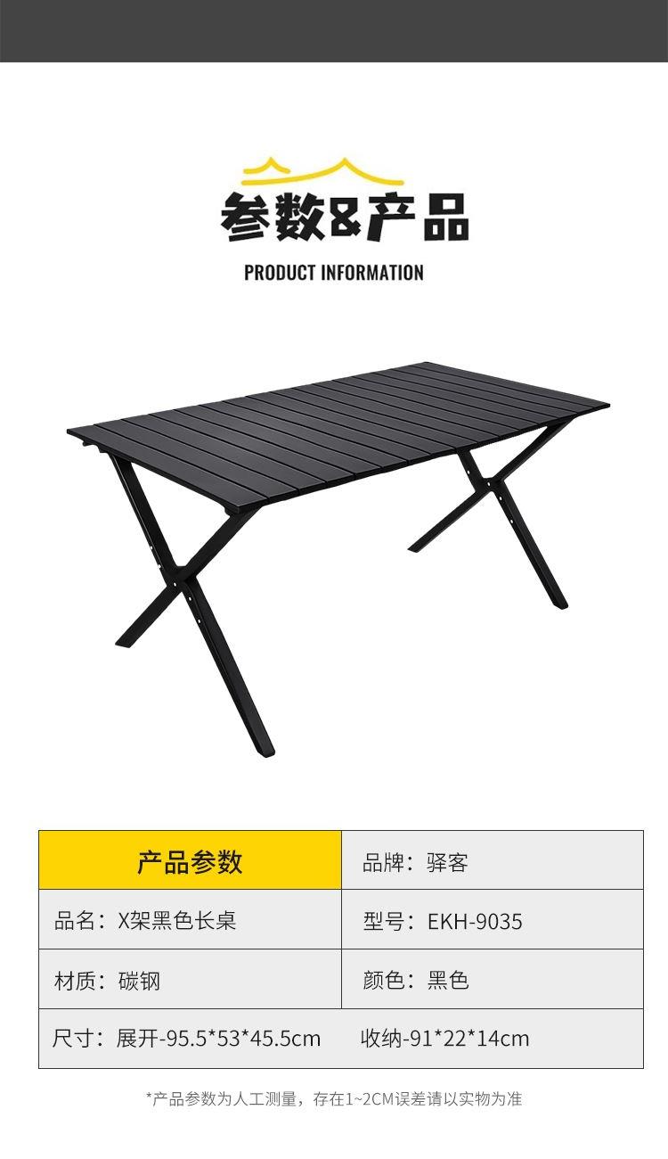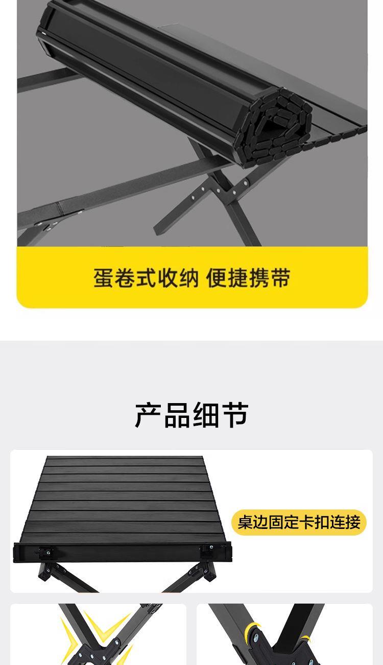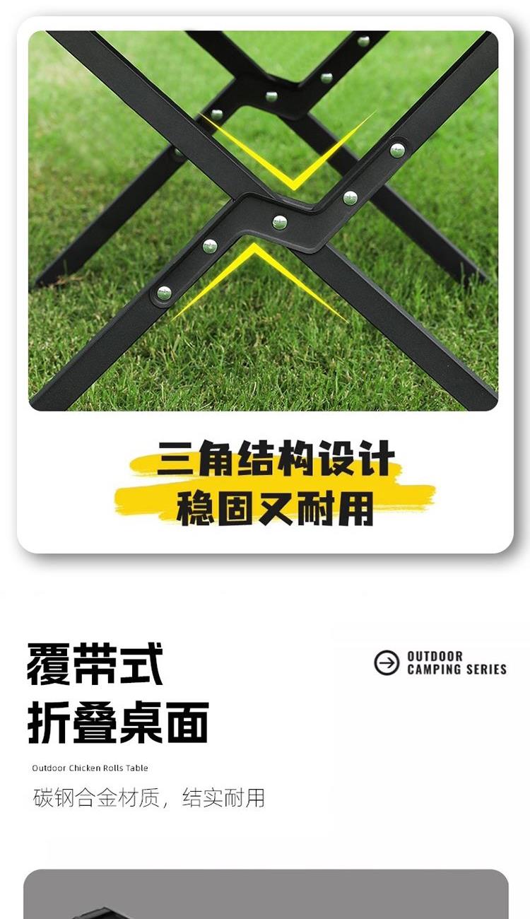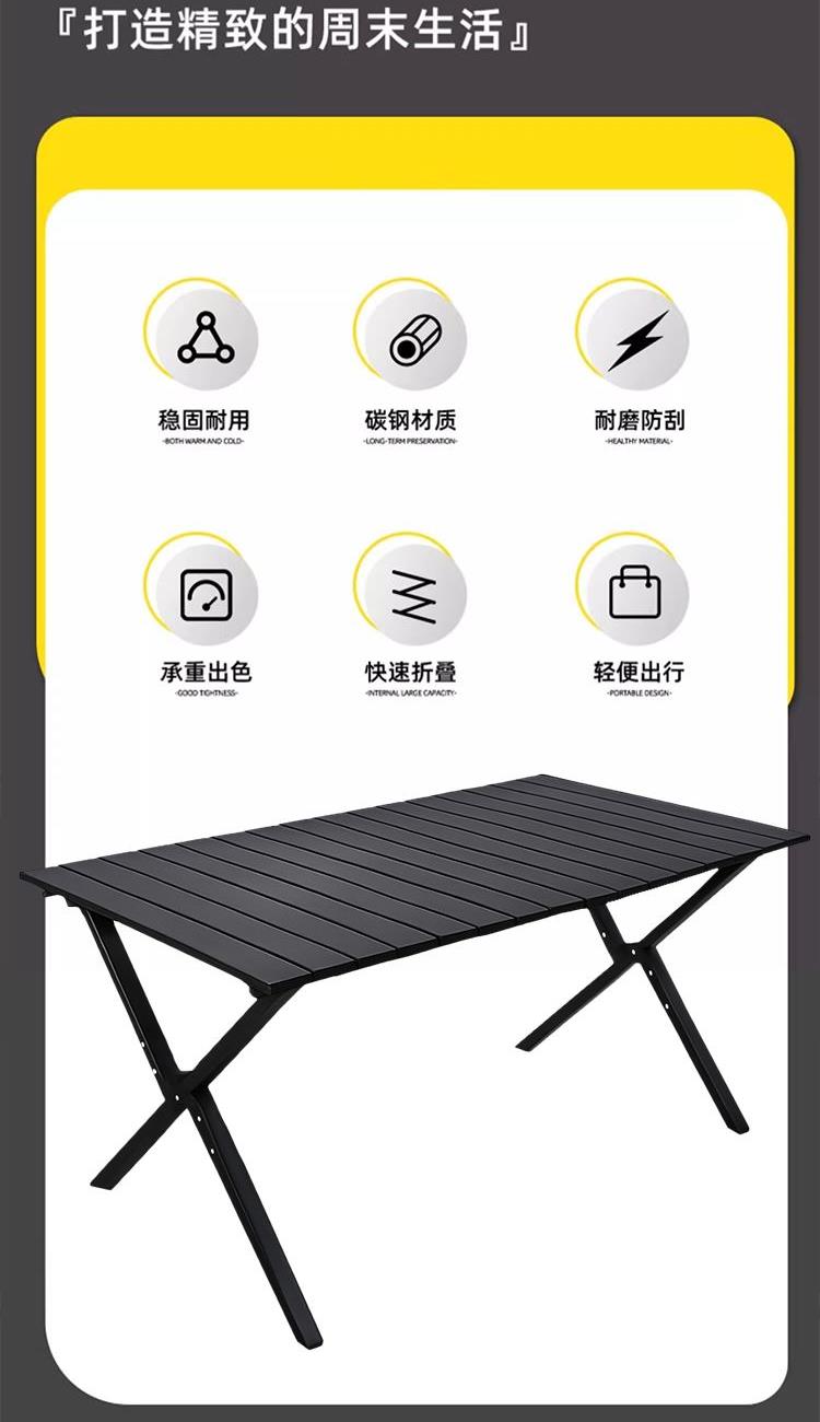 1.桌面精选优质轻硬碳钢材质,耐磨抗压,轻巧易携带,稳固性更好,安全牢固; 2.底部支撑采用三角形加固结构,桌子摆放稳定不摇晃; 3.黑色金属表层处理,防水耐磨,美观大方,结实耐用,不易生锈; 4.桌面一卷,桌腿一收,3步轻松搭建,快速收纳,省时省力; 5.轻量便携,小仙女也能轻松拿走,不给出游增加负担。