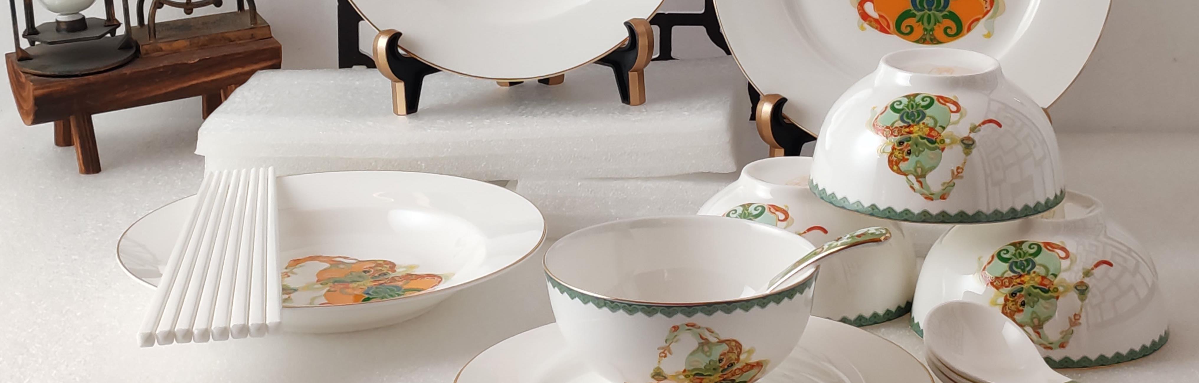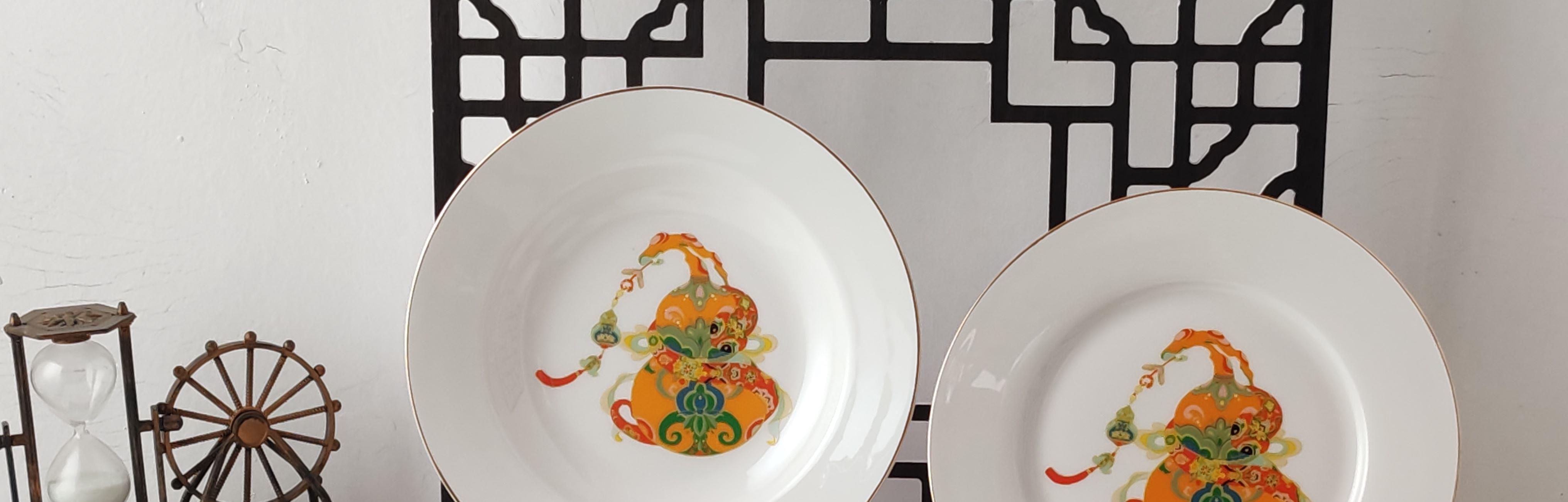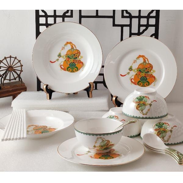 型号:MC-S2458K 规格:4.5英寸澳碗*6, 小汤勺*6,8英寸深盘*4,陶瓷筷子*6,8英寸平盘*2 蛇影”描绘出蛇那灵动、灵性且神秘难以捉摸的身 影,表现出蛇与葫芦之间的一种互动关系,“葫踪”强调葫芦的踪迹也充满奇幻色彩,则给人一种葫芦内部或周围存在着一个独特世界的感觉,仿佛它们隐藏着许多不为人知的秘密等待被发现。