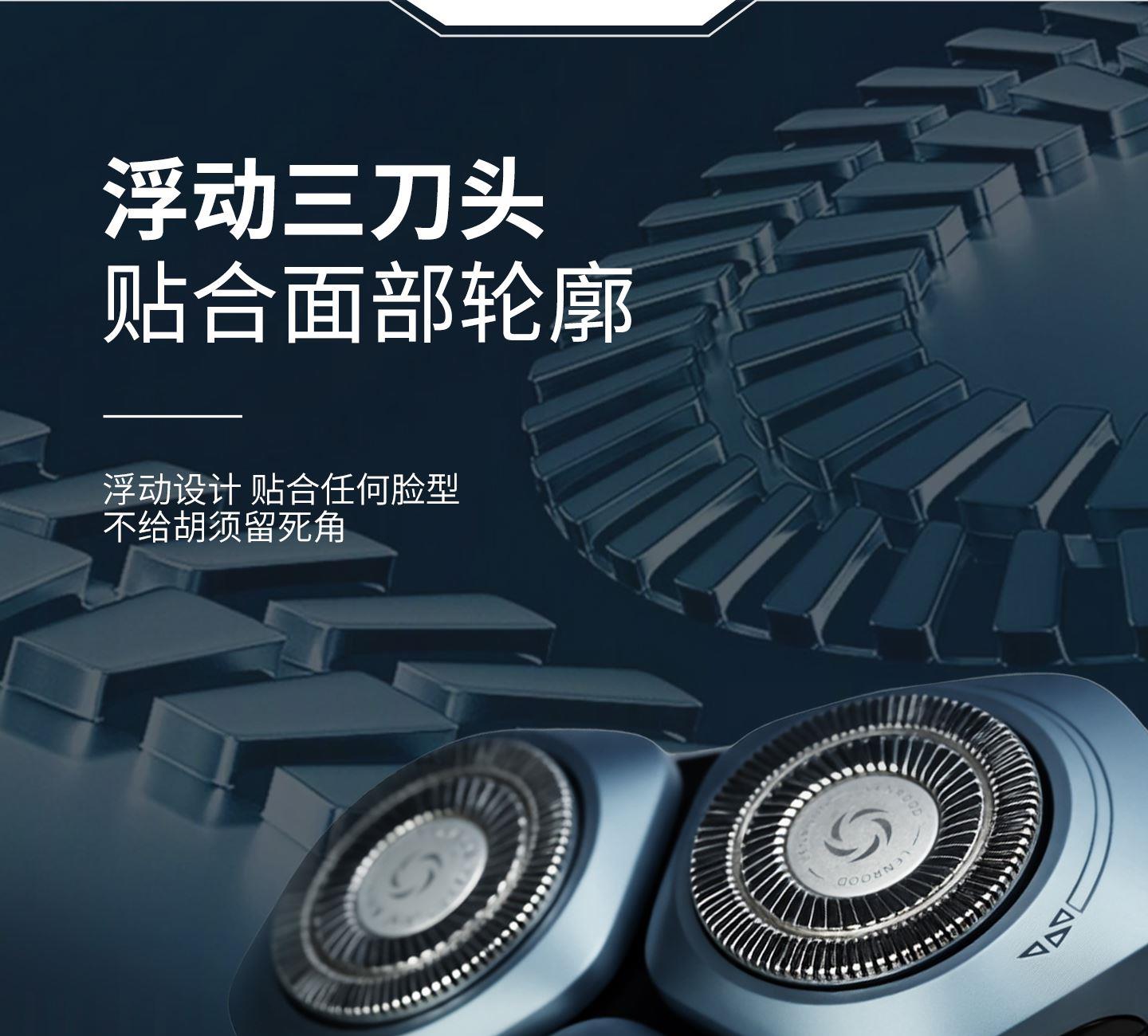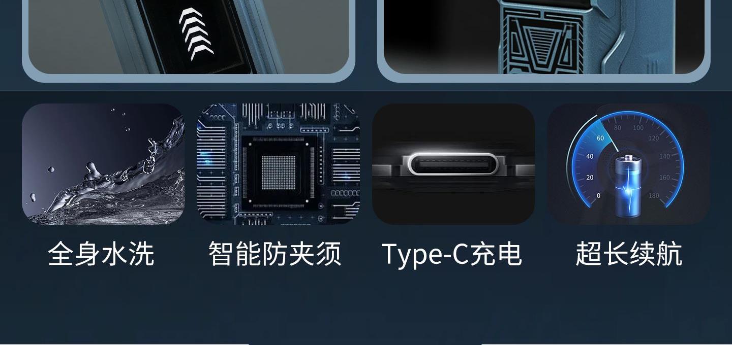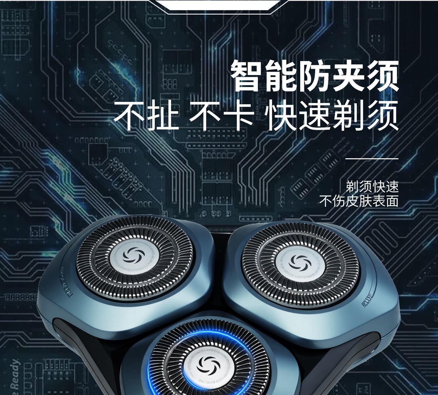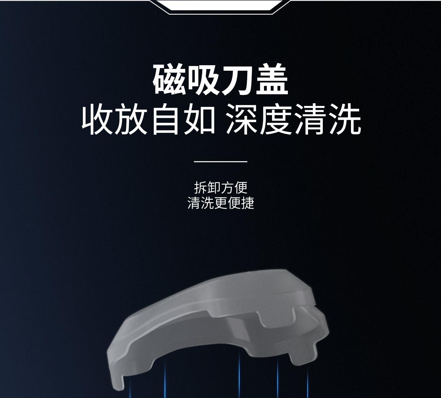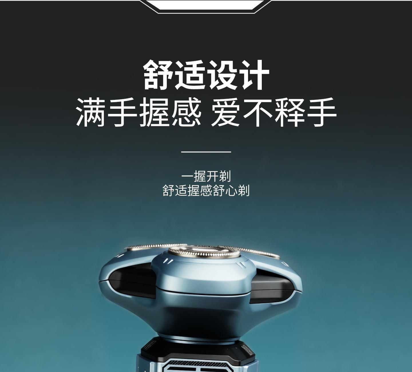 1.三重旋转式浮动刀头 2.机甲风外观造型 3.60 分钟长效续航 4.Type-C1小时快充,即插即用 5.IPX6 级防水 6.全 ABS 轻量机身 7.高清数码显示电量,实时充电显示 8.智能防夹须技术 9.旅行锁功能,长按解锁,一键启动;