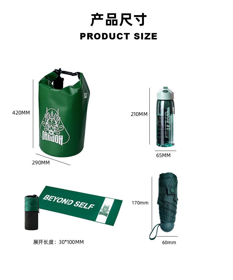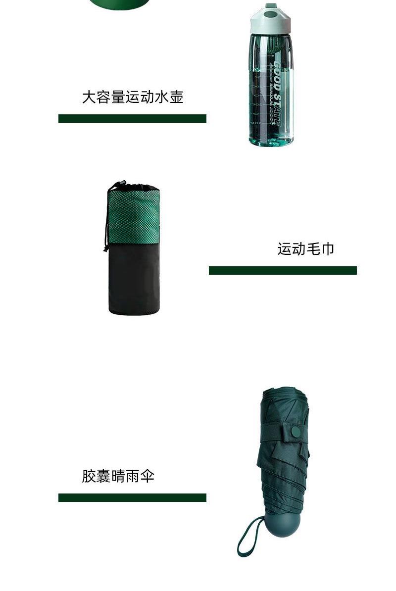 礼盒参数: 礼盒尺寸:18*18*32cm 套装重量:650g/套 外箱尺寸:46.5*43.5*45.5cm 详细介绍: 1.运动毛巾 快速吸汗/速干便携/亲肤不掉毛 材质:超细纤维 尺寸:30*100cm 重量:136g 2.大容量运动水壶 超大容量、加厚耐摔、 带搅拌网格 颜色:绿、咖(随机) 杯体:食品级塑料 容量:550ML 3.胶囊晴雨伞 规格:52cm*6骨 伞下直径93cm 折叠后长19cm 4.防水桶包 材质:500D PVC底夹网布 容量:5L