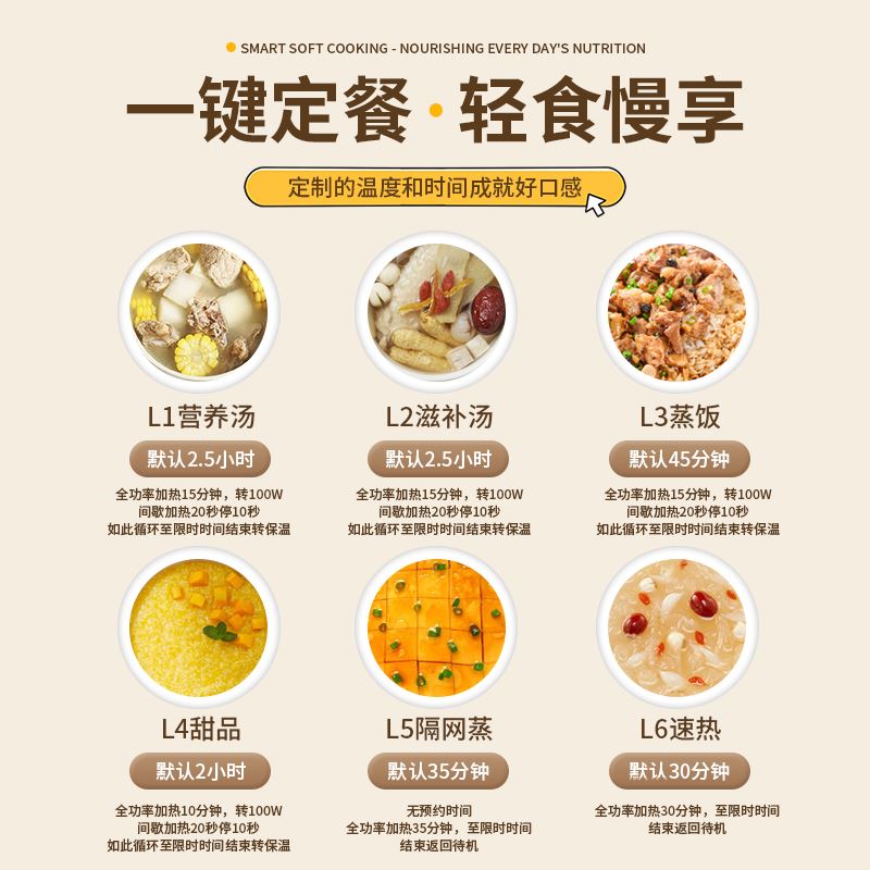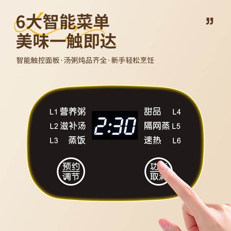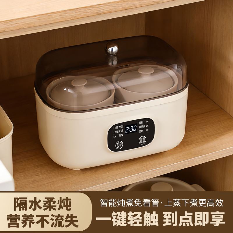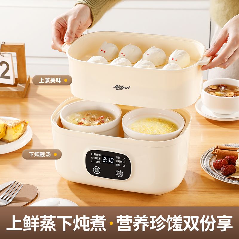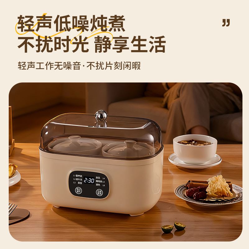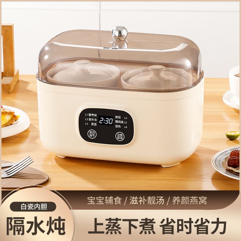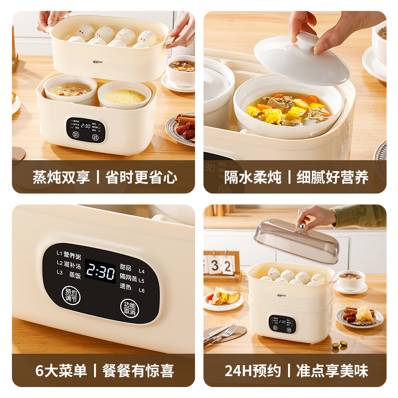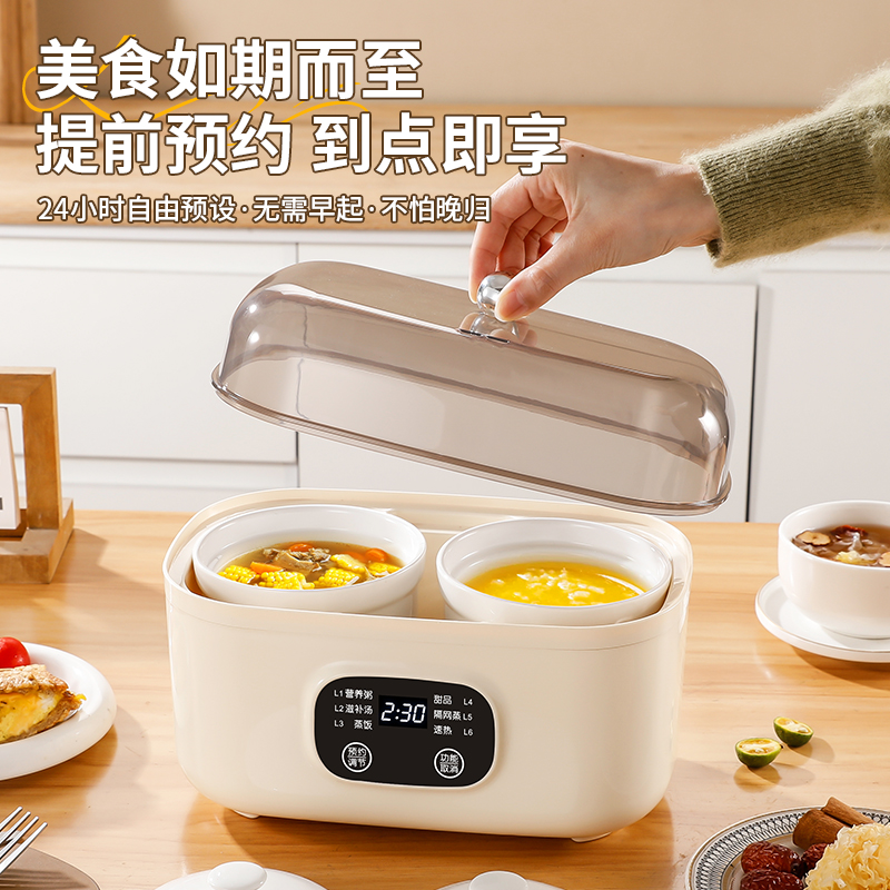 额定电压:220V/50Hz 额定功率:200W 产品颜色:象牙白 产品尺寸:255*160mm 彩盒尺寸:294*167*285mm 6大菜单,蒸炖双享,省心省力更省时; 上蒸下炖,双份享,蒸炖同步省时高效; 温润白瓷内胆,导热均匀,紧锁营养不串味; 智能触控,汤粥炖品齐全,新手轻松烹饪, 24小时智能预约,到点即享,无需早起; 双重防干烧,安心烹煮,无需担忧;