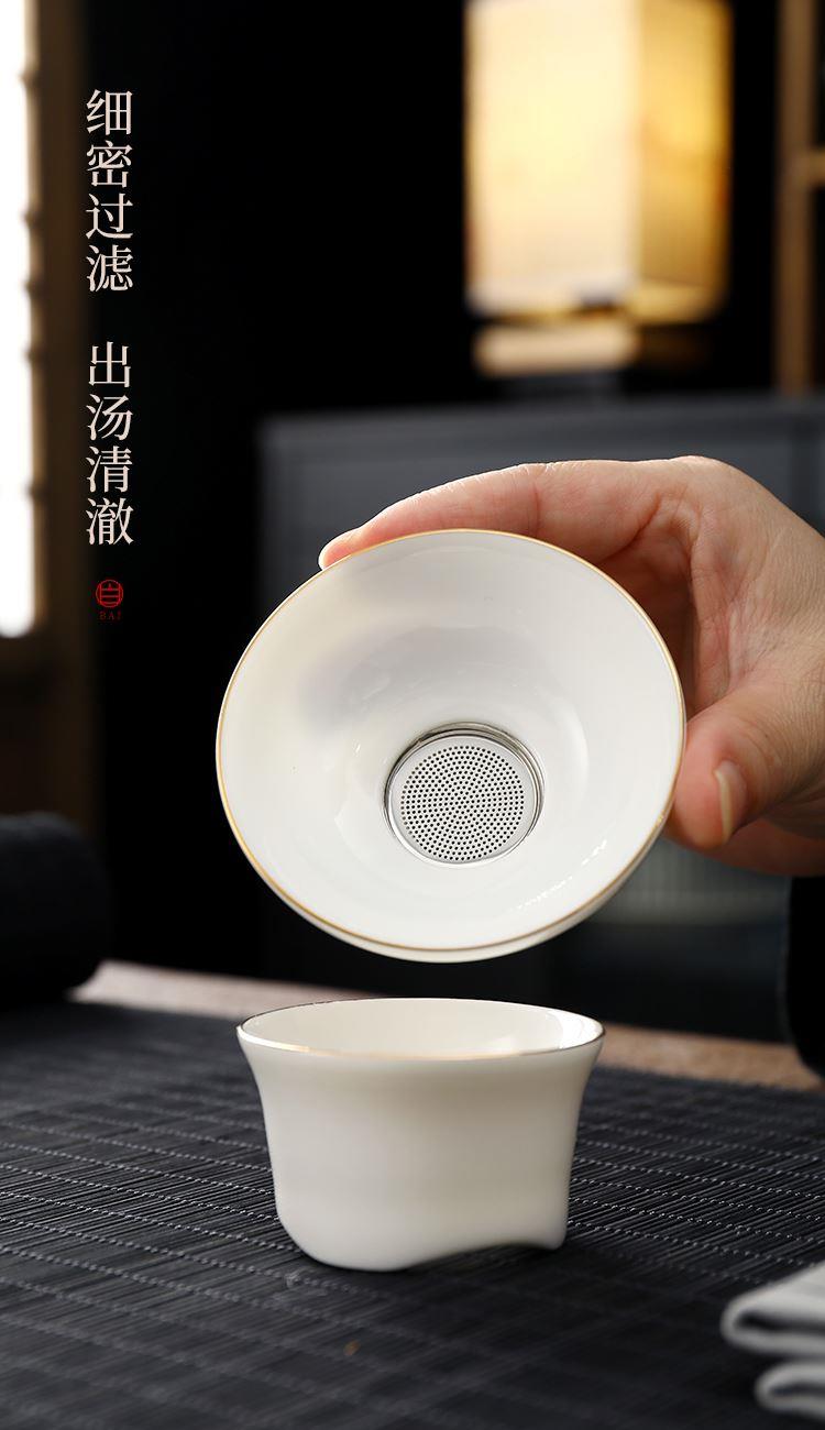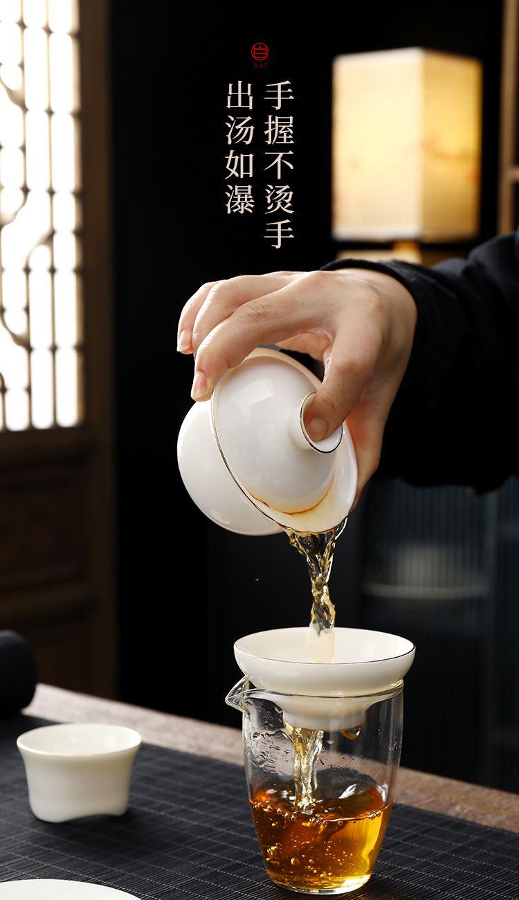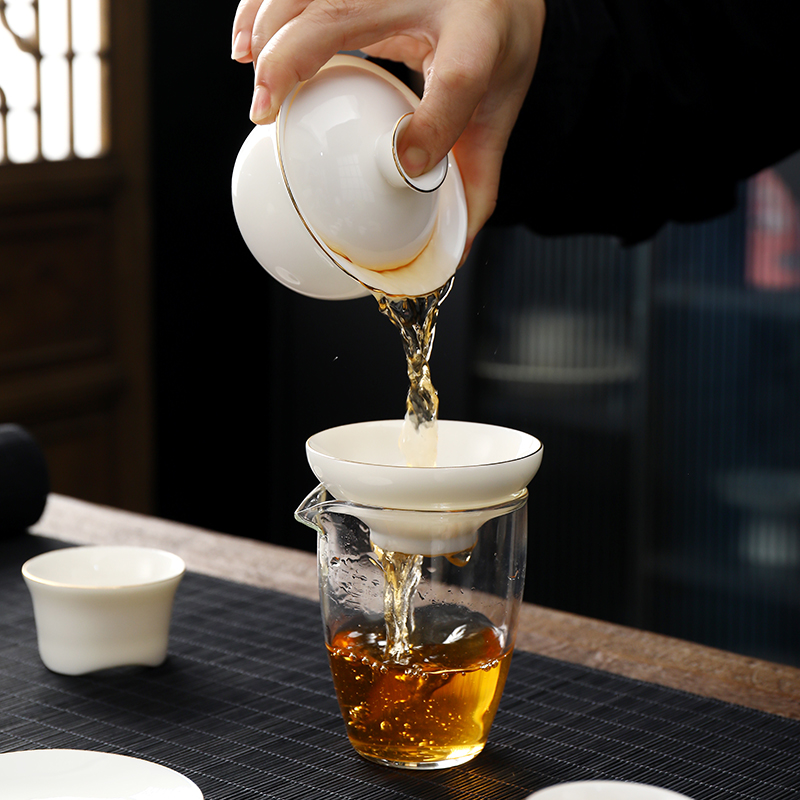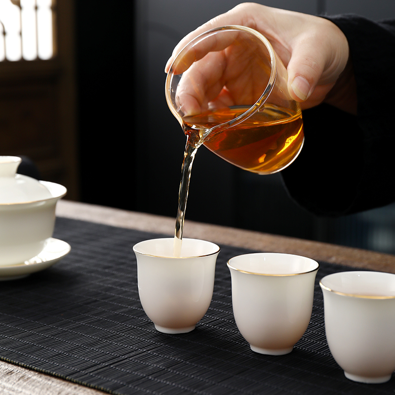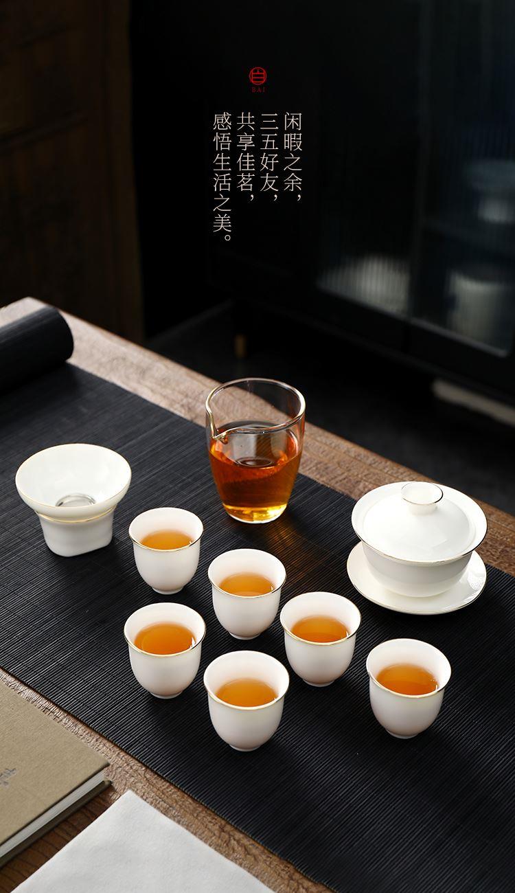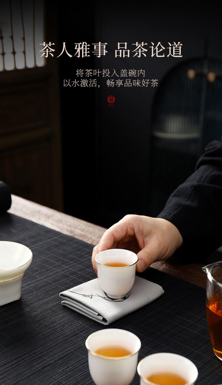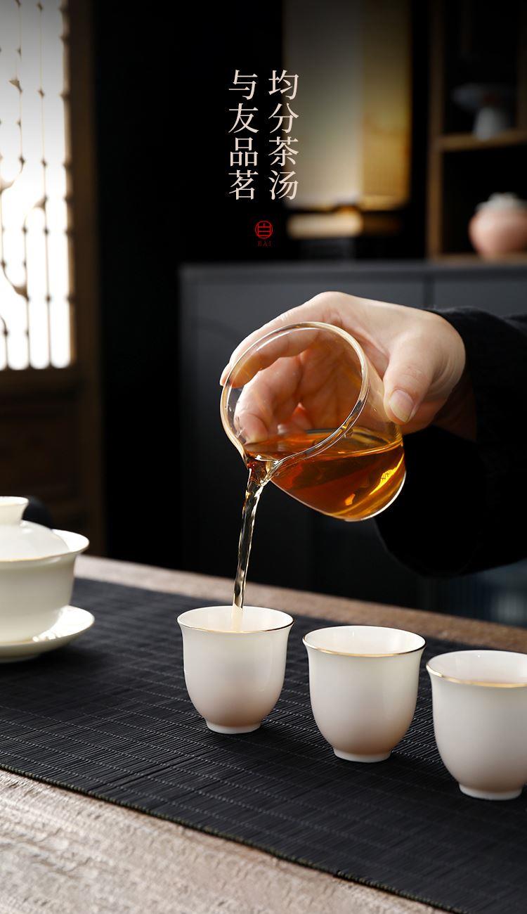 盖碗1:宽9.5cm*高8.2cm 130ml 茶海1:宽8cm*高9cm 230ml 茶杯:6宽5cm*高4.8cm 45ml 茶漏1:宽8cm*高5.6cm 礼盒1:36cm*26.5cm*12cm 原矿瓷土,高温烧制,多道工序人工打磨专注精品。 羊脂玉瓷,细腻洁白,温润如玉。 器型端庄大气,口沿描金,线条流畅,体态饱满精致。