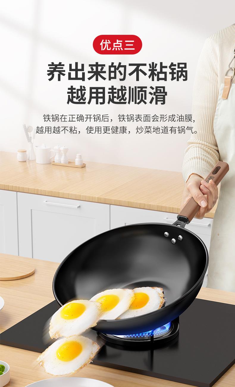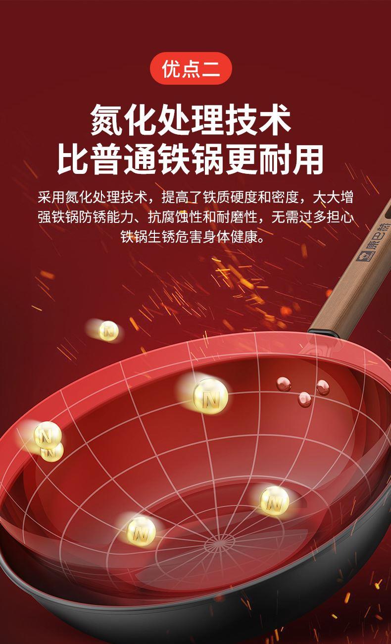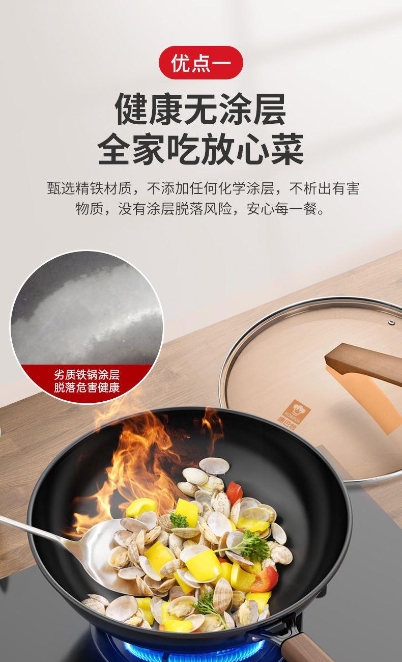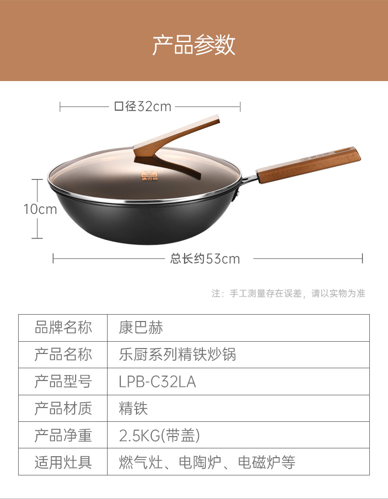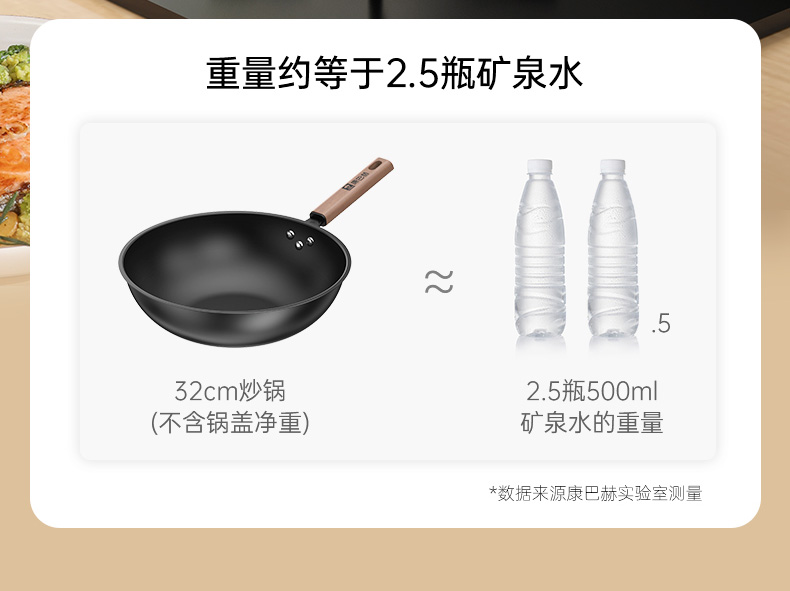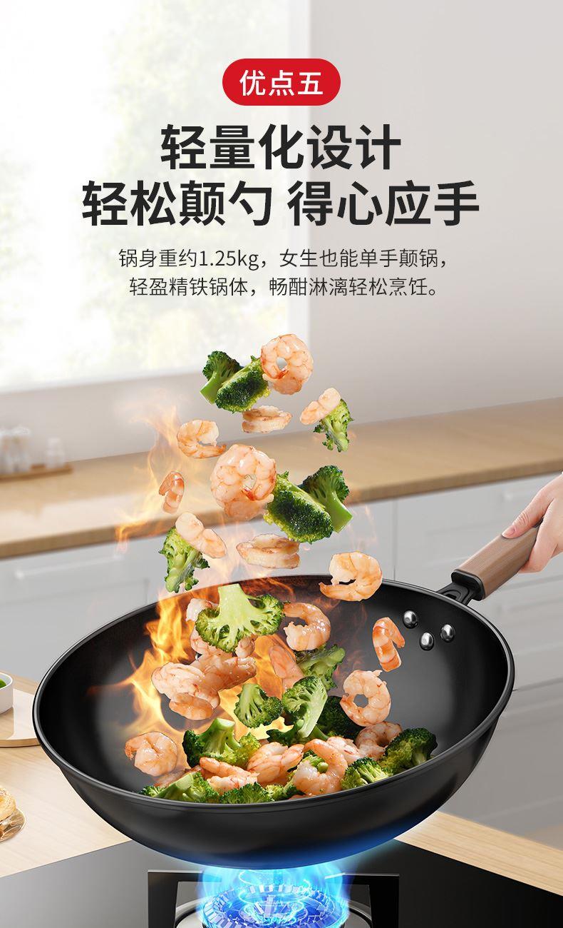 规格:32cm 净重:2.5kg 包装尺寸:52*40*79.8cm ◎健康无涂层全家吃放心菜:甄选精铁材质,不添加任何化学涂层,不析出有害物质,没有涂层脱落风险,安心每一餐。 ◎氮化处理技术比普通铁锅更耐用:采用氮化处理技术,提高了铁质硬度和密度,大大增强铁锅防锈能力、抗腐蚀性和耐磨性,无需过多担心铁锅生锈危害身体健康。 ◎养出来的不粘锅,越用越顺滑:铁锅在正确开锅后,铁锅表面会形成油膜,越用越不粘,使用更健康,炒菜地道有锅气。 ◎无惧酸碱又抗磨酸辣海鲜随心做:比普通铁锅更耐酸碱,重口味菜式轻松做,不易生锈 ◎轻量化设计轻松颠勺得心应手:锅身重约1.25kg,女生也能单手颠锅,轻盈精铁锅体,畅酣淋漓轻松烹饪。 ◎可立盖设计立放稳固干净卫生:锅盖可立设计,便于烹饪过程中临时性放置,下厨不湿台面,清洗轻松烹饪更省心