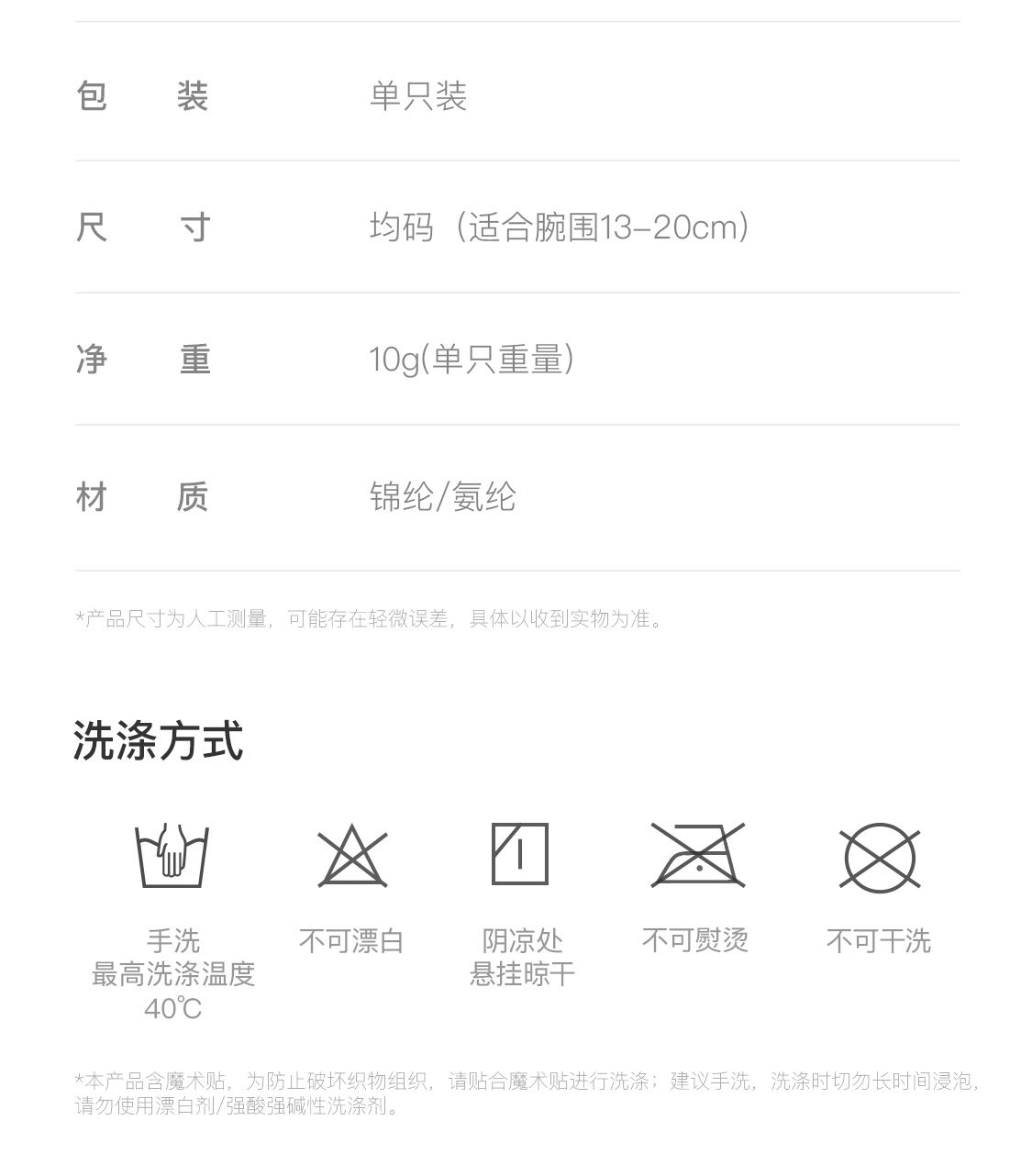 尺寸:均码 (适合腕围13-20cm) 净重:10g(单只重量) 材质:锦纶/氨纶 颜色:蓝色、绿色、黑色、灰色 稳固手腕 透气吸汗 亲肤舒适