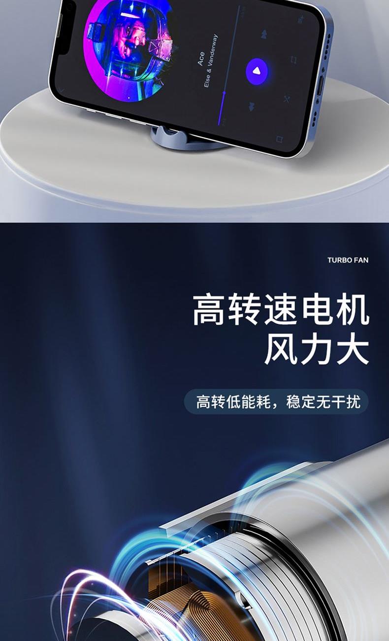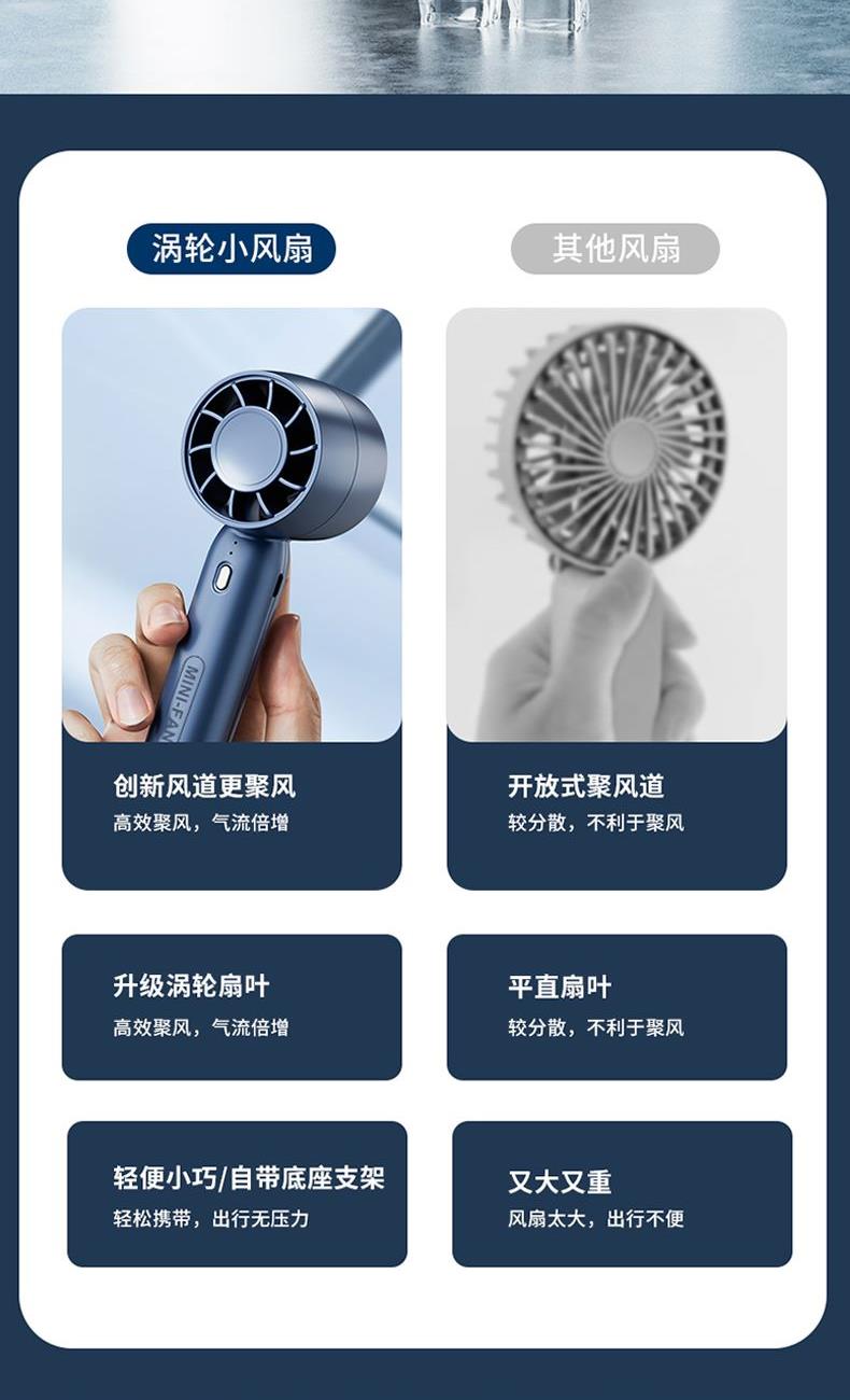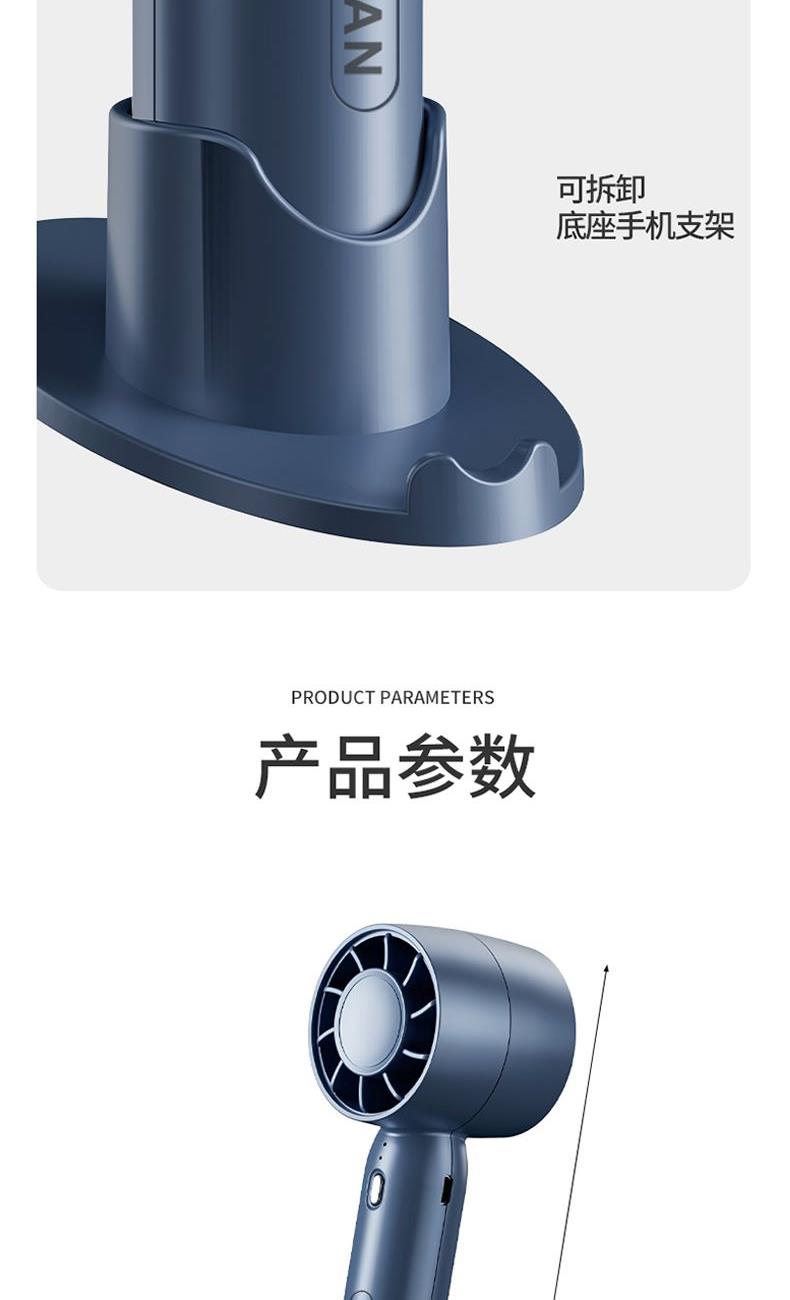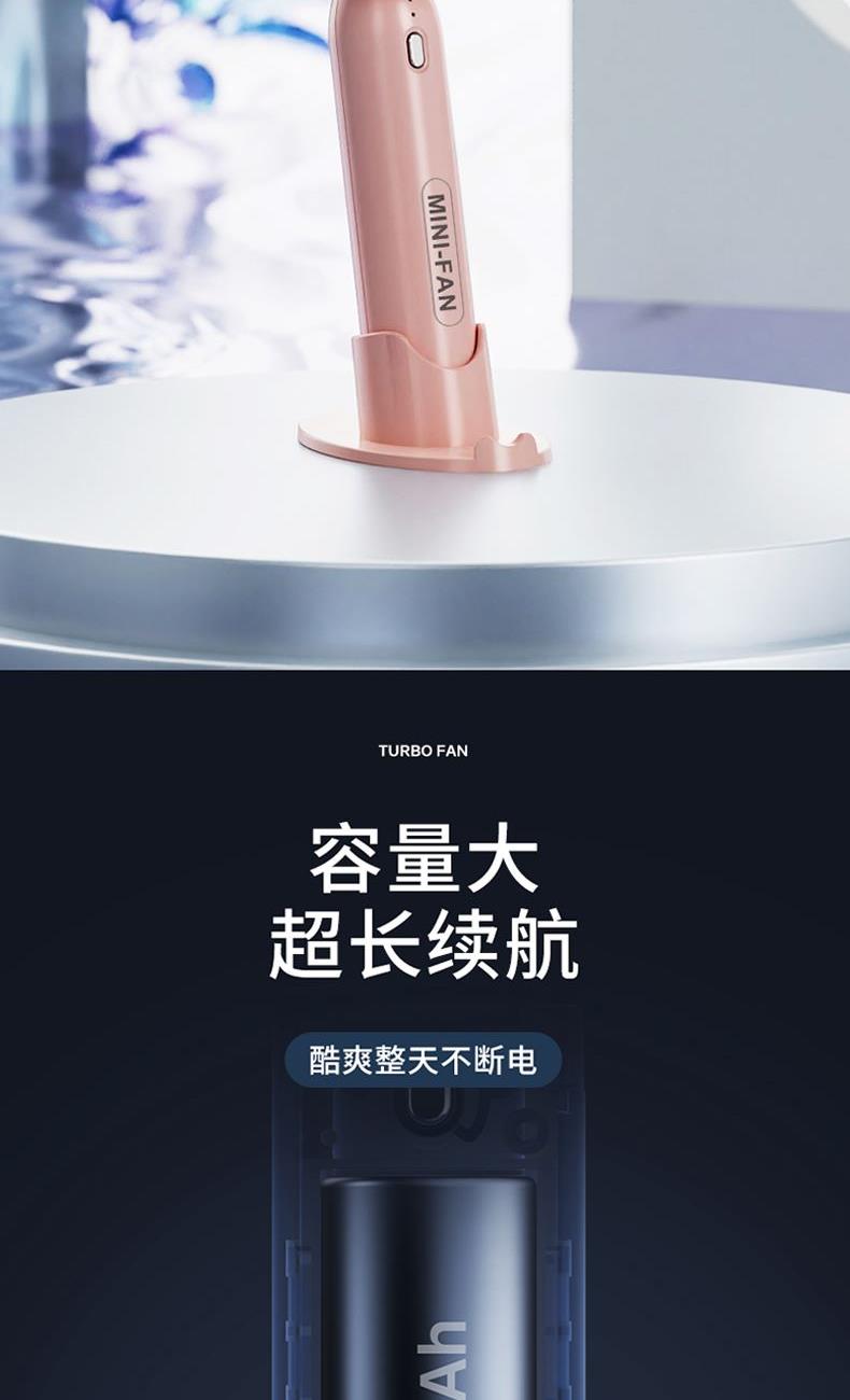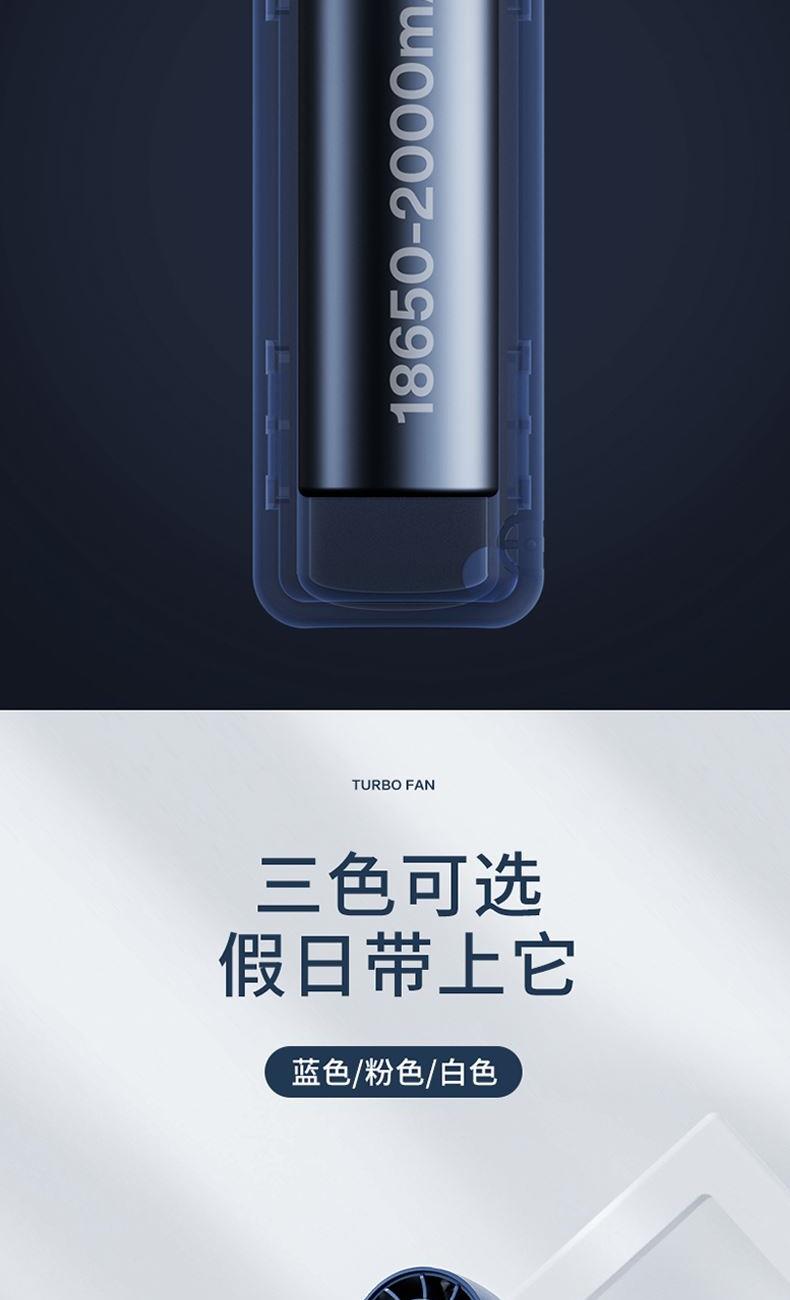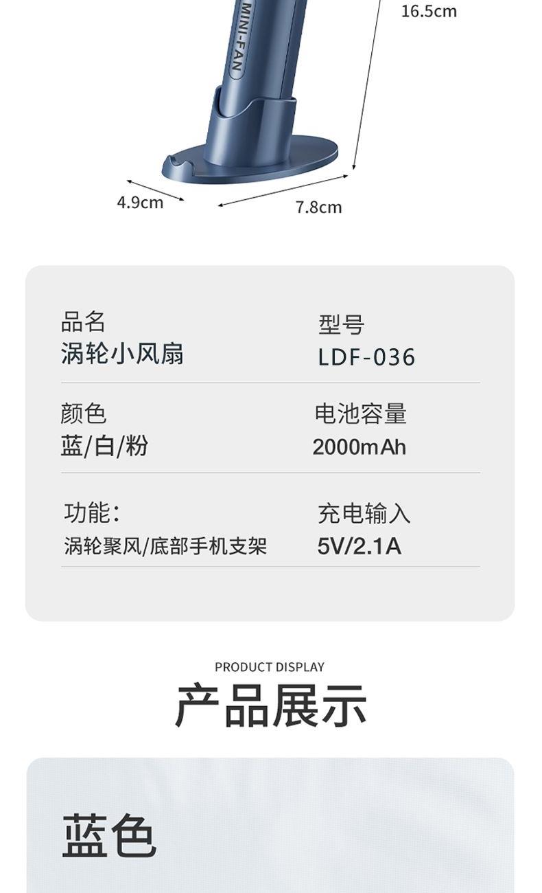 材质:ABS 电池类型:18650锂电池 电池容量:500mAh 输入功率:5V-2.1A 功能:涡轮飓风/底部手机支架 产品接口:MICRO USB充电口 档位调节:三档风速 颜色:蓝/白/粉 创新风道更聚风高效聚风,气流倍增;升级涡轮扇叶、高效聚风,气流倍增;轻便小巧/自带底座支架、轻松携带,出行无压力;容量大超长续航、酷爽整天不断电。