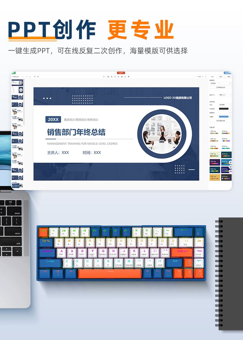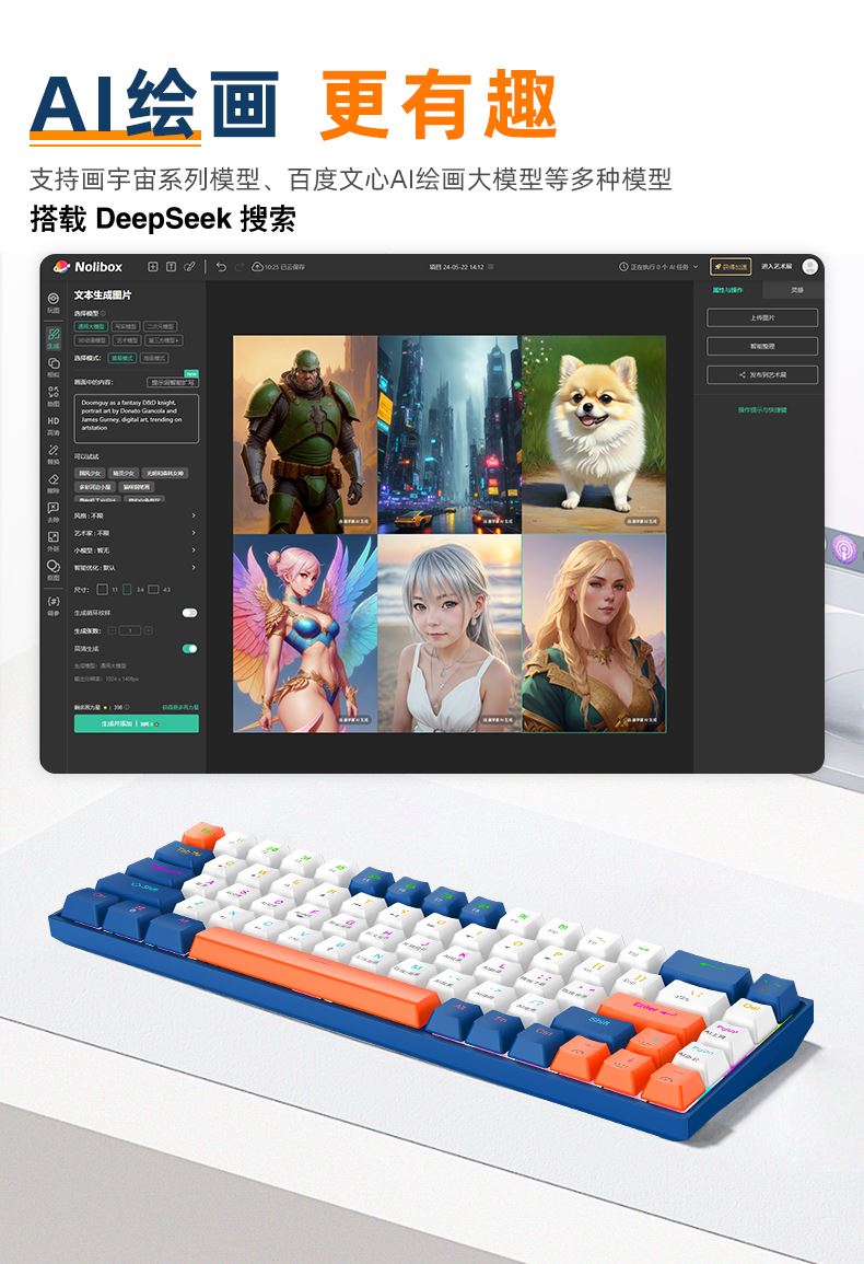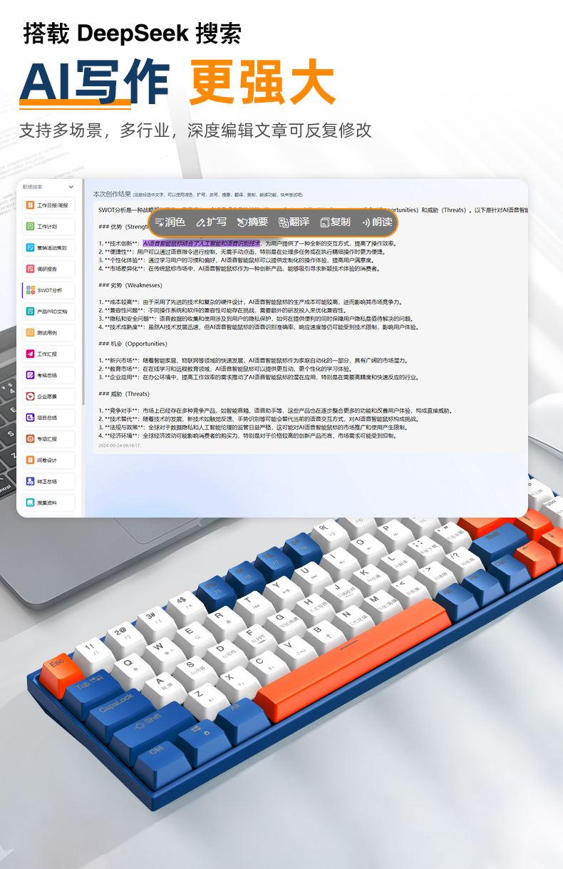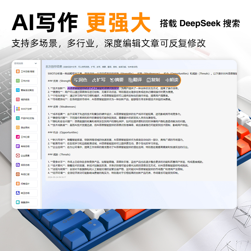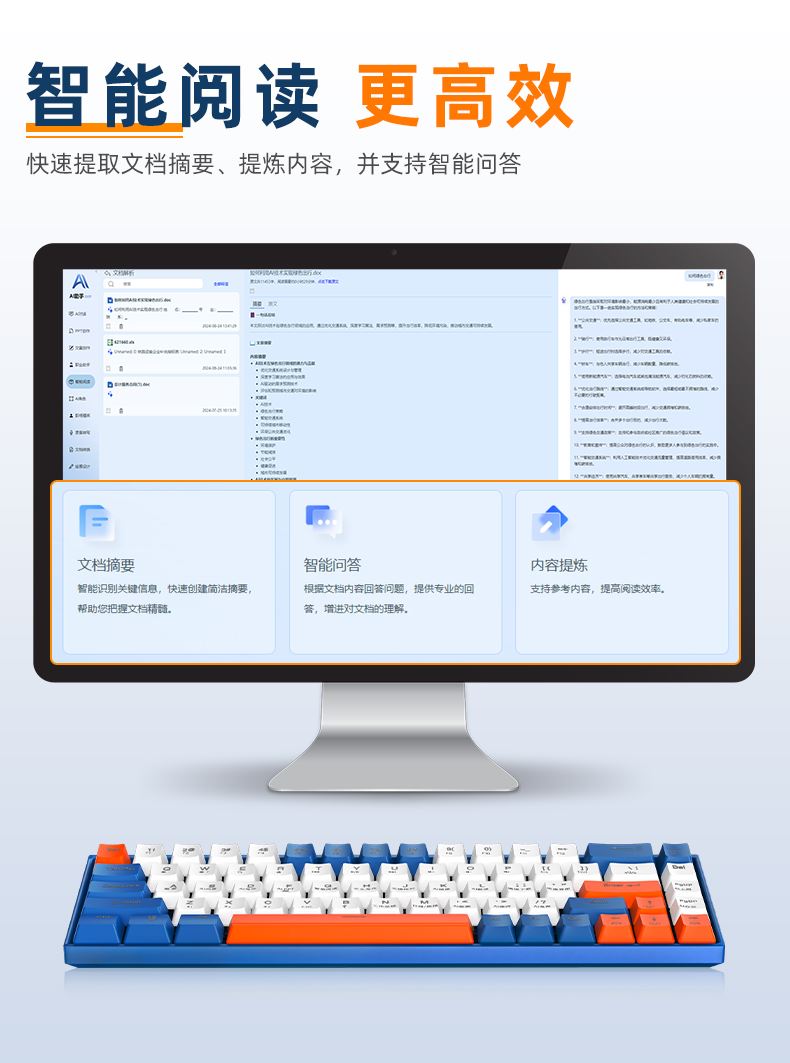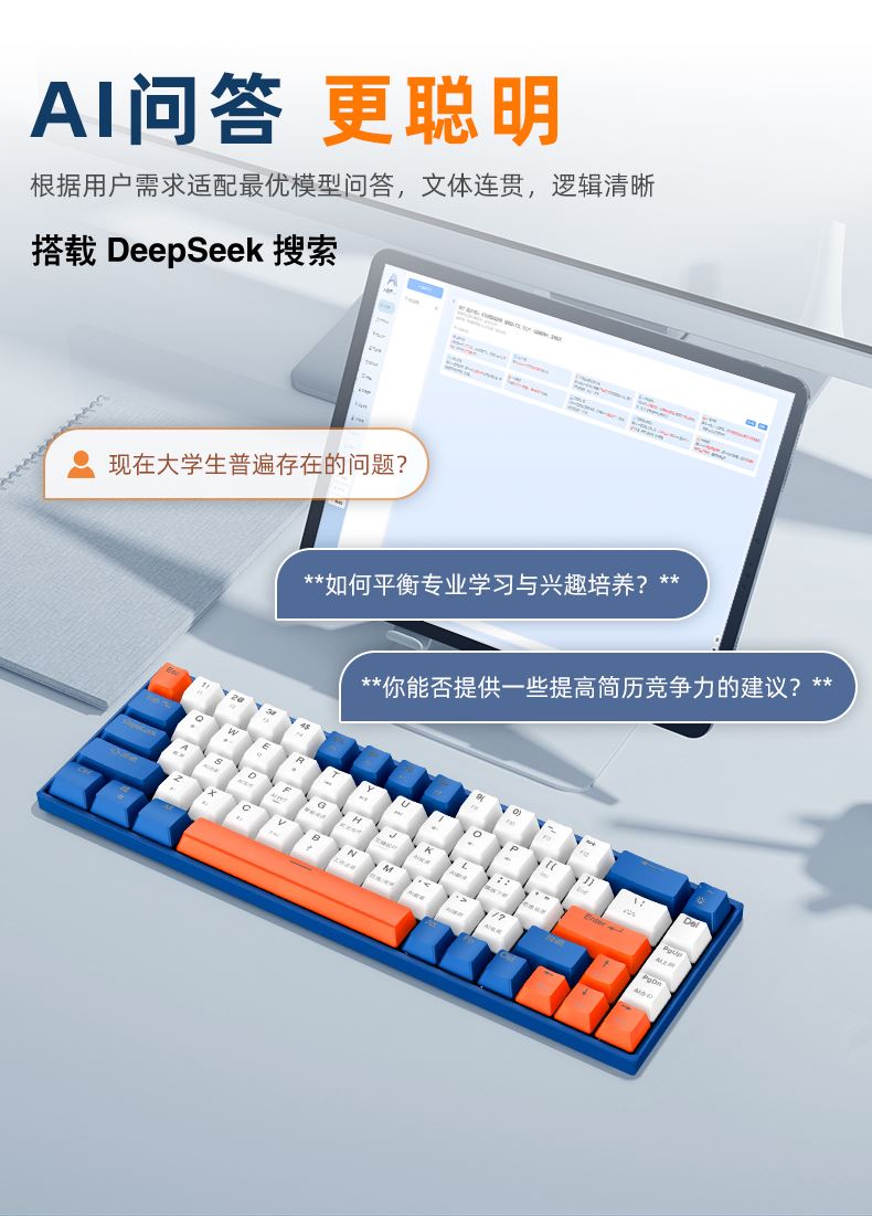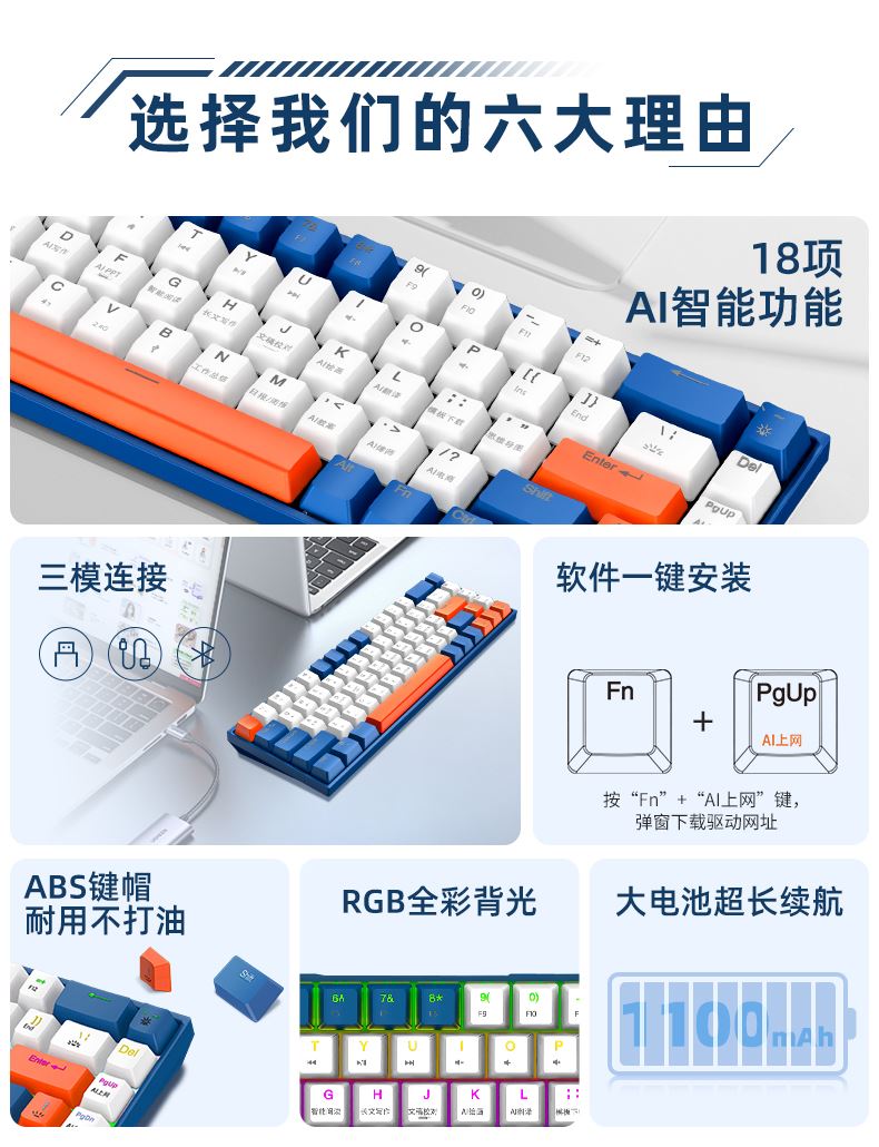 支持2.4G,有线,三蓝牙五台设备切换使用; 搭载四大AI模型,文心一言,KIMI,Deepseek,豆包等; 18项AI功能,超长电量使用时间,软件一键,不要。安装; 日常AI写作、PPT制作,aI设计绘画,智能阅读,文档转换,离线高效出电商图等超强大功能 台式机,一体机,笔记本等多系统多种设备兼容;