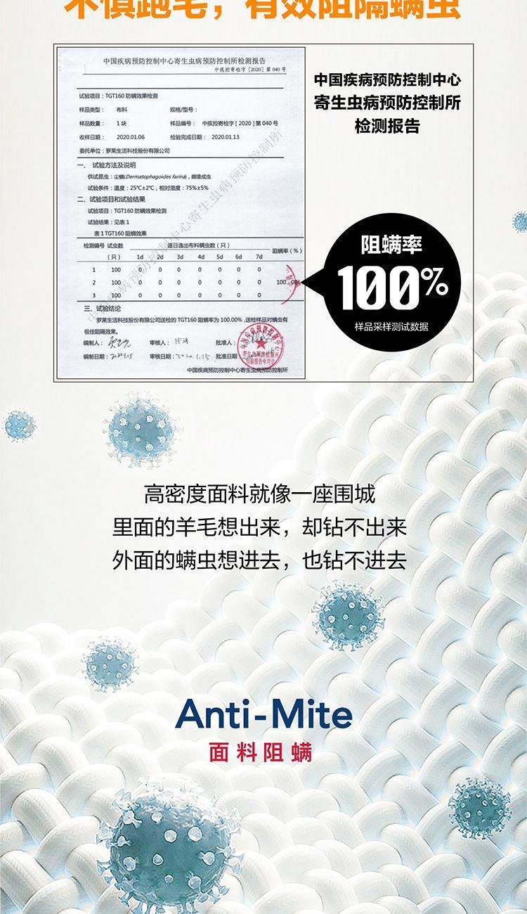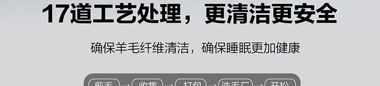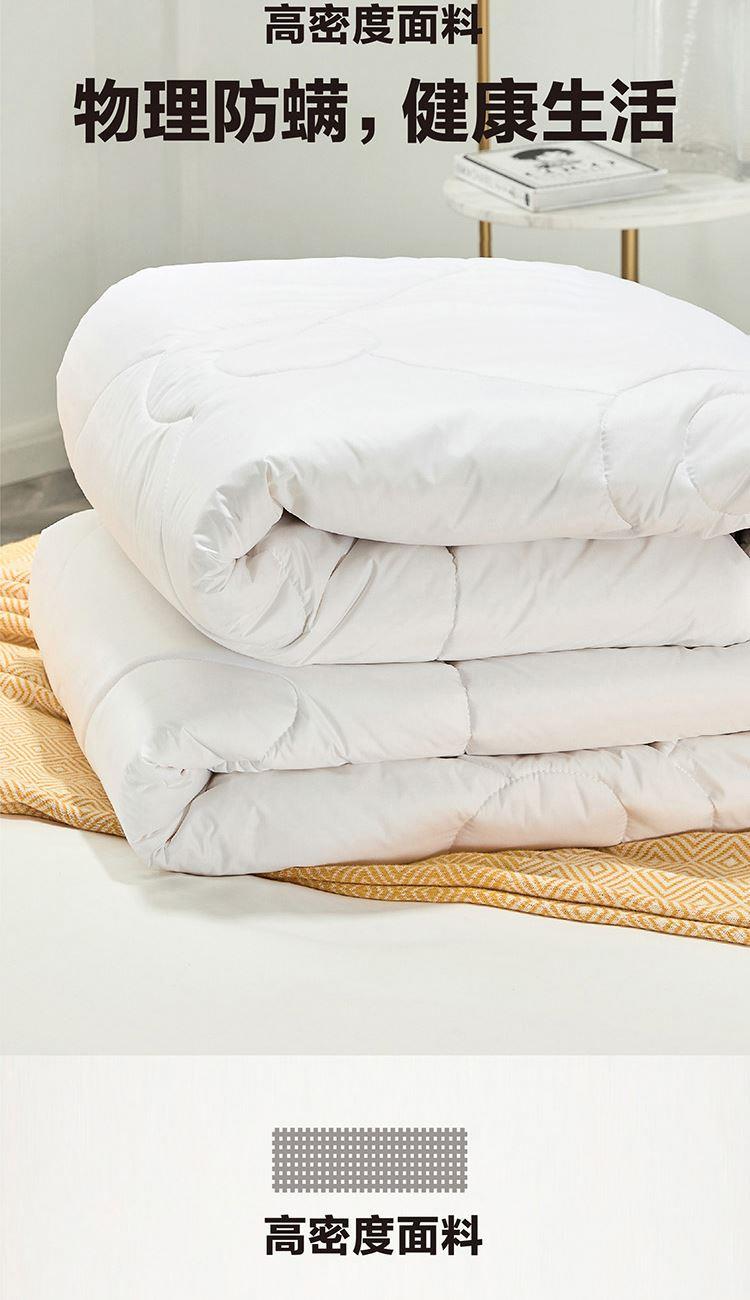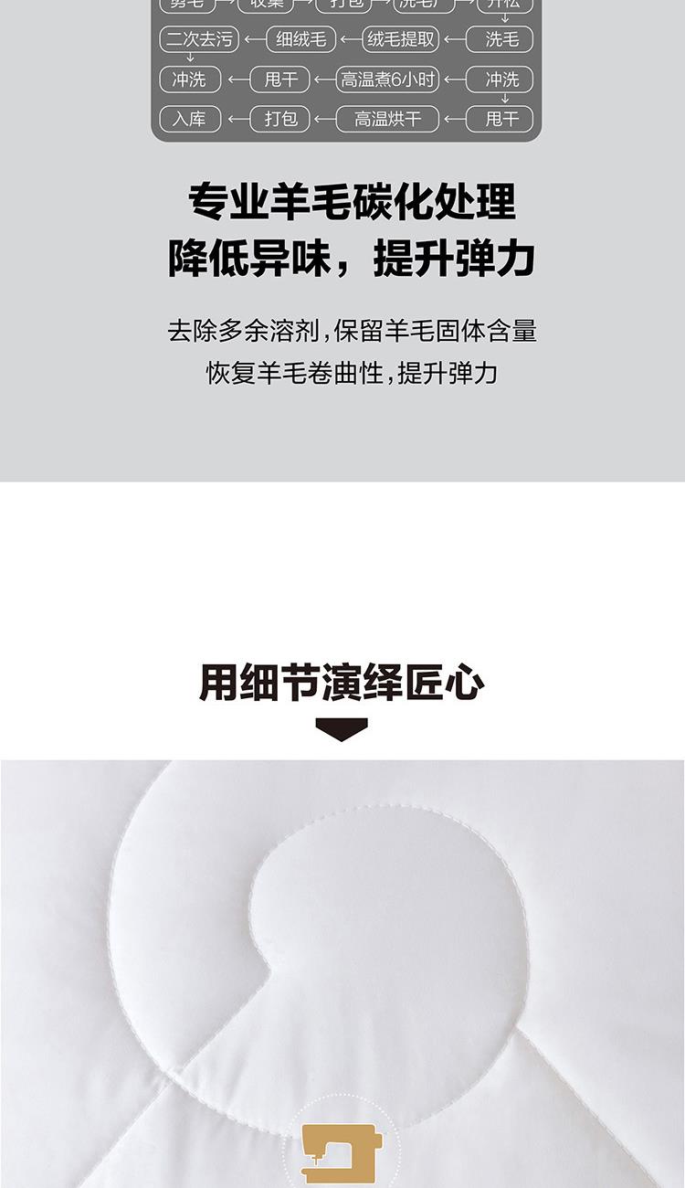 面料材质:聚酯纤维(防螨) 填充材质:羊毛(产地澳大利亚) 规格尺寸:200*230cm 填充重量:2500g 外箱尺寸: 55*65*120cm 采用高密度磨毛防羽面料,微米级物理防螨,柔暖顺滑,大大降低被子的摩擦声,防止羊毛从缝隙间钻出,享洁净睡眠; 填充物精选澳大利亚羊毛填充,澳毛是国际公认的高质羊毛,羊毛的长度,白度以及重量、柔软度、强度、耐用性和外观持久性方面均较为出色,毛质柔软细腻,吸湿能力强,恒温保暖,天然回弹性佳; 高达2500克填充,蓬松厚实,保暖舒适。