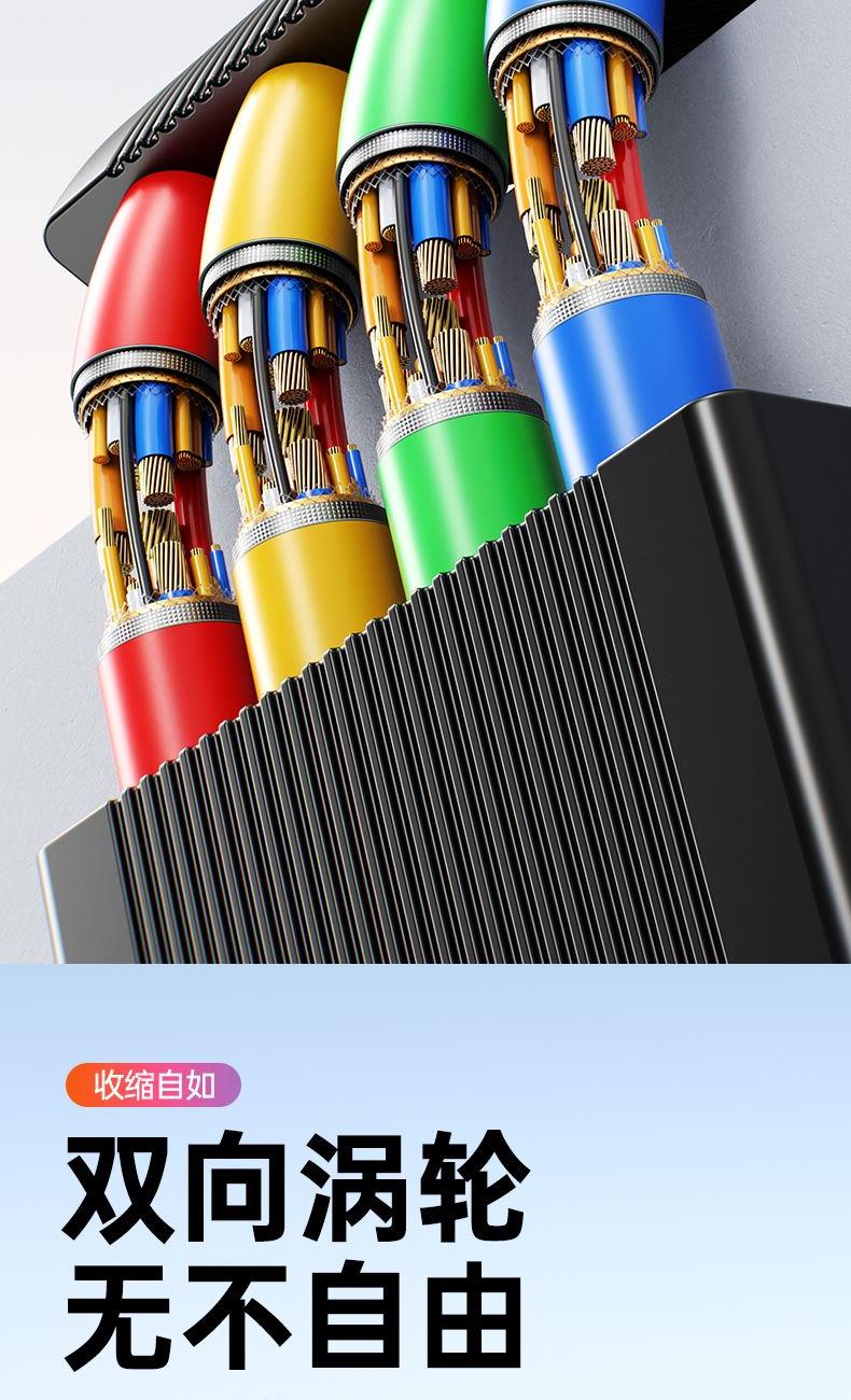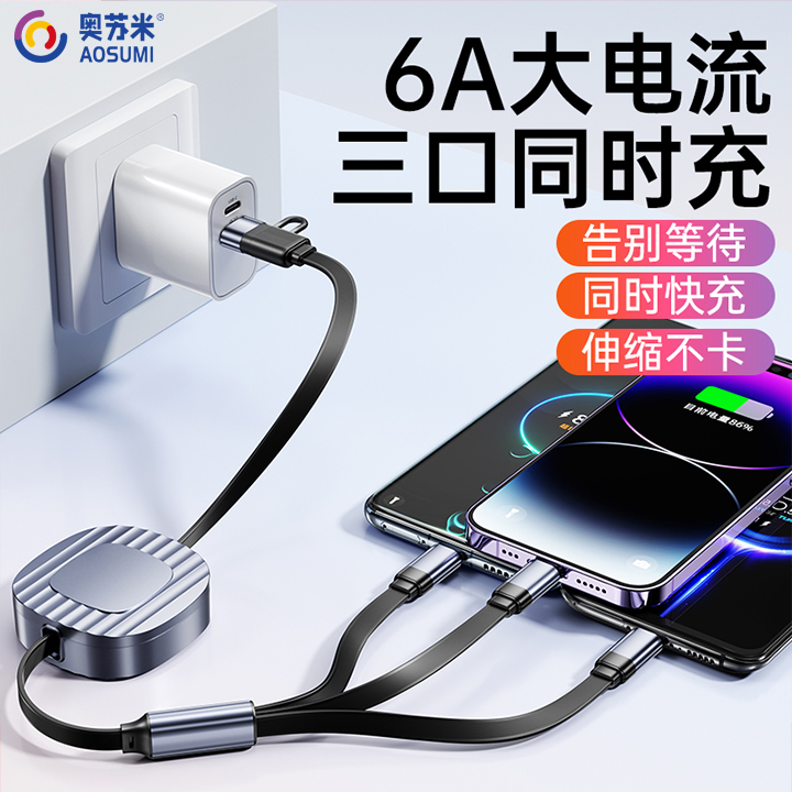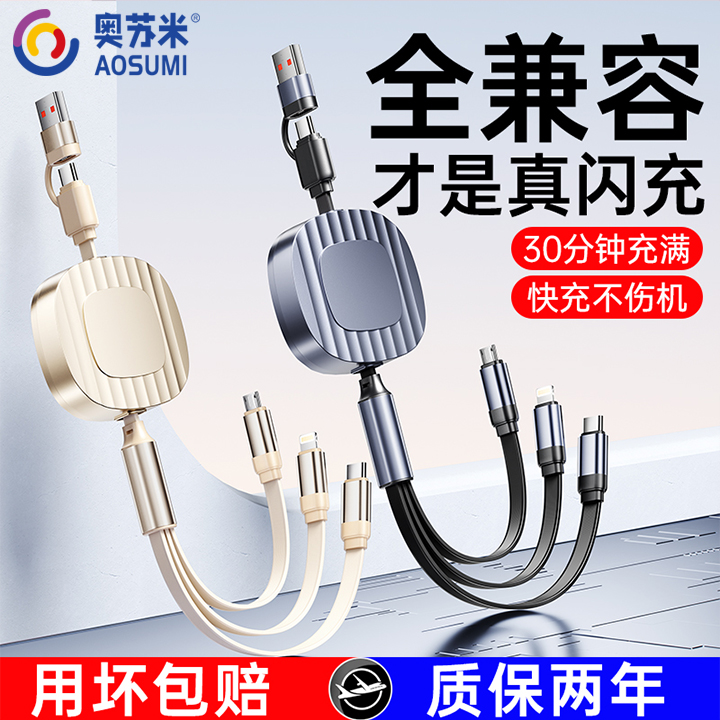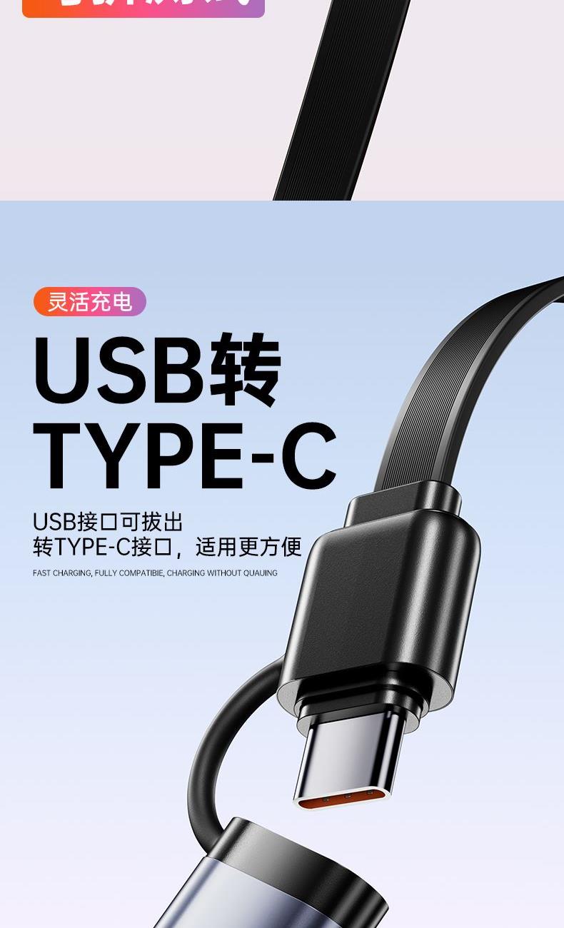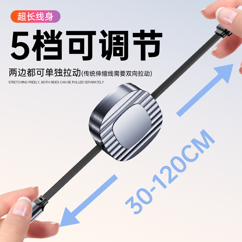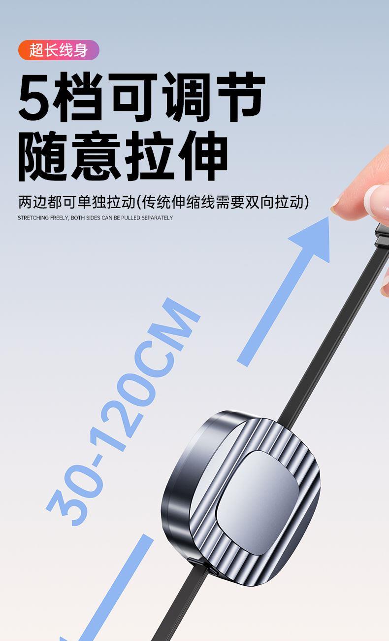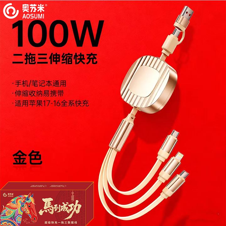S15清雅100W快充伸缩数据线 颜色:金色 灰色 材质:TPE+ABS 尺寸:1.2M 包装:彩盒包装 【功能特点】: 二拖三伸缩设计,兼容苹果15系列 100W超级快充,充电更快 三种接口满足各种手机 1.2米长度设计,使用方便 TPE材质耐用,商务ABS面盖 五档伸缩调节 可充笔记本电脑